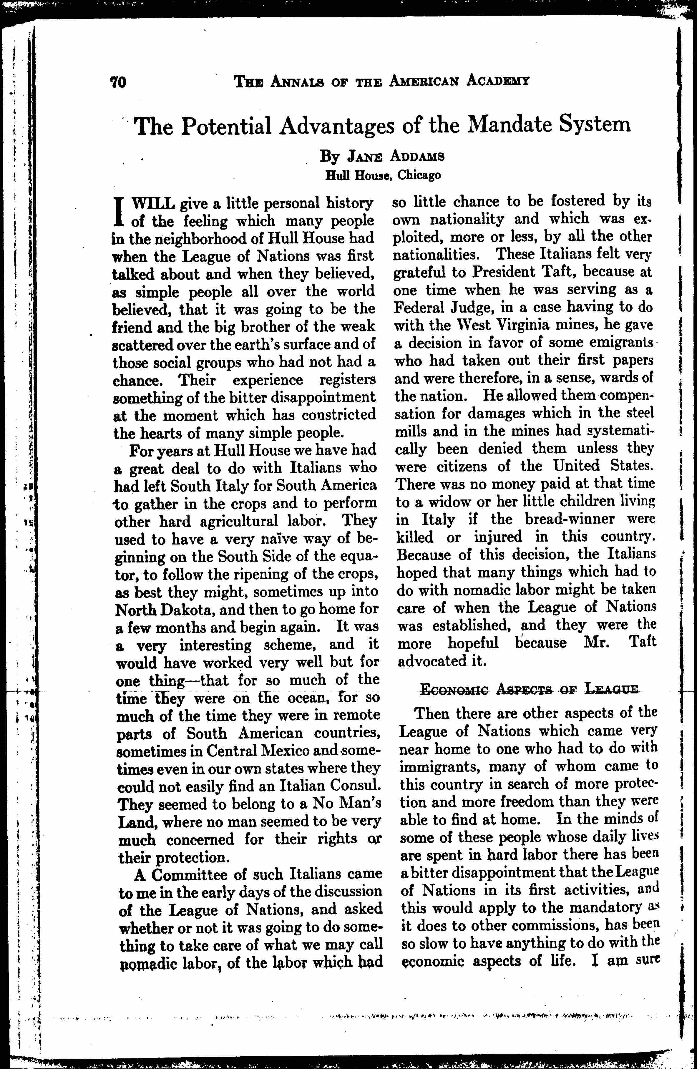 Then there are other aspects of the League of Nations which came very near home to one who had to do with immigrants, many of whom came to this country in search of more protection and more freedom than they were able to find at home. In the minds of some of these people whose daily lives are spent in hard labor there has been a bitter disappointment that the League of Nations in its first activities, and this would apply to the mandatory as it does to other commissions, has been so slow to have anything to do with the economic aspects of life. I am sure [page 2] that many people must feel that the nation which ignores the economic resources of a country that is handed over to it under the mandatory provisions for protection and care, in a certain way begs the whole question. It is like being moral according to an old-fashioned test but refusing to measure up to the current test of the moment, to the test which after all determines whether or not one is moral contemporaneously. A nation may be content to apply a standard which was very good when colonial government had to do merely with political relations and had not yet openly acknowledged that it was also dealing with economic relations.