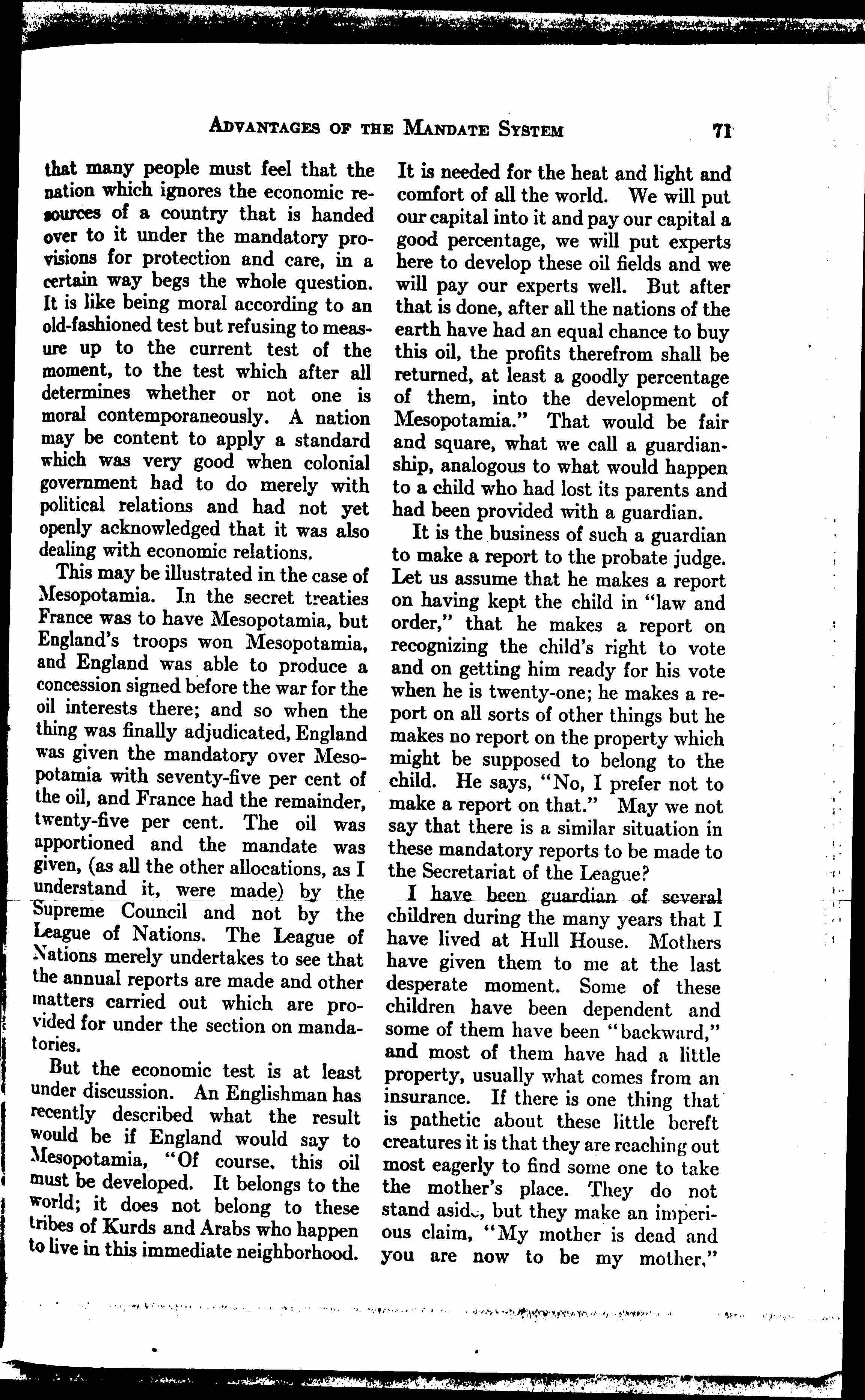 This may be illustrated in the case of Mesopotamia. In the secret treaties France was to have Mesopotamia, but England's troops won Mesopotamia, and England was able to produce a concession signed before the war for the oil interests there; and so when the thing was finally adjudicated, England was given the mandatory over Mesopotamia with seventy-five [percent] of the oil, and France had the remainder, twenty-five [percent]. The oil was apportioned and the mandate was given, (as all the other allocations, as I understand it, were made) by the Supreme Council and not by the League of Nations. The League of Nations merely undertakes to see that the annual reports are made and other matters carried out which are provided for under the section on mandates.