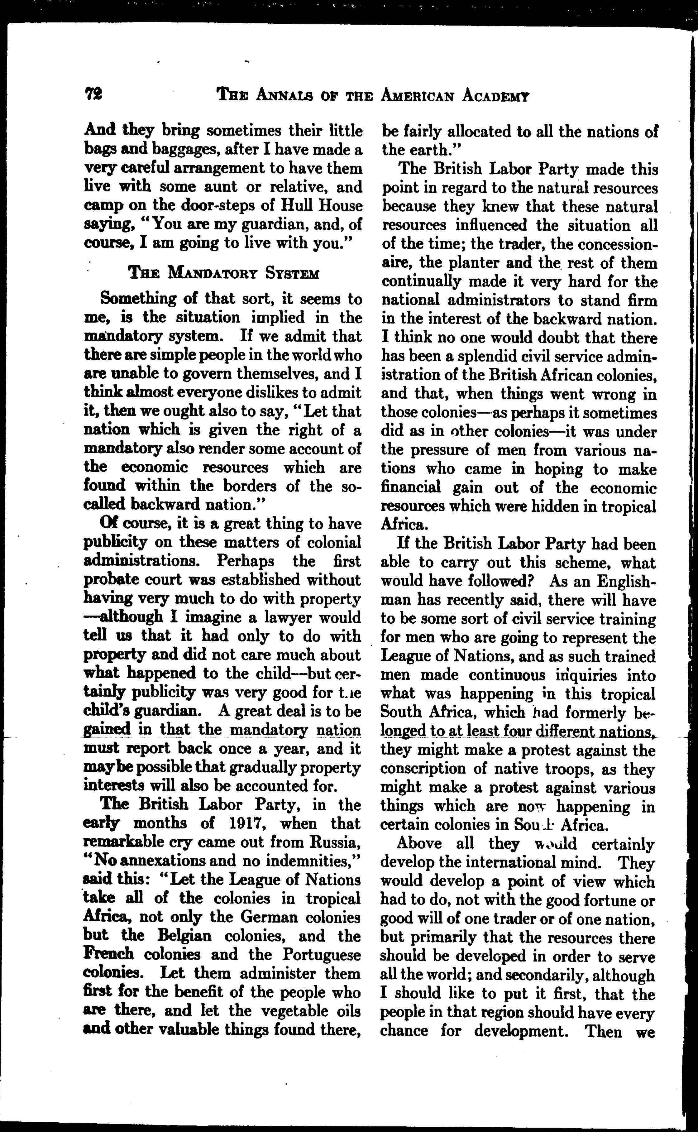 Above all they would certainly develop the international mind. They would develop a point of view which had to do, not with the good fortune or good will of one trader or of one nation, but primarily that the resources there should be developed in order to serve all the world; and secondarily, although I should like to put it first, that the people in that region should have every chance for development. Then we [page 4] would have a probate court growing out of the mandatory system of the League of Nations, a probate court that had to do with all the aspects of a backward child, if we are pleased to call him that. After all, any guardian who should come into court and say, "I was interested, of course, in taking care of the child, but I was also interested in lining my own pockets," would, I think, be thrown out of court, even the most corrupt one.