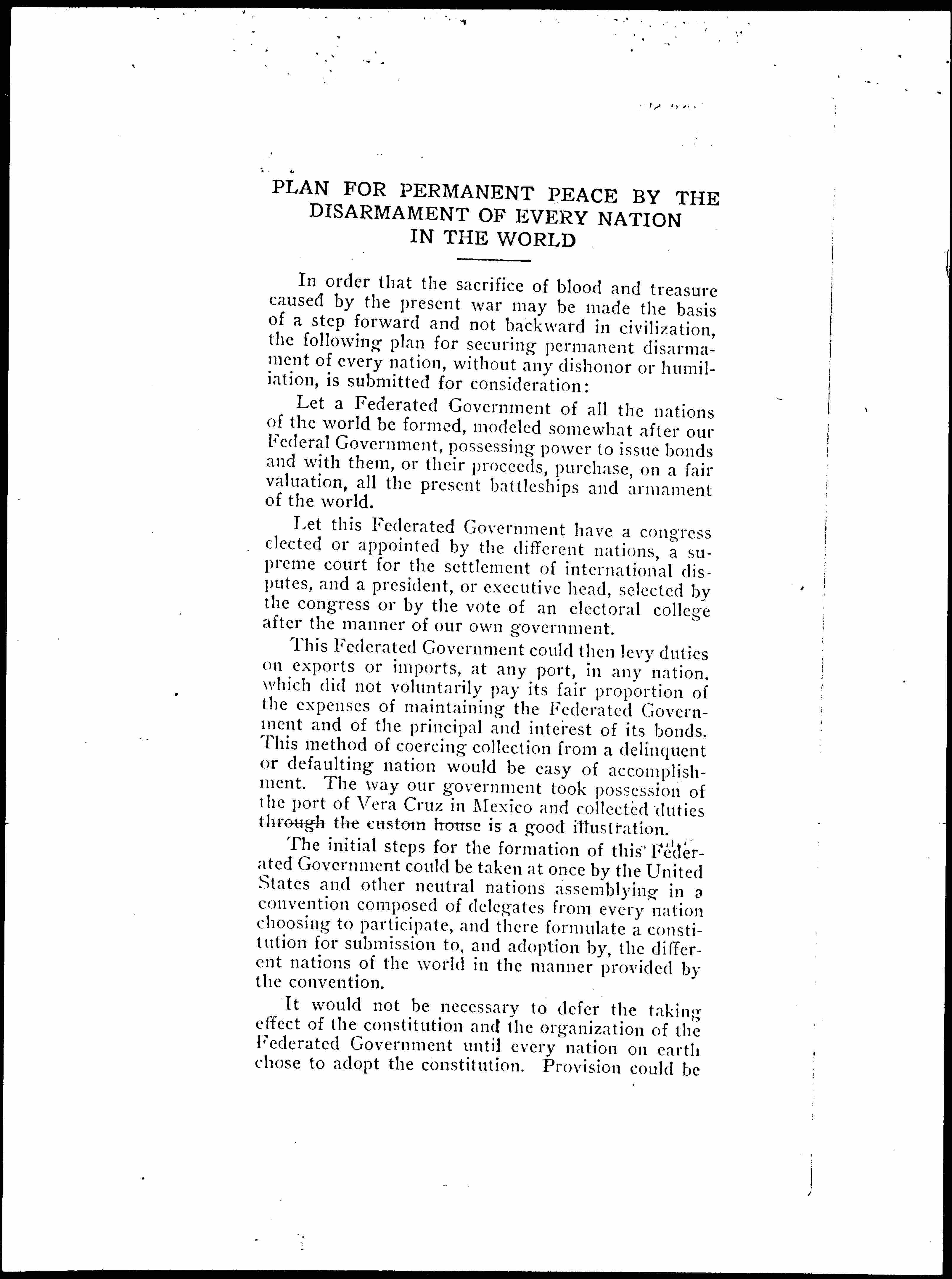 In order that the sacrifice of blood and treasure caused by the present war may be made the basis of a step forward and not backward in civilization, the following plan for securing permanent disarmament of every nation, without any dishonor or humiliation, is submitted for consideration:
