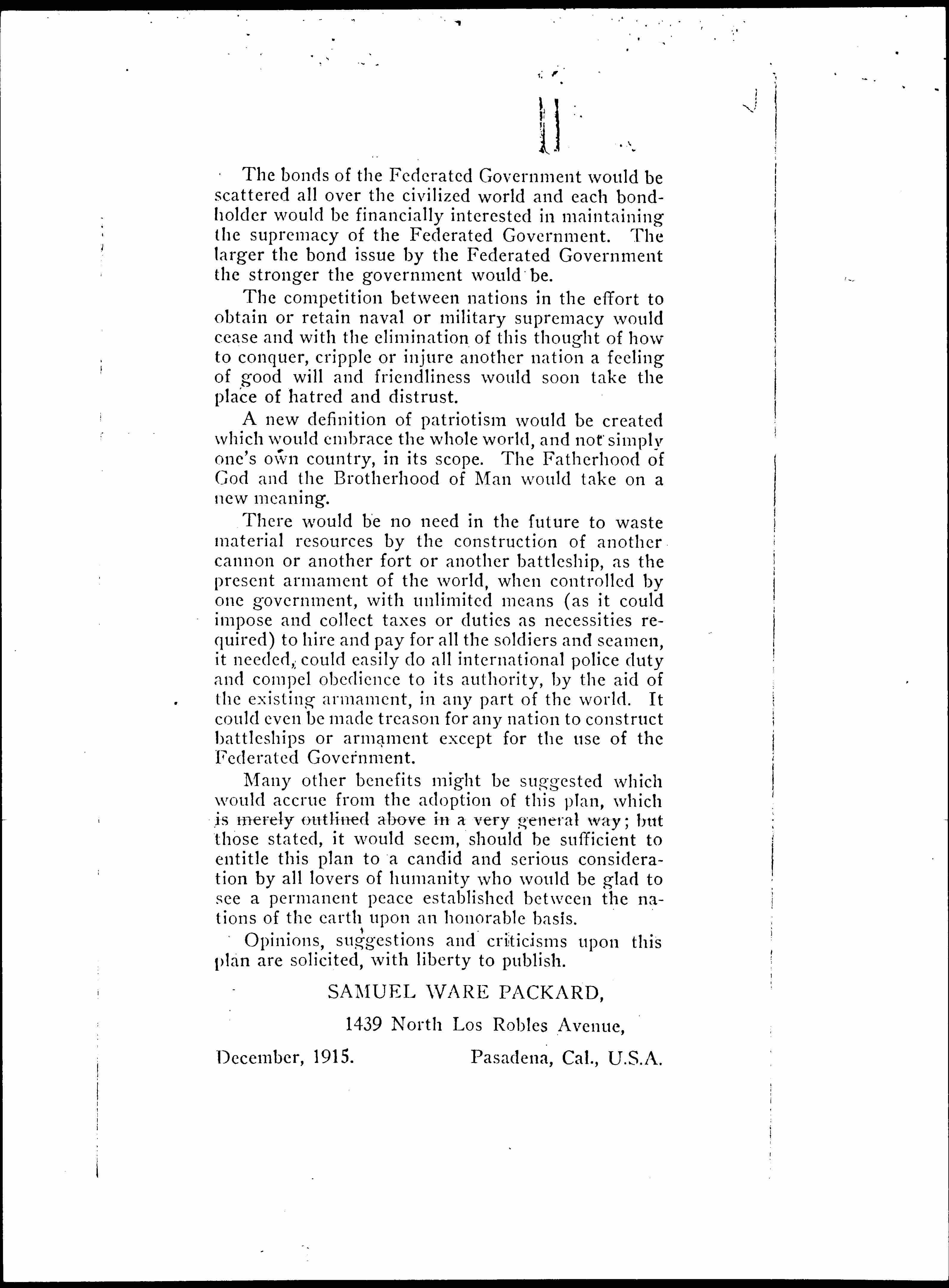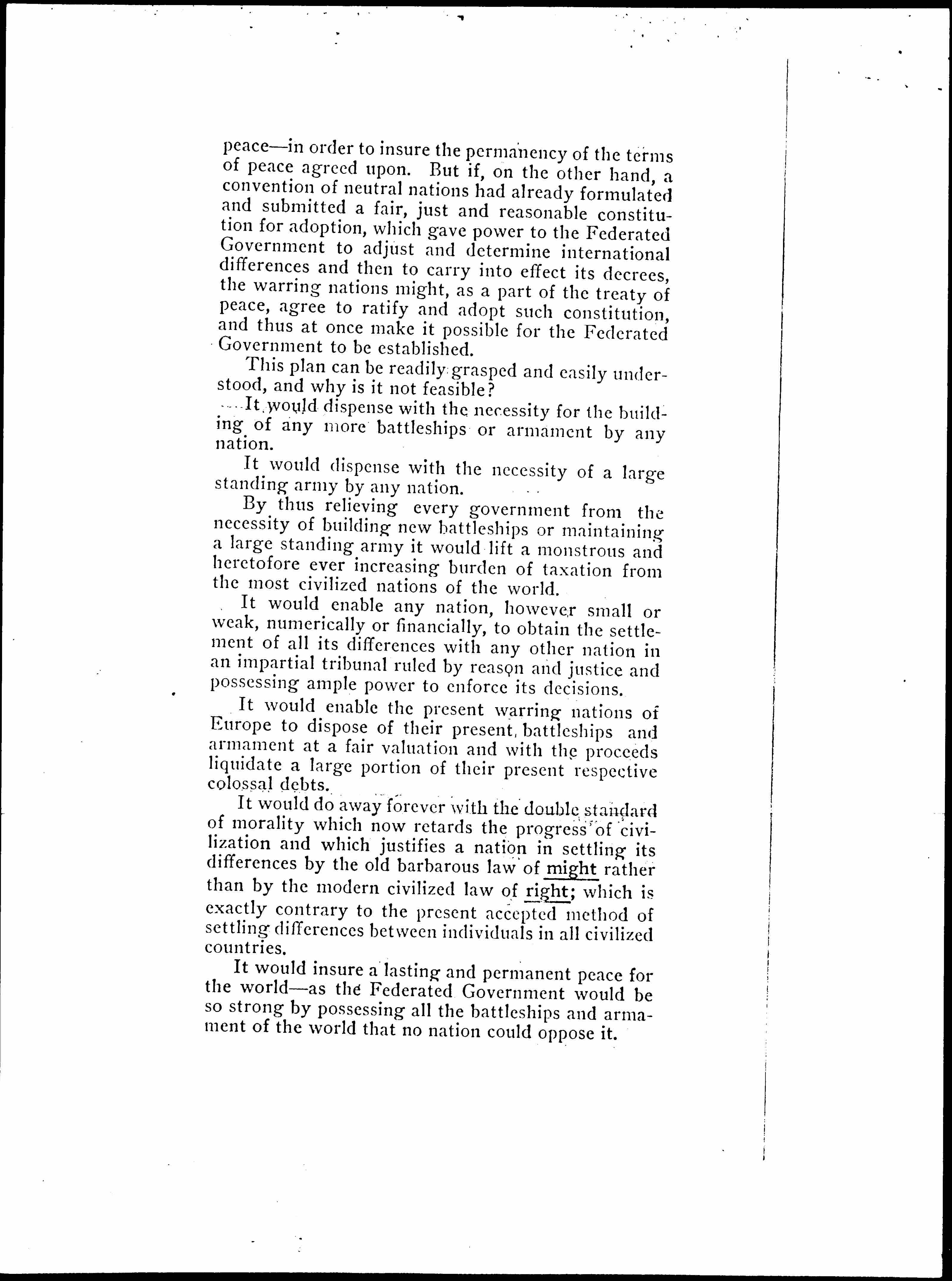 It would insure a lasting and permanent peace for the world -- as the Federated Government would be so strong by possessing all the battleships and armament of the world that no nation could oppose it. [page 4]