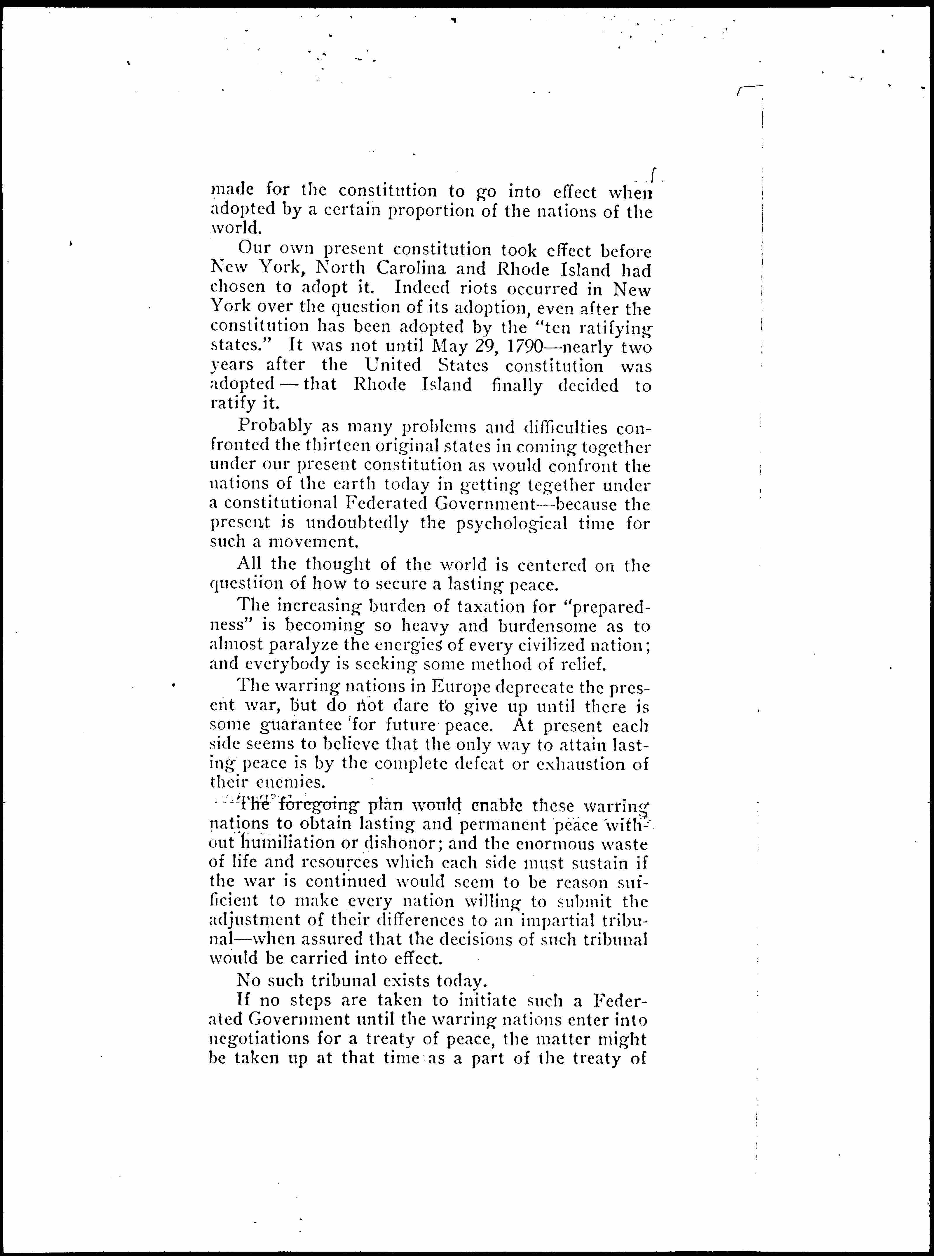 If no steps are taken to initiate such a Federated Government until the warring nations enter into negotiations for a treaty of peace, the matter might be taken up at that time as a part of the treaty of [page 3] peace -- in order to insure the permanency of the terms of peace agreed upon. But if, on the other hand, a convention of neutral nations had already formulated and submitted a fair, just and reasonable constitution for adoption, which gave power to the Federated Government to adjust and determine international differences and then to carry into effect its decrees, the warring nations might, as a part of the treaty of peace, agree to ratify and adopt such constitution, and thus at once make it possible for the Federated Government to be established.
