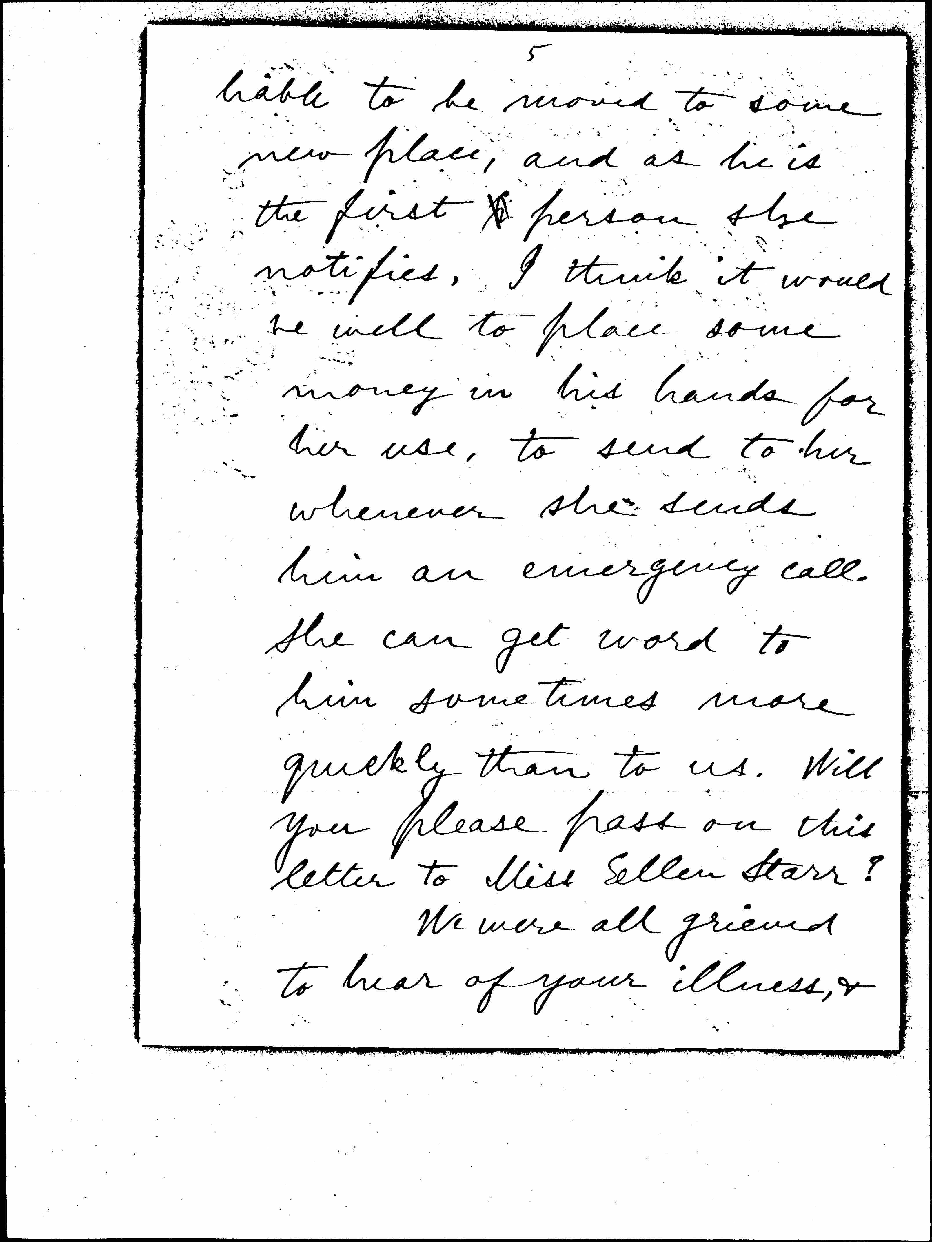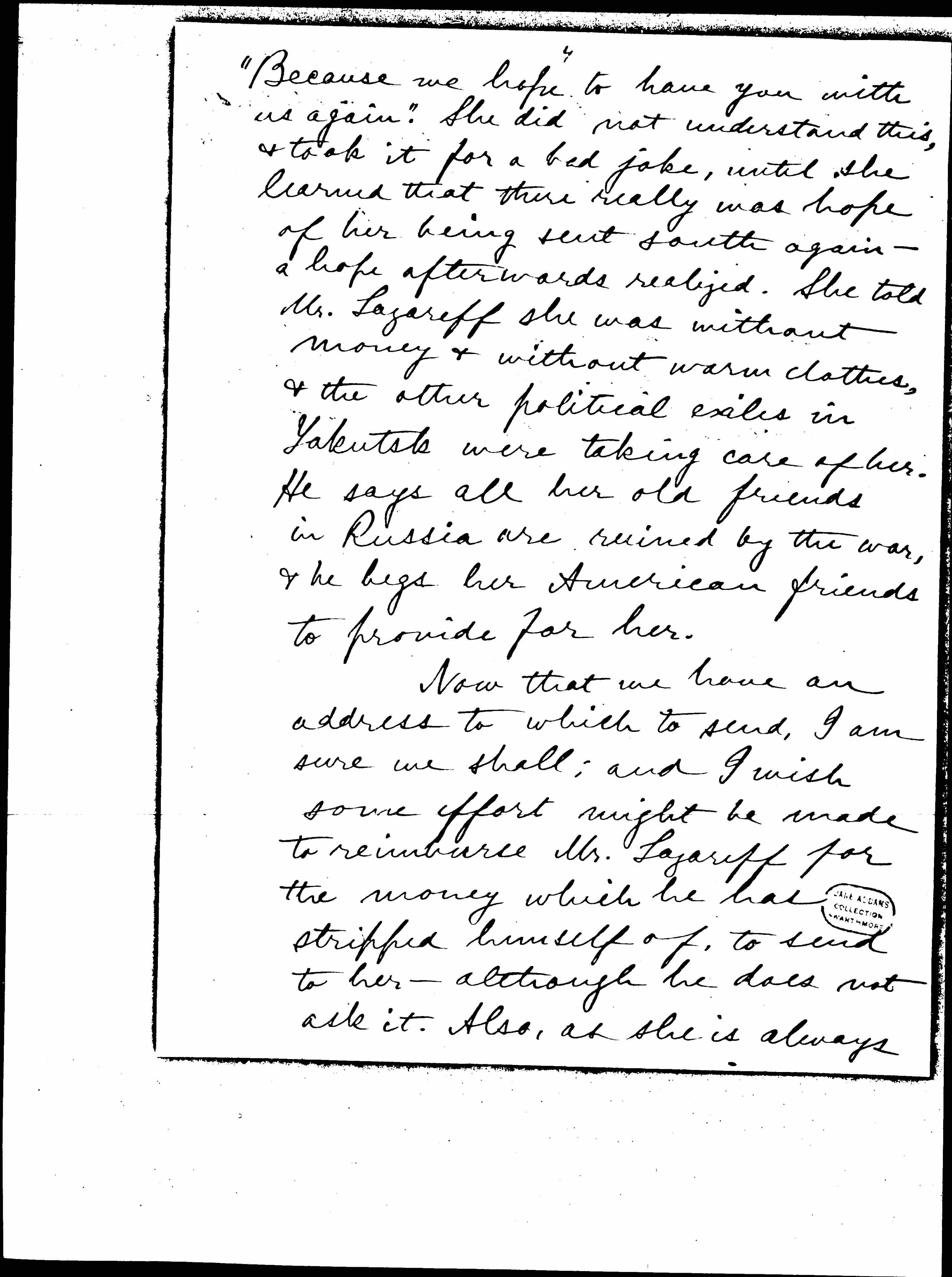 Now that we have an address to which to send, I am sure we shall; and I wish some effort might be made to reimburse Mr. Lazareff for the money which he has stripped himself of, to send to her -- although he does not ask it. Also, as she is always [page 5] liable to be moved to some new place, and as he is the first person she notifies, I think it would be well to place some money in his hands for her use, to send to her whenever she sends him an emergency call. She can get word to him sometimes more quickly than to us. Will you please pass on this letter to Miss Ellen Starr?