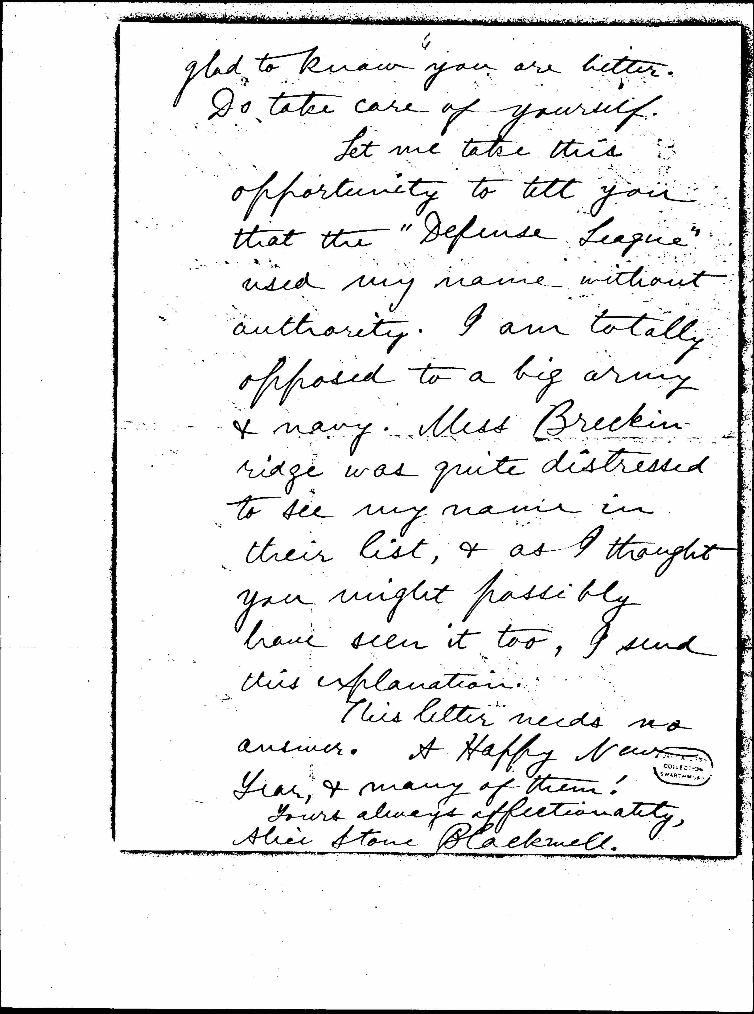 Let me take this opportunity to tell you that the "Defense League" used my name without authority. I am totally opposed to a big army & navy. Miss Breckinridge was quite distressed to see my name in their list, & as I thought you might possibly have seen it too, I send this explanation.