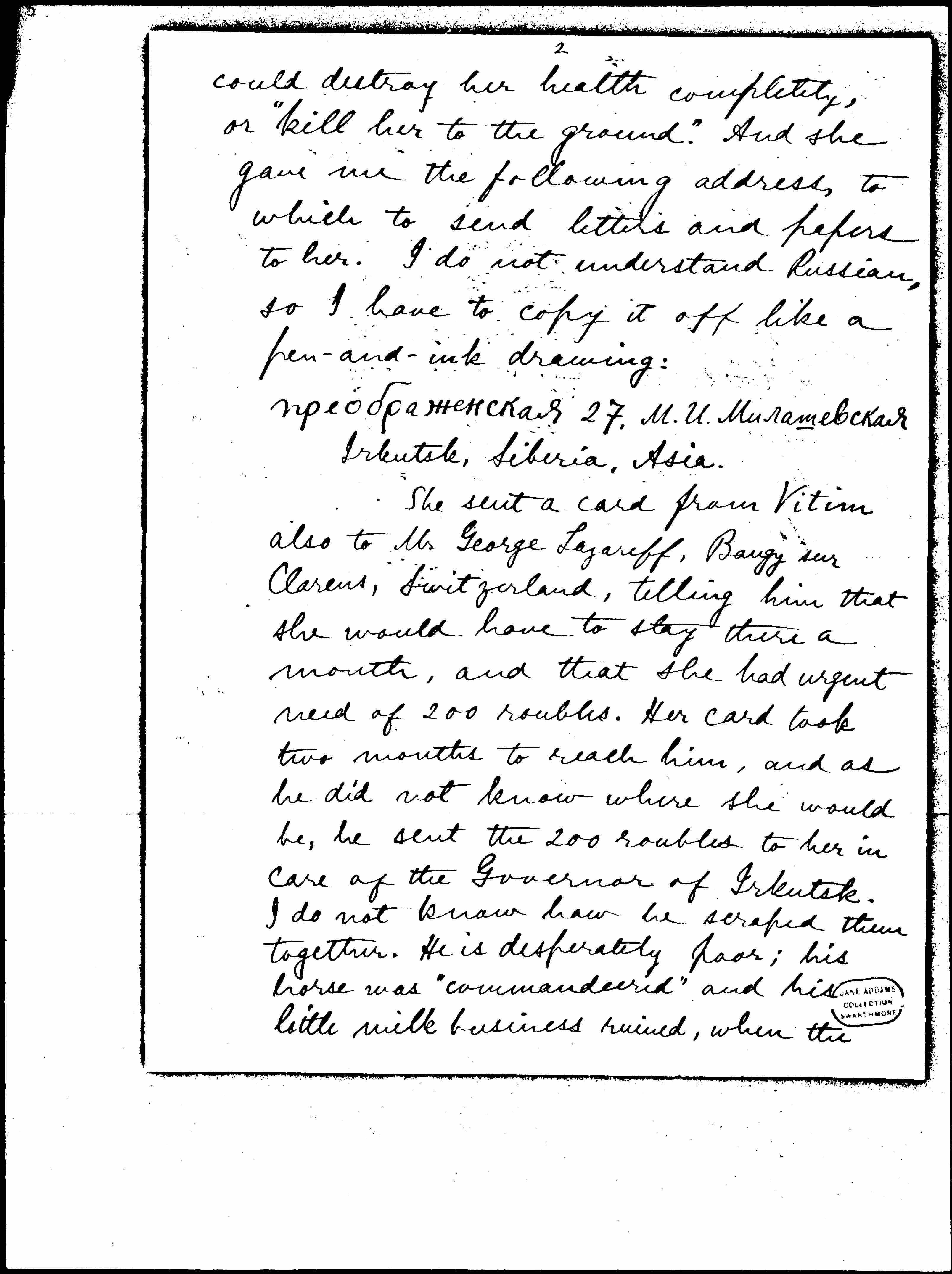 She sent a card from Vitim also to Mr George Lazareff, Baugy sur Clarens, Switzerland, telling him that she would have to stay there a month, and that she had urgent need of 200 [rubles]. Her card took two months to reach him, and as he did not know where she would be, he sent the 200 [rubles] to her in care of the Governor of Irkutsk. I do not know how he scraped them together. He is desperately poor; his horse was "commandeered" and his little milk business ruined, when the [page 3] Swiss forced forces were mobilized; & he has hardly been able to live since. But I know he would mortgage himself to the eyebrows to help her.