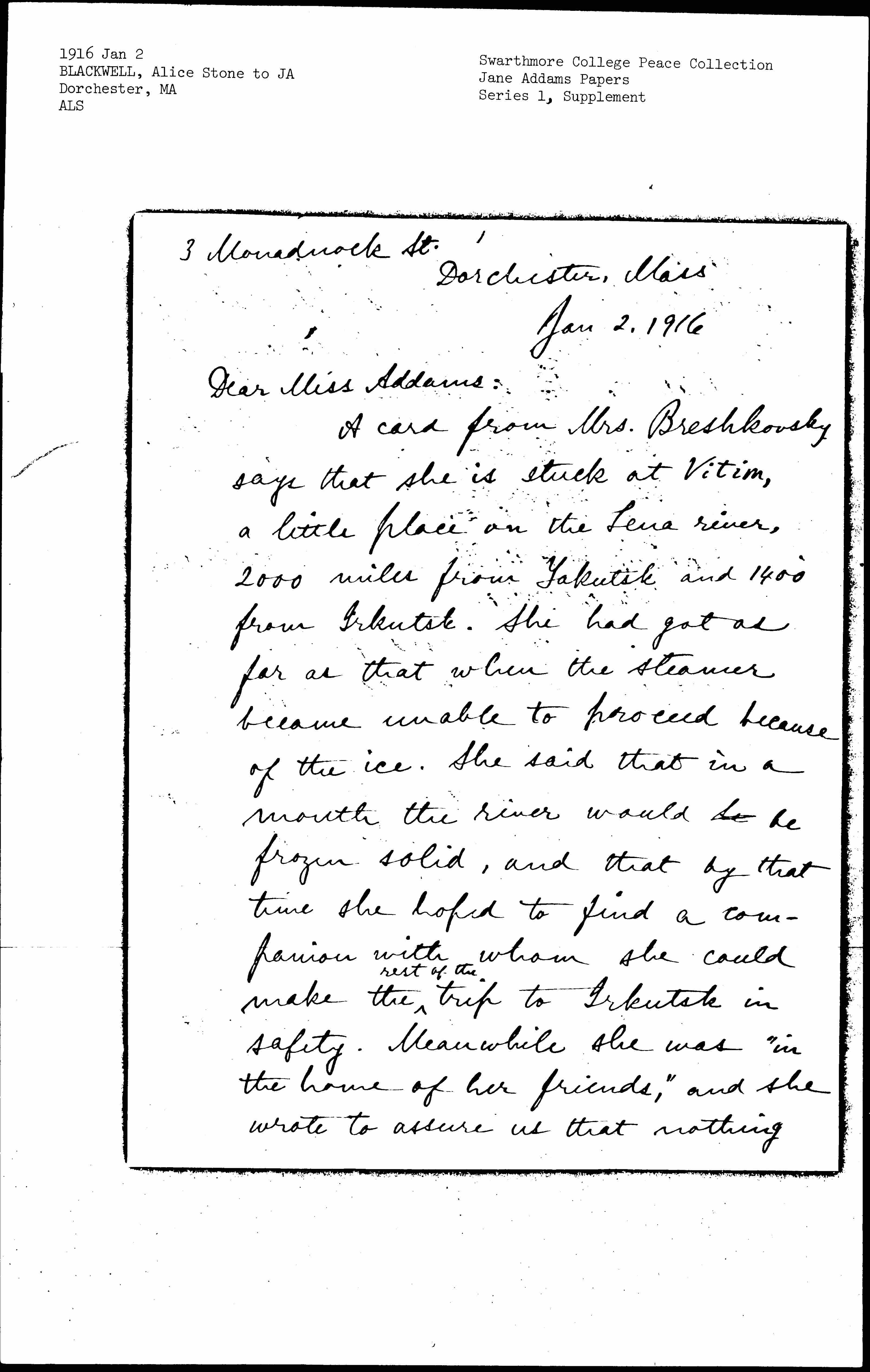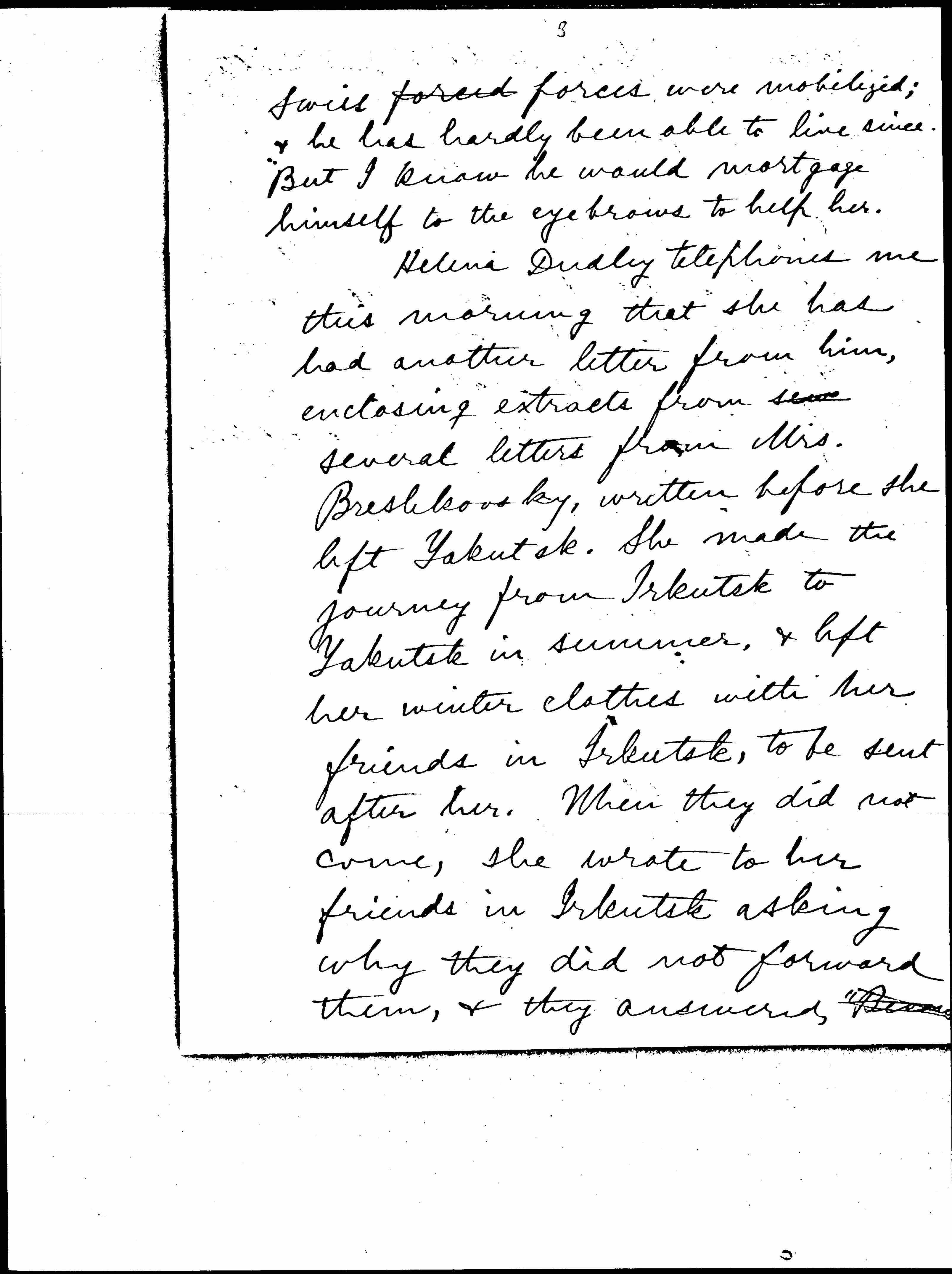 Helena Dudley telephones me this morning that she has had another letter from him, enclosing extracts from several letters from Mrs. Breshkovsky, written before she left Yakutsk. She made the journey from Irkutsk to Yakutsk in summer, & left her winter clothes with her friends in Irkutsk, to be sent after her. When they did not come, she wrote to her friends in Irkutsk asking why they did not forward them, and they answered, "Because [page 4] "Because we hope to have you with us again." She did not understand this, & took it for a bad joke, until she learned that there really was hope of her being sent south again -- a hope afterwards realized. She told Mr. Lazareff she was without money & without warm clothes, & the other political exiles in Yakutsk were taking care of her. He says all her old friends in Russia are ruined by the war, & he begs her American friends to provide for her.