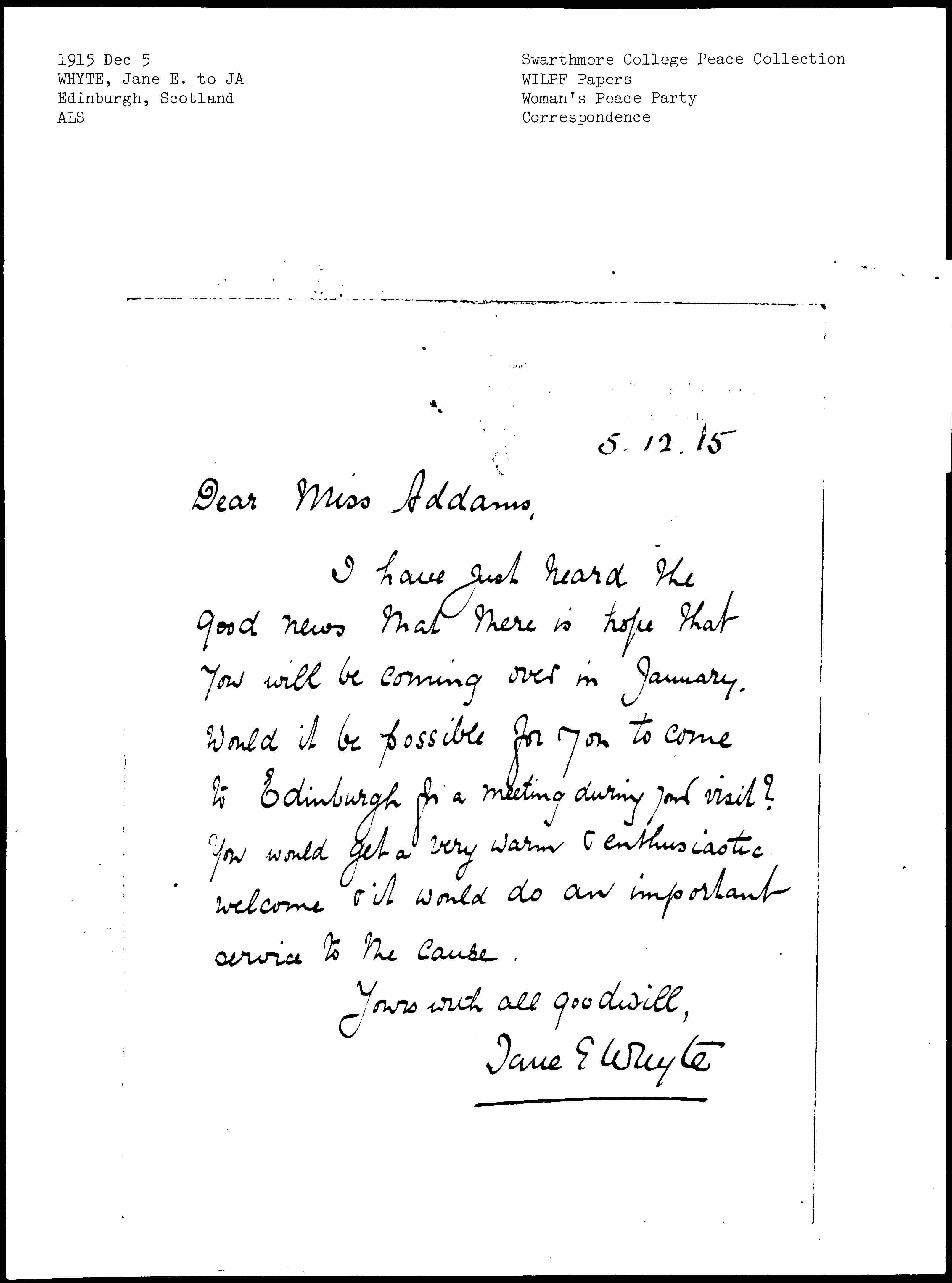 I have just heard the good news that there is hope that you will be coming over in January. Would it be possible for you to come to Edinburgh for a meeting during your visit? You would get a very warm & enthusiastic welcome & it would do an important service to the cause.