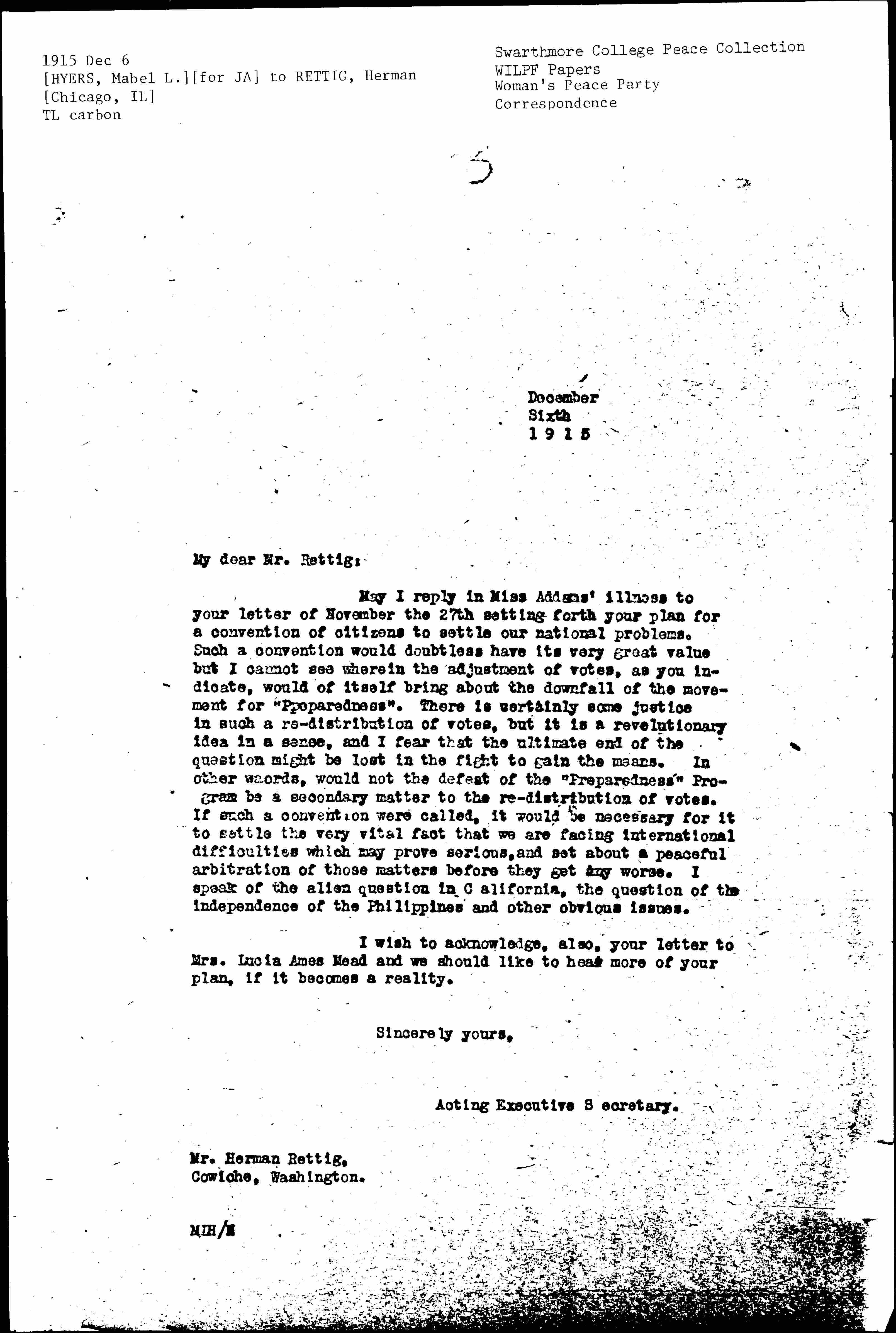 May I reply in Miss Addams' illness to your letter of November the 27th setting forth your plan for a convention of citizens to settle our national problems. Such a convention would doubtless have its very great value but I cannot see wherein the adjustment of votes, as you indicate, would of itself bring about the downfall of the movement for "Preparedness". There is certainly some justice in such a [redistribution] of votes, but it is a revolutionary idea in a sense, and I fear that the ultimate end of the question might be lost in the fight to gain the means. In other words, would not the defeat of the "Preparedness" Program be a secondary matter to the [redistribution] of votes. If such a convention were called, it would be necessary for it to settle the very vital fact that we are facing international difficulties which may prove serious, and set about a peaceful arbitration of those matters before they get any worse. I speak of the alien question in California, the question of the independence of the Philippines and other obvious issues.
