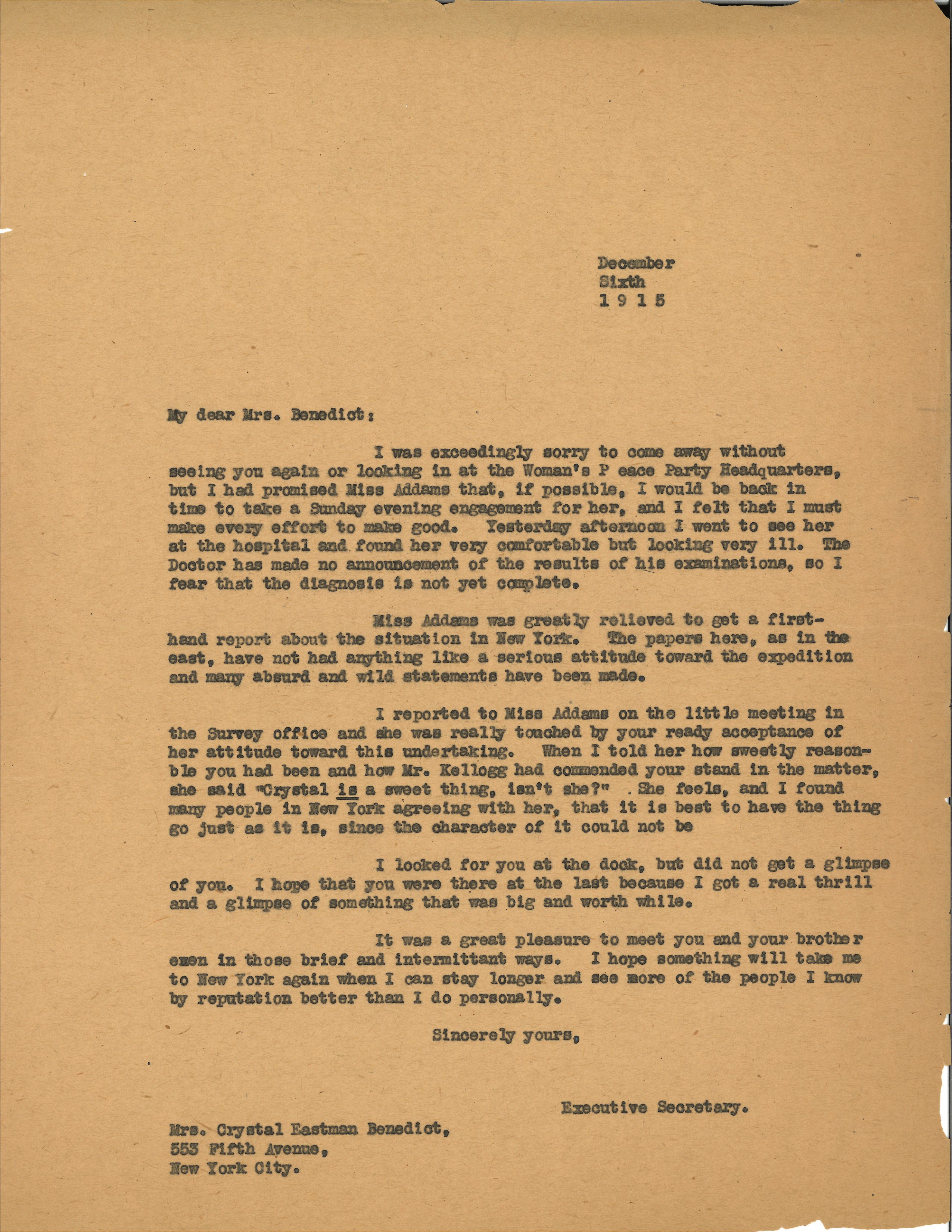 I reported to Miss Addams on the little meeting in the Survey offices and she was really touched by your ready acceptance of her attitude toward this undertaking. When I told her how sweetly reasonable you had been and how Mr. Kellogg had commended your stand in the matter, she said "Crystal is a sweet thing, isn't she?" She feels, and I found many people in New York agreeing with her, that it is best to have the thing go just as it is, since the character of it could not be.