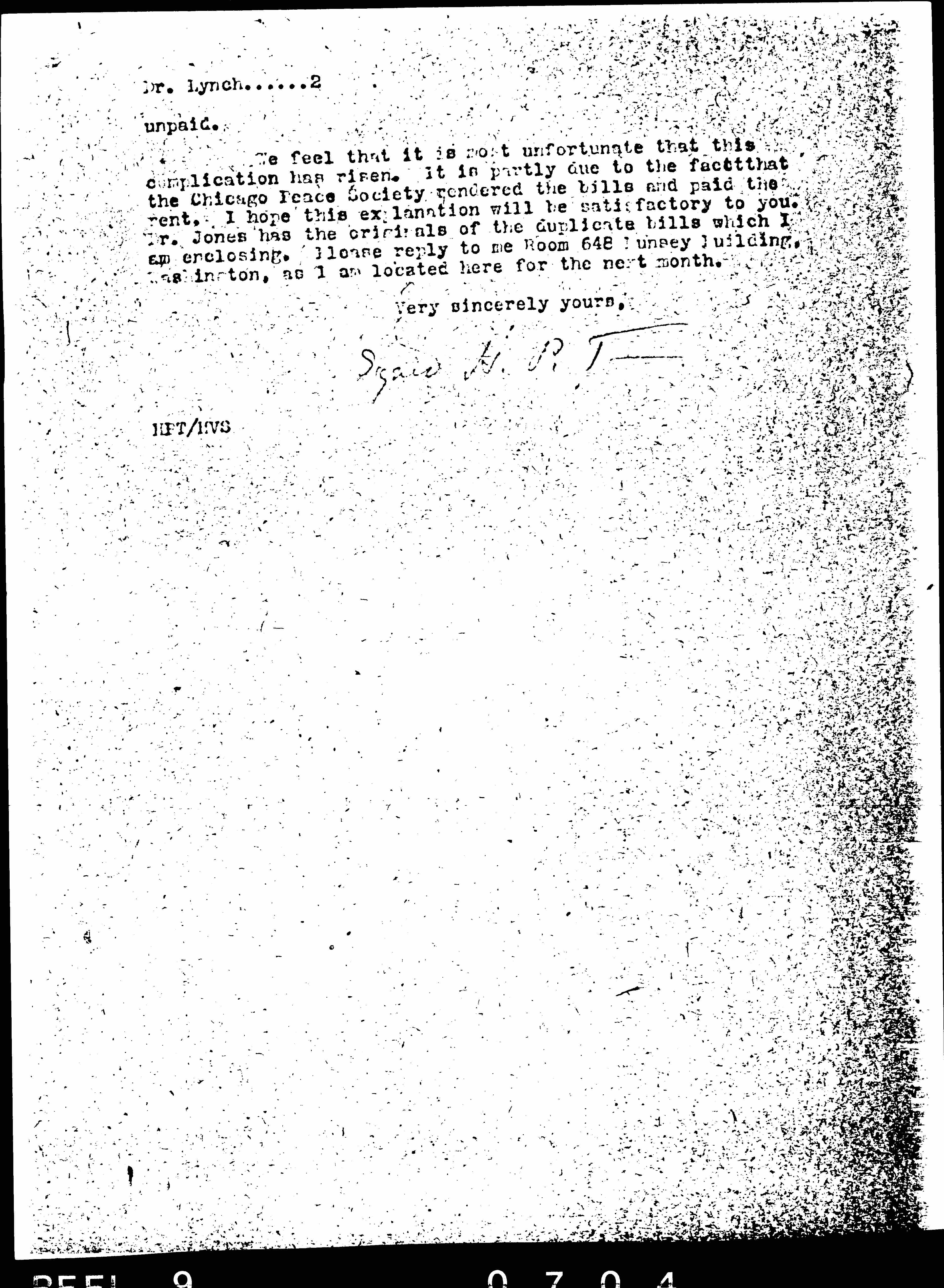 We feel that it is most unfortunate that this complication has risen. It is partly due to the fact that the Chicago Peace Society rendered the bills and paid the rent. I hope this explanation will be satisfactory to you. Dr. Jones has the originals of the duplicate bills which I am enclosing. Please reply to me Room 648 Munsey Building, Washington, as I am located here for the next month.
