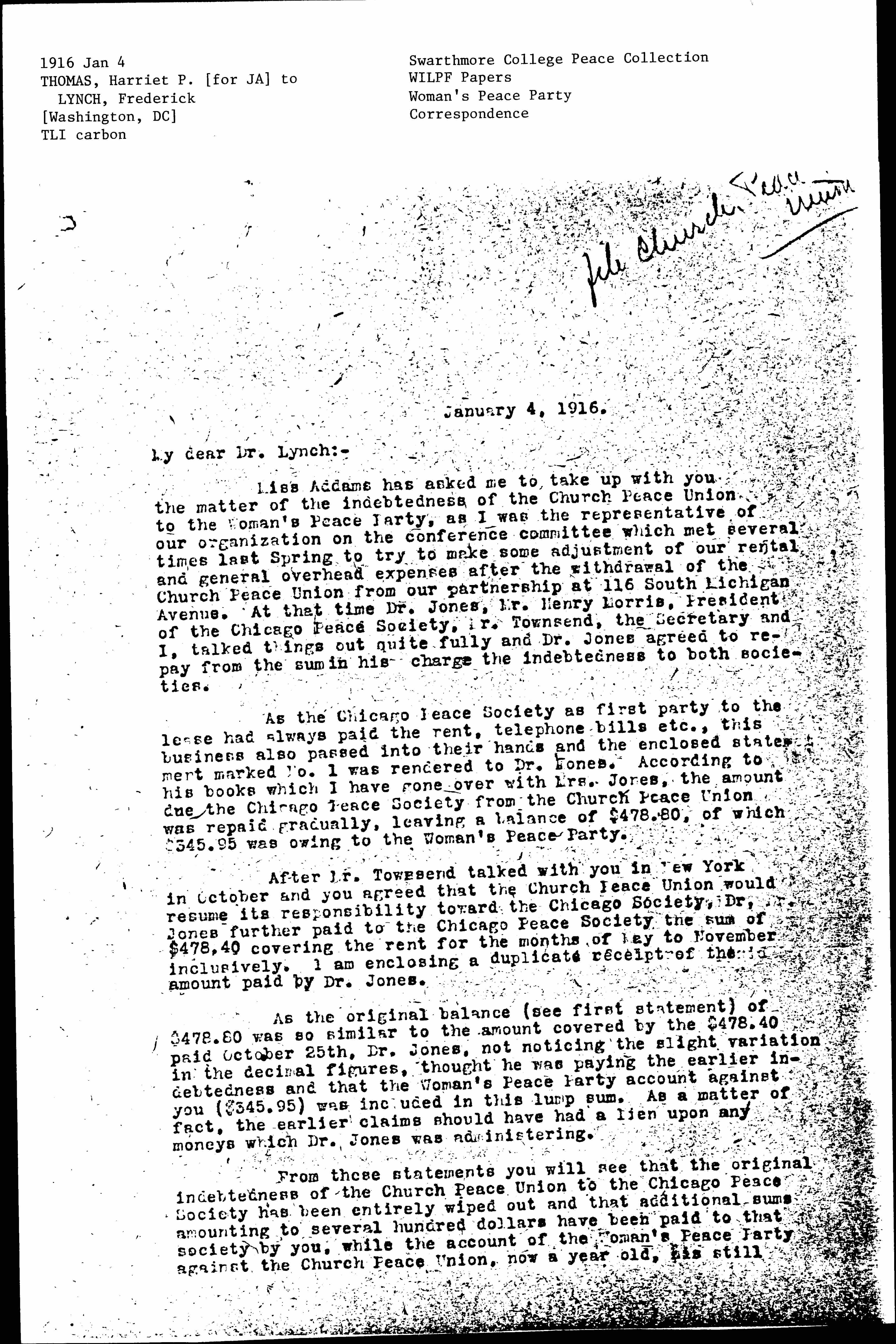 Miss Addams has asked me to take up with you the matter of the indebtedness of the Church Peace Union to the Woman's Peace Party, as I was the representative of our organization on the conference committee which met several times last Spring to try to make some adjustment of our rental and general overhead expenses after the withdrawal of the Church Peace Union from our partnership at 116 South Michigan Avenue. At that time Dr. Jones, Mr. Henry Morris, President of the Chicago Peace Society, Mr. Townsend, the Secretary and I, talked things out quite fully and Dr. Jones agreed to repay from the sum in his charge the indebtedness to both societies.