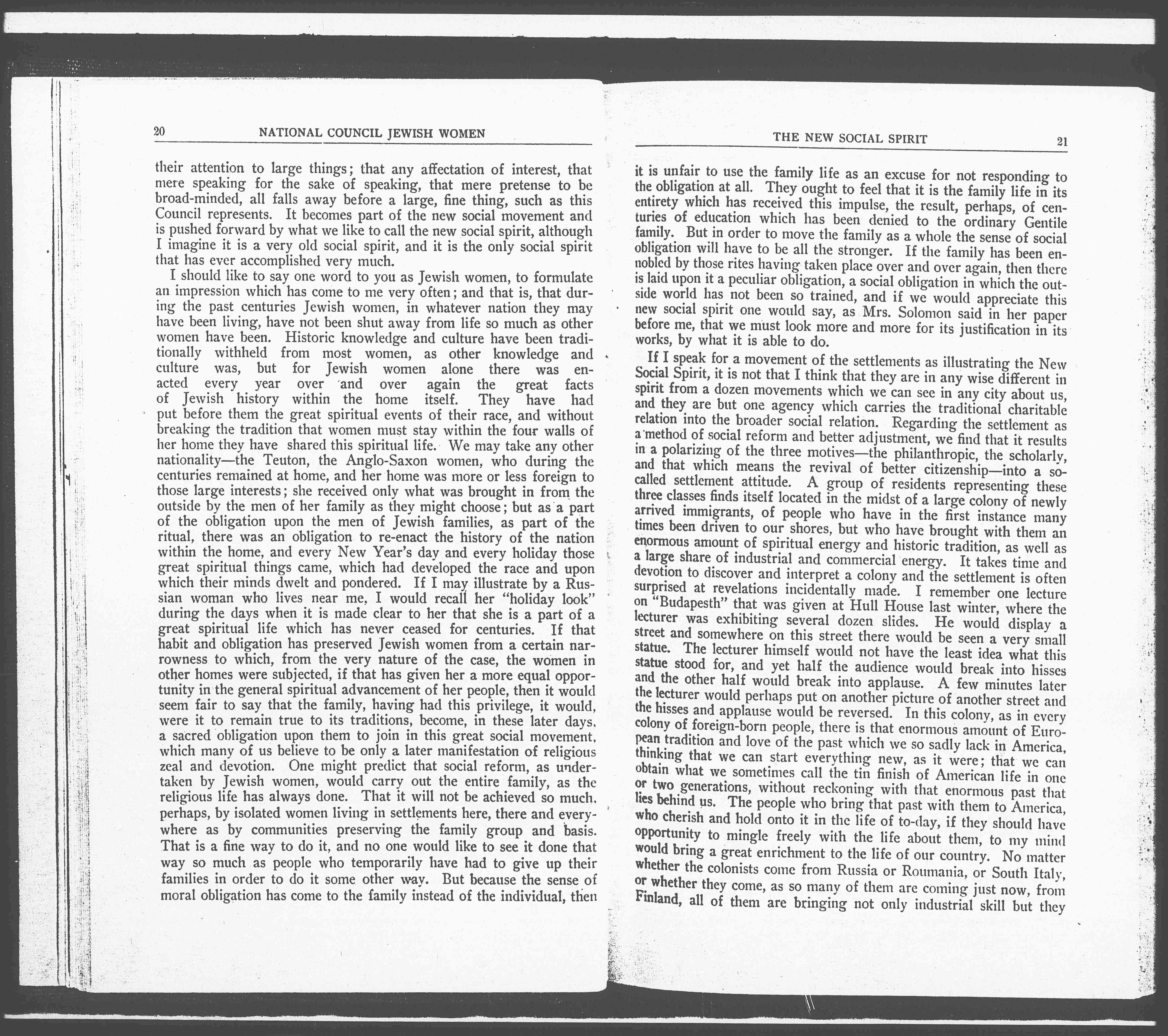 I should like to say one word to you as Jewish women, to formulate an impression which has come to me very often; and that is, that during the past centuries Jewish women, in whatever nation they may have been living, have not been shut away from life so much as other women have been. Historic knowledge and culture have been traditionally withheld from most women, as other knowledge and culture was, but for Jewish women alone there was enacted every year over and over again the great facts of Jewish history within the home itself. They have had put before them the great spiritual events of their race, and without breaking the tradition that women must stay within the four walls of her home they have shared this spiritual life. We may take any other nationality-–the Teuton, the Anglo-Saxon women, who during the centuries remained at home, and her home was more or less foreign to those large interests; she received only what was brought in from the outside by the men of her family as they might choose; but as a part of the obligation upon the men of Jewish families, as part of the ritual, there was an obligation to re-enact the history of the nation within the home, and every New Year's day and every holiday those great spiritual things came, which had developed the race and upon which their minds dwelt and pondered. If I may illustrate by a Russian woman who lives near me, I would recall her "holiday look" during the days when it is made clear to her that she is part of a great spiritual life which has never ceased for centuries. If that habit and obligation has preserved Jewish women from a certain narrowness to which, from the very nature of the case, the women in other homes were subjected, if that has given her a more equal opportunity in the general spiritual advancement of her people, then it would seem fair to say that the family, having had this privilege, it would, were it to remain true to its traditions, become, in those later days, a sacred obligation upon them to join in this great social movement, which many of us believe to be only a later manifestation of religious zeal and devotion. One might predict that social reform, as undertaken by Jewish women, would carry out the entire family, as the religious life has always done. That it will not be achieved so much, perhaps, by isolated women living in settlements here, there and everywhere as by communities preserving the family group and basis. That is a fine way to do it, and no one would like to see it done that way so much as people who temporarily have had to give up their families in order to do it some other way. But because the sense of moral obligation has come to the family instead of the individual, then [page 6] it is unfair to use the family life as an excuse for not responding to the obligation at all. They ought to feel that it is the family life in its entirety which has received this impulse, the result, perhaps, of centuries of education which has been denied to the ordinary Gentile family. But in order to move the family as a whole the sense of social obligation will have to be all the stronger. If the family has been ennobled by those rites having taken place over and over again, then there is laid upon it a peculiar obligation, a social obligation in which the outside world has not been so trained, and if we would appreciate this new social spirit one would say, as Mrs. Solomon said in her paper before me, that we must look more and more for its justification in its works, by what it is able to do.