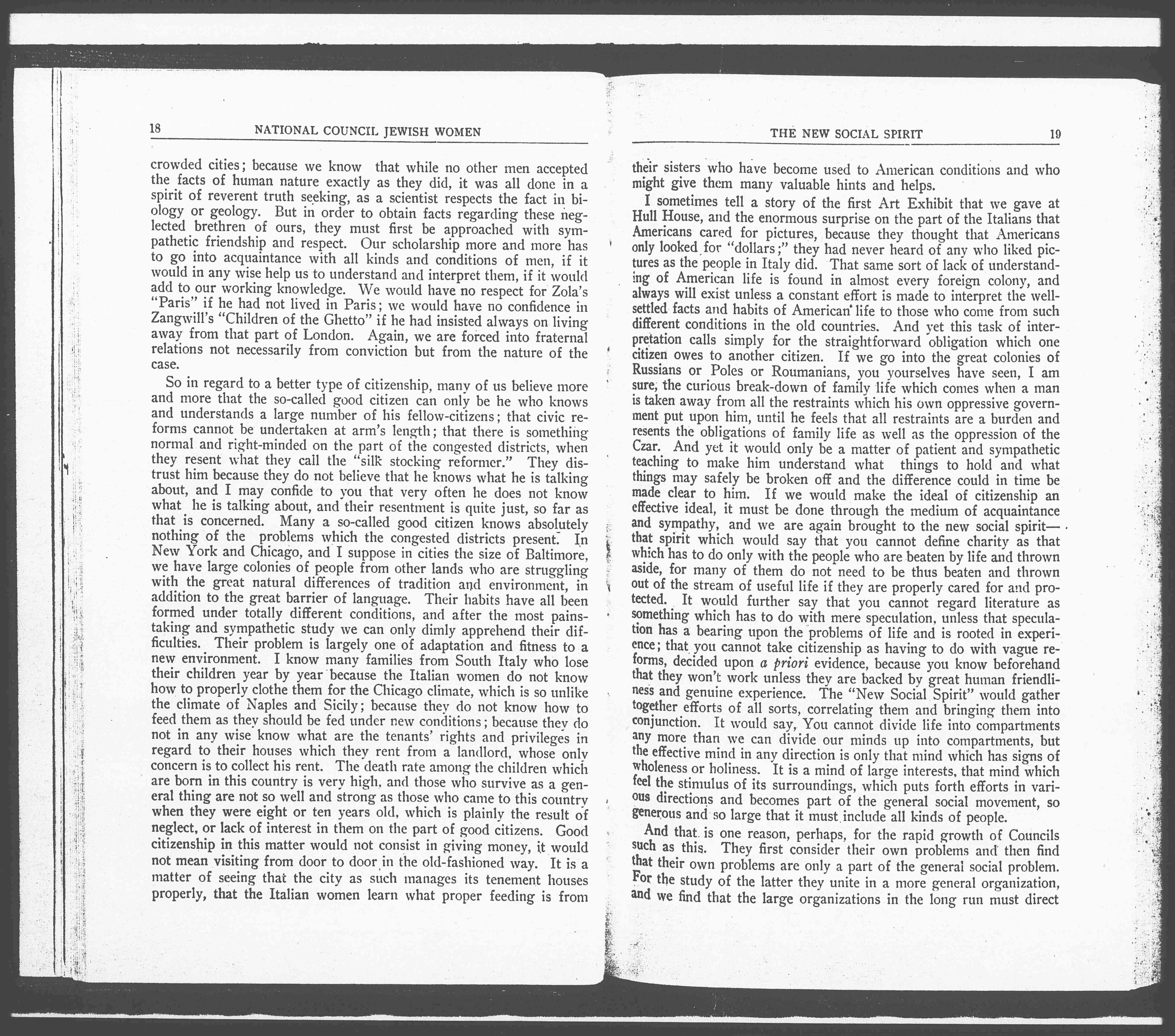 I sometimes tell a story of the first Art Exhibit that we gave at Hull House, and the enormous surprise on the part of the Italians that Americans cared for pictures, because they thought that Americans only looked for "dollars;" they had never heard of any who liked pictures as the people in Italy did. That same sort of lack of understanding of American life is found in almost every foreign colony and always will exist unless a constant effort is made to interpret the well-settled facts and habits of American life to those who come from such different conditions in the old countries. And yet this task of interpretation calls simply for the straightforward obligation which one citizen owes to another citizen. If we go into the great colonies of Russians or Poles or [Romanians], you yourselves have seen, I am sure, the curious break-down of family life which comes when a man is taken away from all the restraints which his own oppressive government put upon him, until he feels that all restraints are a burden and resents the obligations of family life as well as the oppression of the Czar. And yet it would only be a matter of patient and sympathetic teaching to make him understand what things to hold and what things may safely be broken off and the difference could in time be made clear to him. If we would make the ideal of citizenship an effective ideal, it must be done through the medium of acquaintance and sympathy, and we are again brought to the new social spirit-–that spirit which would say that you cannot define charity as that which has to do only with the people who are beaten by life and thrown aside, for many of them do not need to be thus beaten and thrown out of the stream of useful life if they are properly cared for and protected. It would further say that you cannot regard literature as something which has to do with mere speculation, unless that speculation has a bearing upon the problems of life and is rooted in experience; that you cannot take citizenship as having to do with vague reforms, decided upon a priori evidence, because you know beforehand that they won't work unless they are backed by great human friendliness and genuine experience. "The New Social Spirit" would gather together efforts of all sorts, correlating them and bring them into conjunction. It would say, You cannot divide life into compartments any more than we can divide our minds up into compartments, but the effective mind in any direction is only that mind which has signs of wholeness or holiness. It is a mind of large interests, that mind which [feels] the stimulus of its surroundings, which puts forth efforts in various directions and becomes part of the general social movement, so generous and so large that it must include all kinds of people.