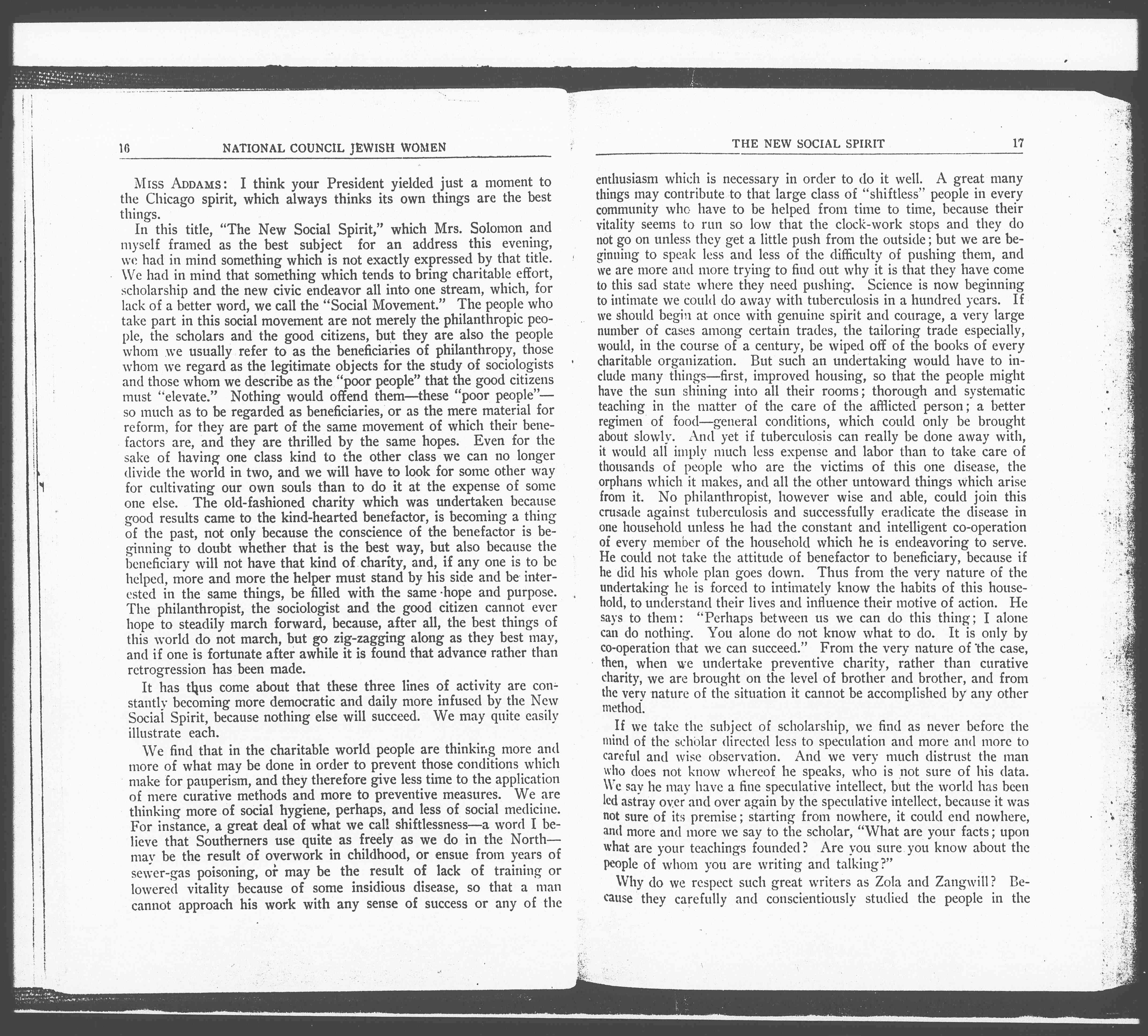 In this title, "The New Social Spirit," which Mrs. Solomon and myself framed as the best subject for an address this evening, we had in mind something which is not exactly expressed by that title. We had in mind that something which tends to bring charitable effort, scholarship and the new civic endeavor all into one stream, which, for lack of a better word, we call the "Social Movement." The people who take part in this social movement are not merely the philanthropic people, the scholars and the good citizens, but they are also the people whom we usually refer to as the beneficiaries of philanthropy, those whom we regard as the legitimate objects for the study of sociologists and those we describe as the "poor people" that the good citizens must "elevate." Nothing would offend them–-these "poor people"-–so much as to be regarded as beneficiaries, or as the mere material for reform, for they are part of the same movement of which their benefactors are, and they are thrilled by the same hopes. Even for the sake of having one class kind to the other class we can no longer divide the world in two, and we will have to look for some other way for cultivating our own souls than to do it at the expense of some one else. The old-fashioned charity which was undertaken because good results came to the kind-hearted benefactor, is becoming a thing of the past, not only because the conscience of the benefactor is beginning to doubt whether that is the best way, but also because the beneficiary will not have that kind of charity, and, if any one is to be helped, more and more the helper must stand by his side and be interested in the same things, be filled with the same hope and purpose. The philanthropist, the sociologist and the good citizen cannot ever hope to steadily march forward, because, after all, the best things of this world do not march, but go zig-zagging along as they best may, and if one is fortunate after awhile it is found that advance rather than retrogression has been made.