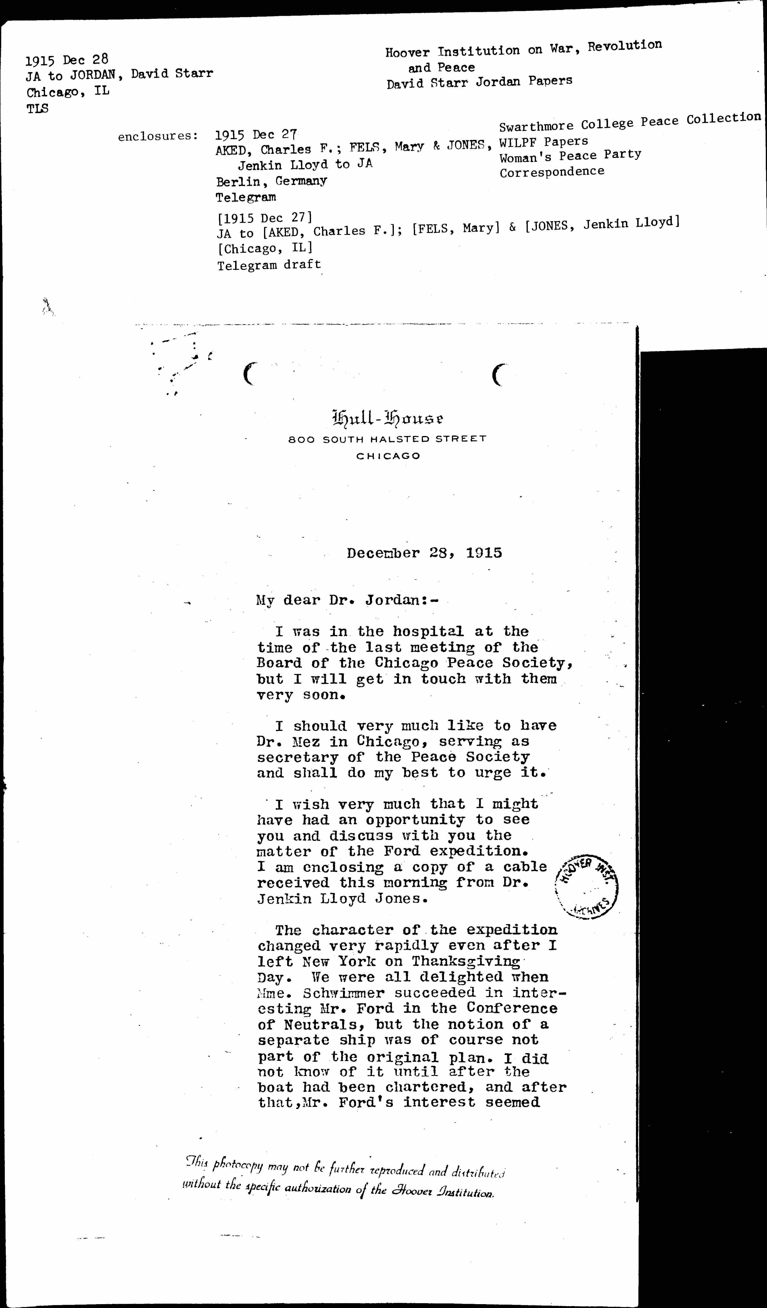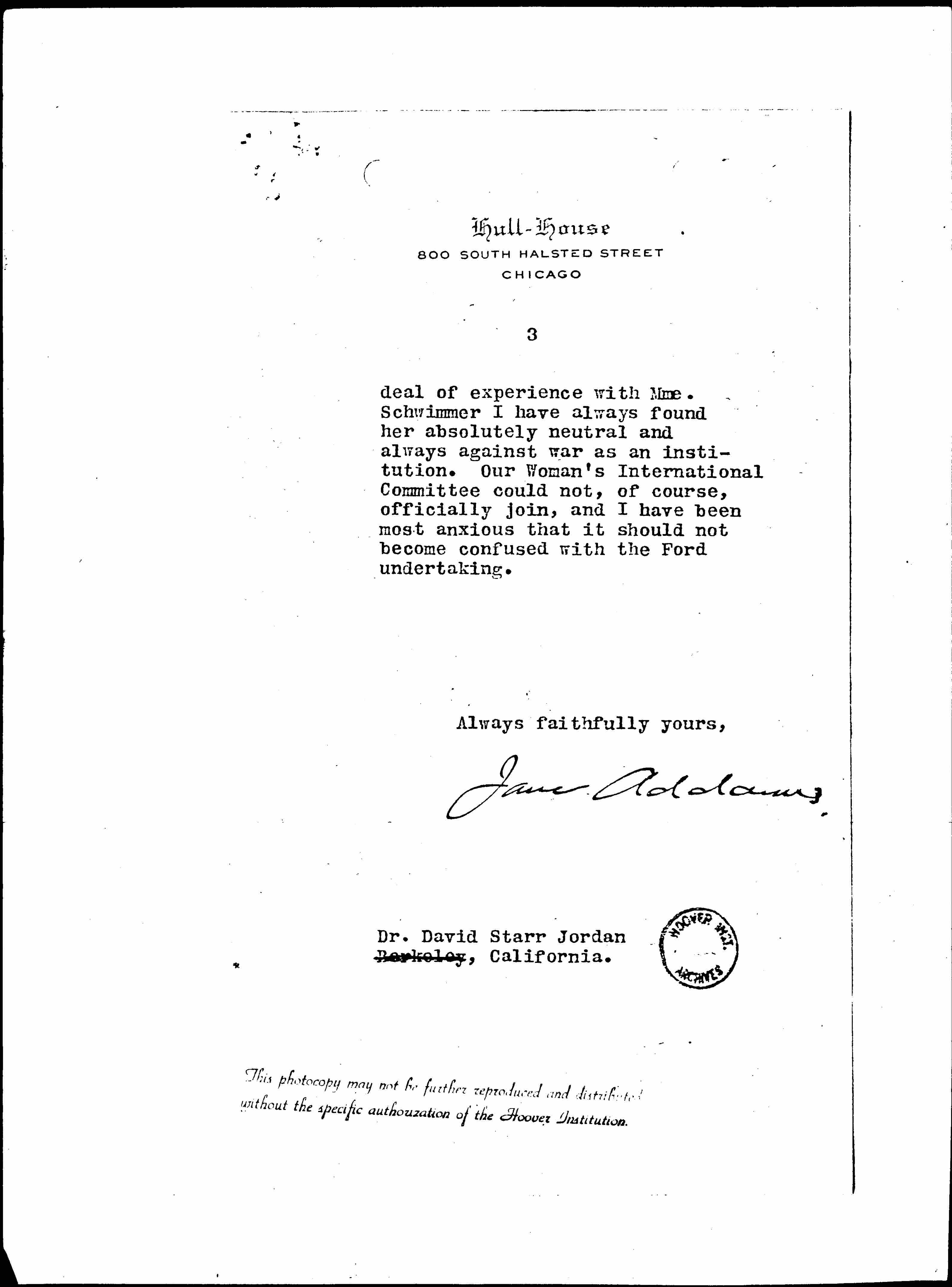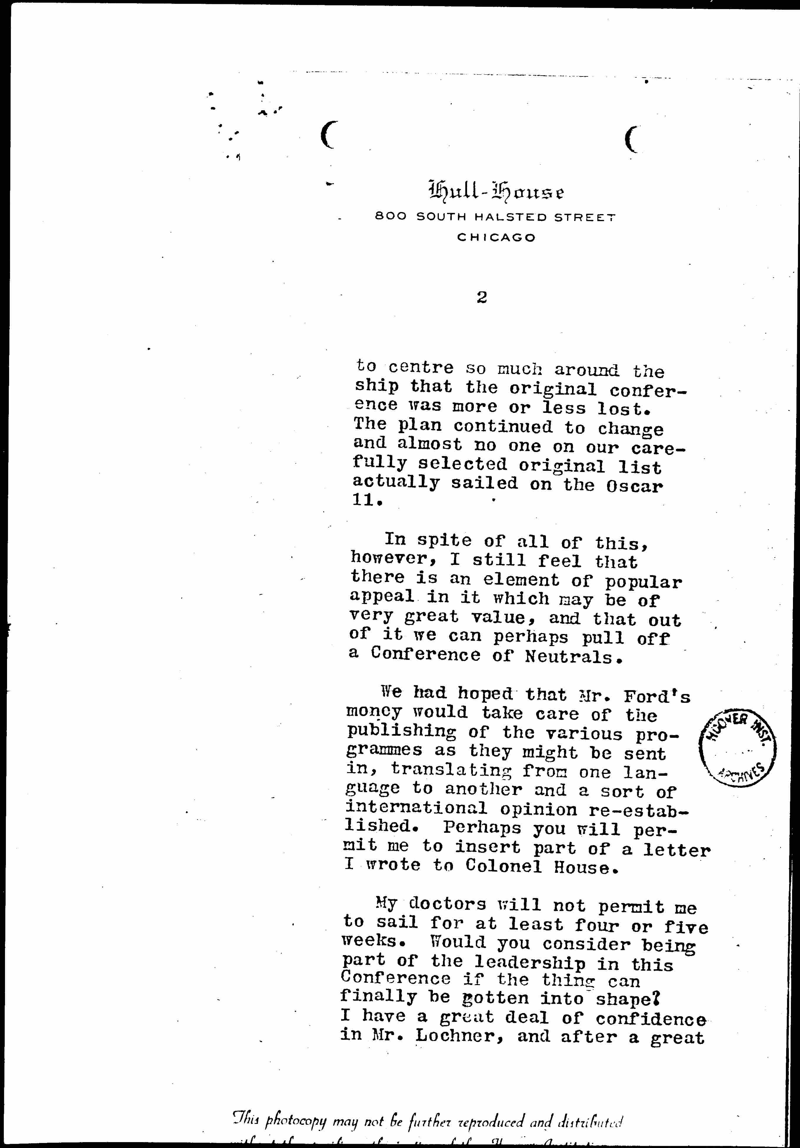 My doctors will not permit me to sail for at least four or five weeks. Would you consider being part of the leadership in this Conference if the thing can finally be gotten into shape? I have a great deal of confidence in Mr. Lochner, and after a great [page 3] deal of experience with Mme. Schwimmer I have always found her absolutely neutral and always against war as an institution. Our Woman's International Committee could not, of course, officially join, and I have been most anxious that it should not become confused with the Ford undertaking.