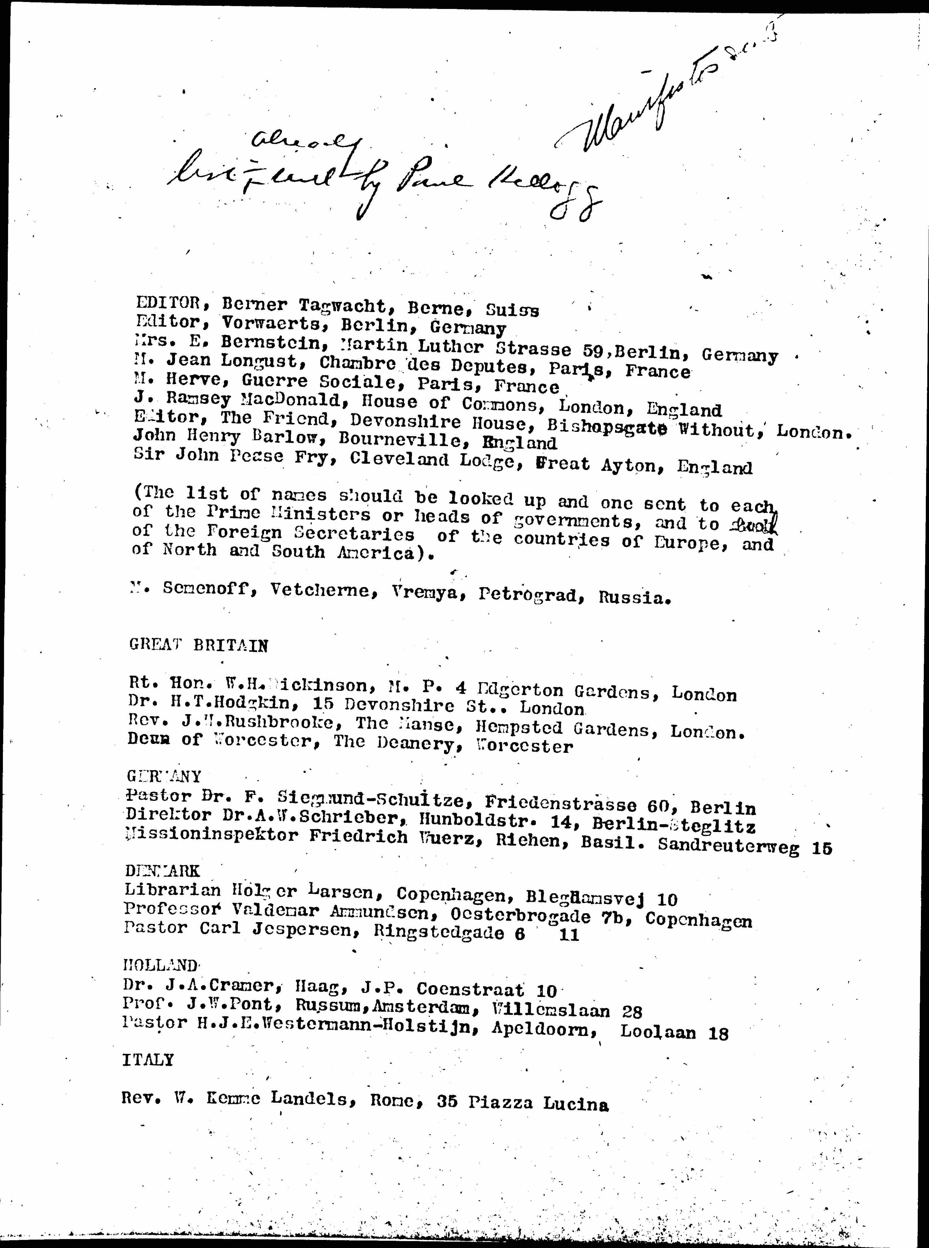Pastor Dr. F. Siegmund-Schultze, Friedenstrasse 60, Berlin