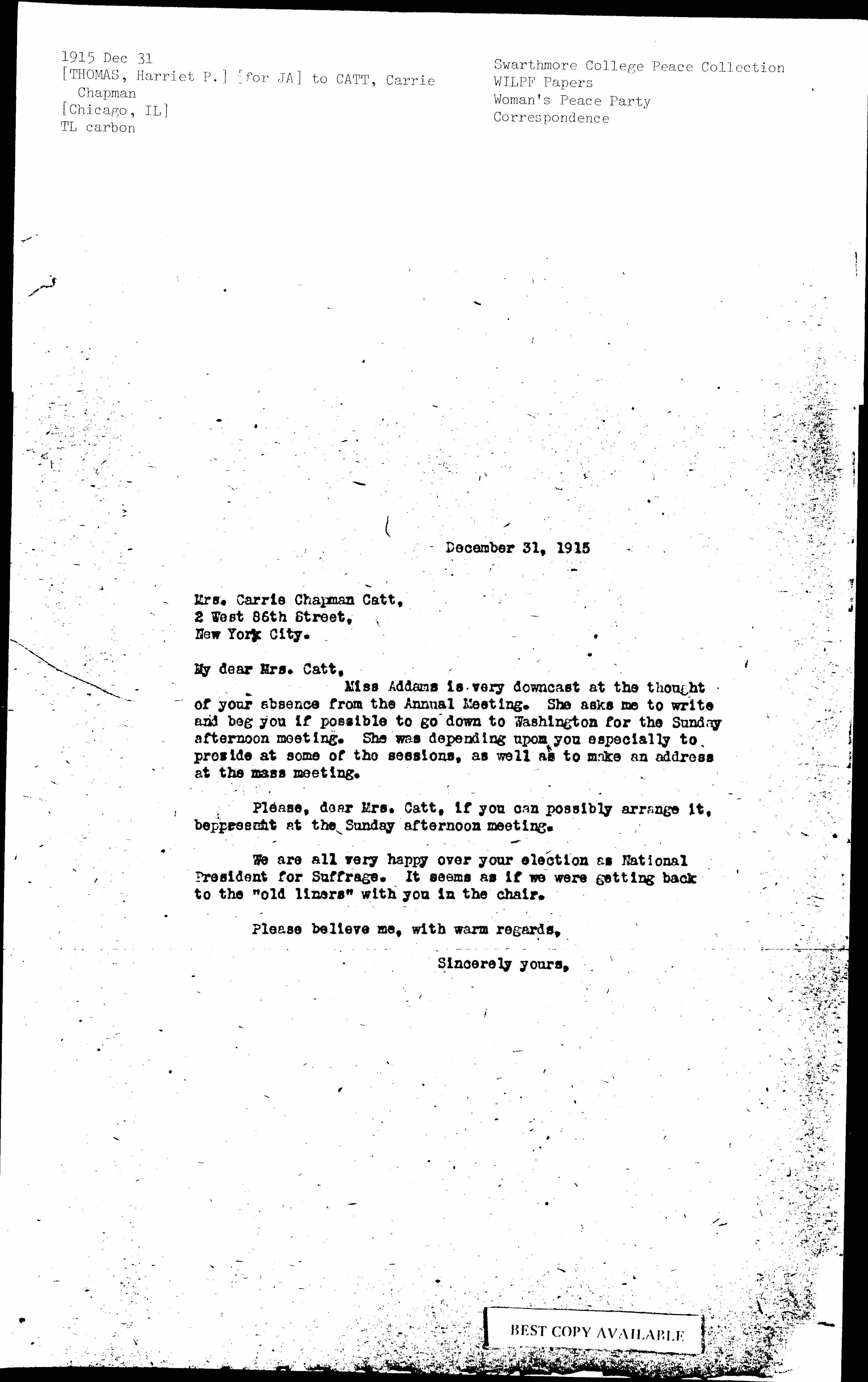 Miss Addams is very downcast at the thought of your absence from the Annual Meeting. She asks me to write and beg you if possible to go down to Washington for the Sunday afternoon meeting. She was depending upon you especially to preside at some of the sessions, as well as to make an address at the mass meeting.