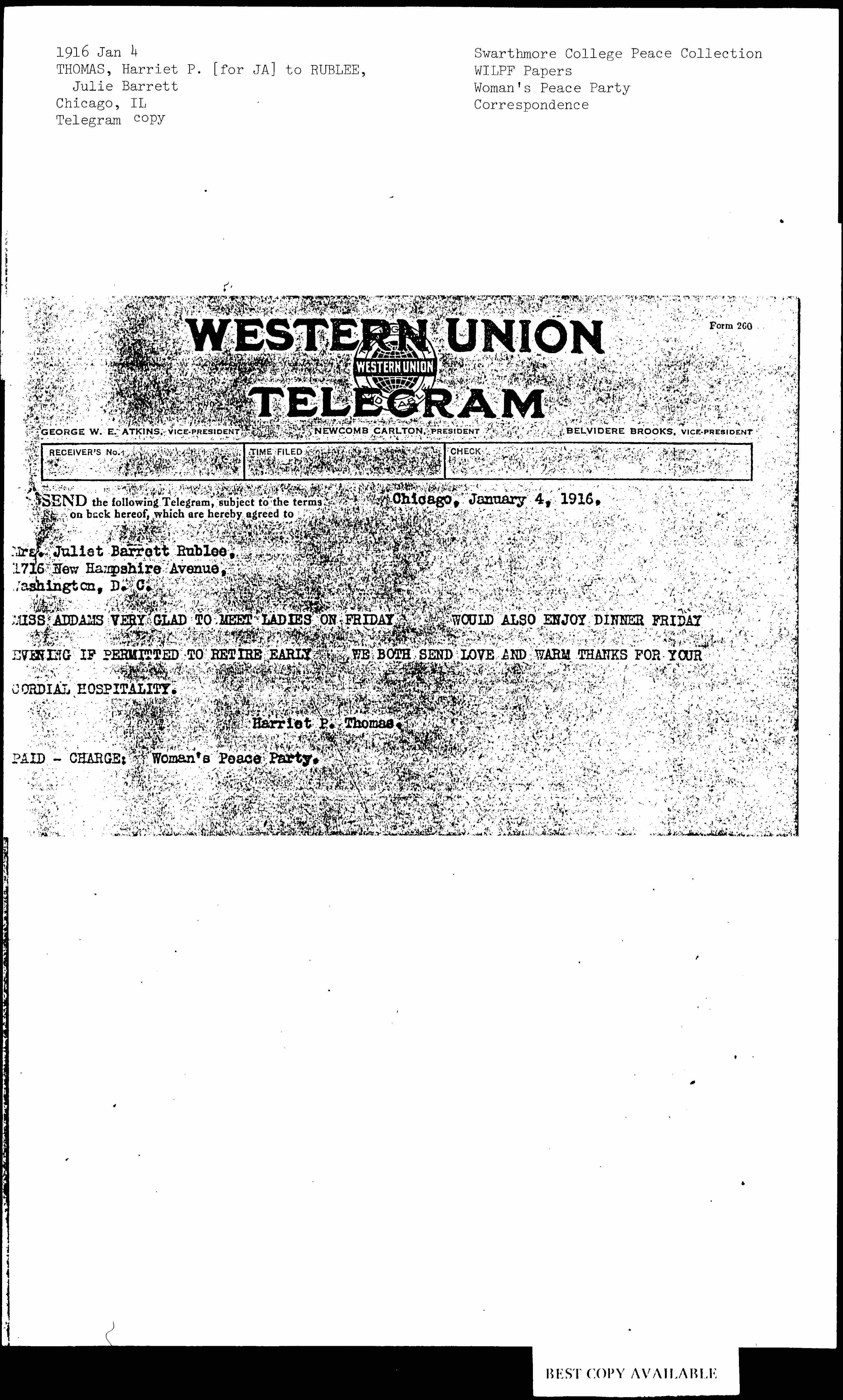 MISS ADDAMS VERY GLAD TO MEET LADIES ON FRIDAY WOULD ALSO ENJOY DINNER FRIDAY EVENING IF PERMITTED TO RETIRE EARLY WE BOTH SEND LOVE AND WARM THANKS FOR YOUR CORDIAL HOSPITALITY.