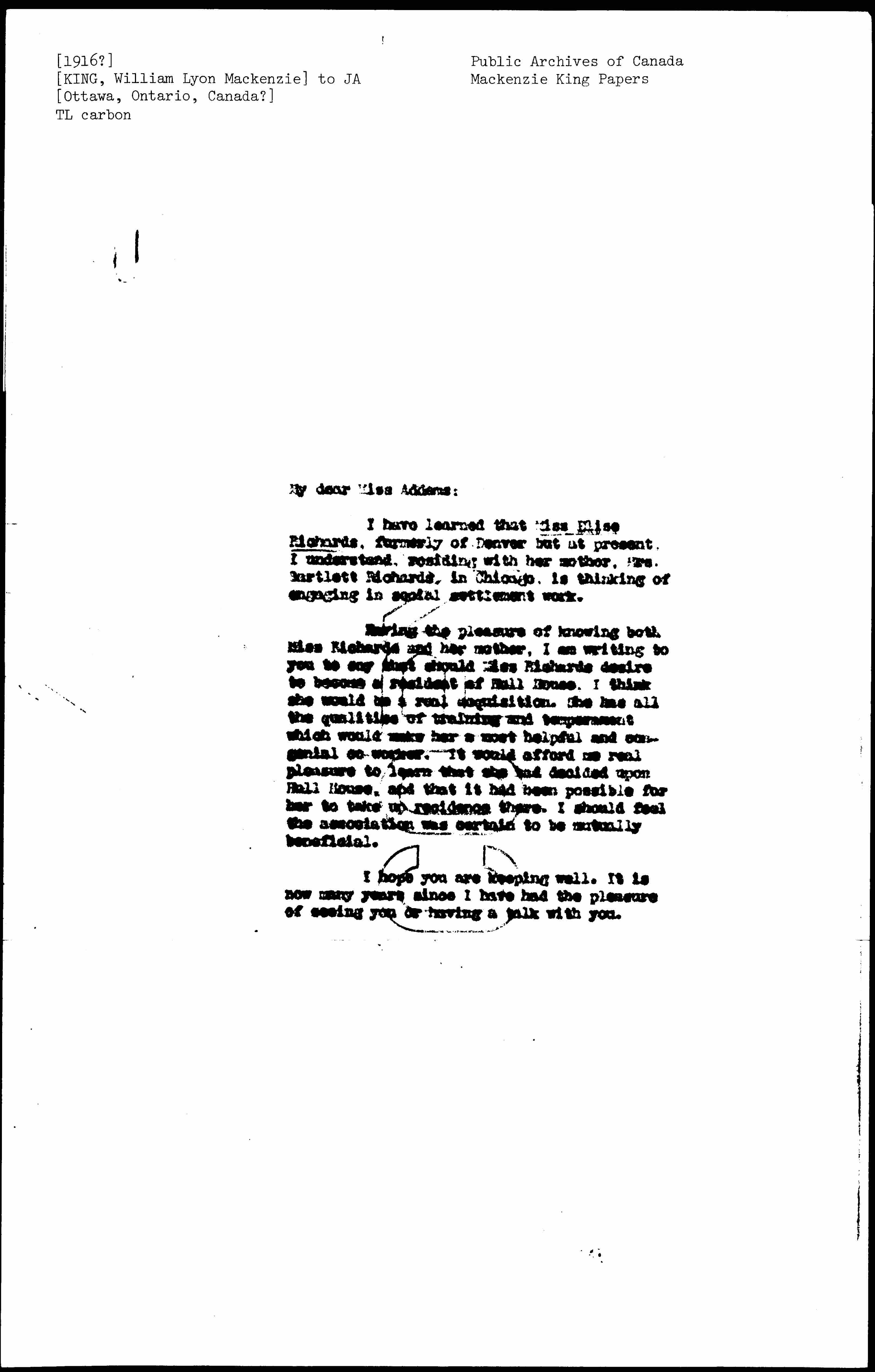 Having the pleasure of knowing both Miss Richards and her mother, I am writing to you to say that should Miss Richards desire to become a resident of Hull House, I think she would be a real acquisition. She has all the qualities of training and temperament which would make her a most helpful and congenial co-worker. It would afford me real pleasure to learn that she had decided upon Hull House, and that it had been possible for her to take up residence there. I should feel the association was certain to be mutually beneficial.