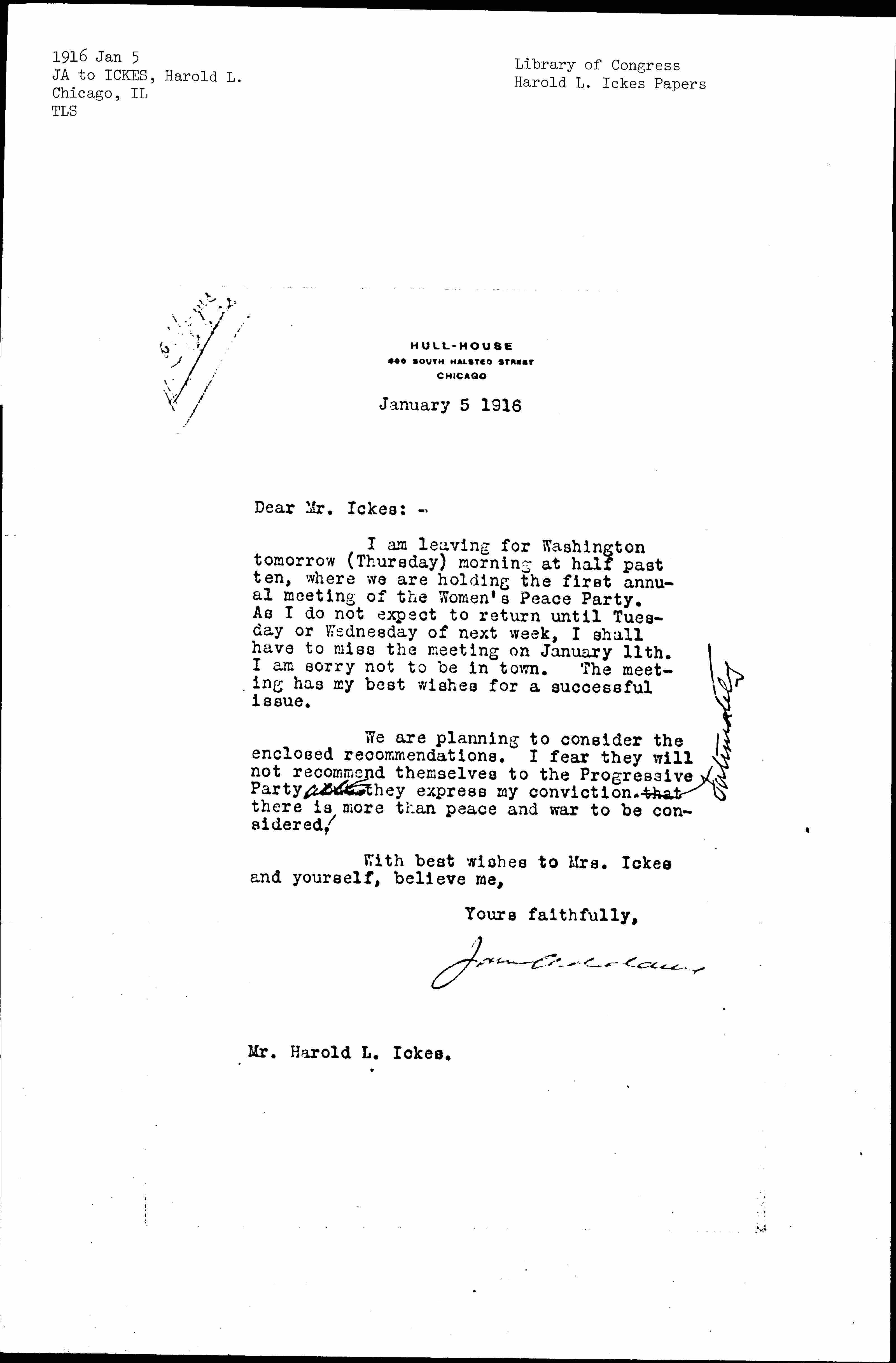 I am leaving for Washington tomorrow (Thursday) morning at half past ten, where we are holding the first annual meeting of the Women's Peace Party. As I do not expect to return until Tuesday or Wednesday of next week, I shall have to miss the meeting on January 11th. I am sorry not to be in town. The meeting has my best wishes for a successful issue.