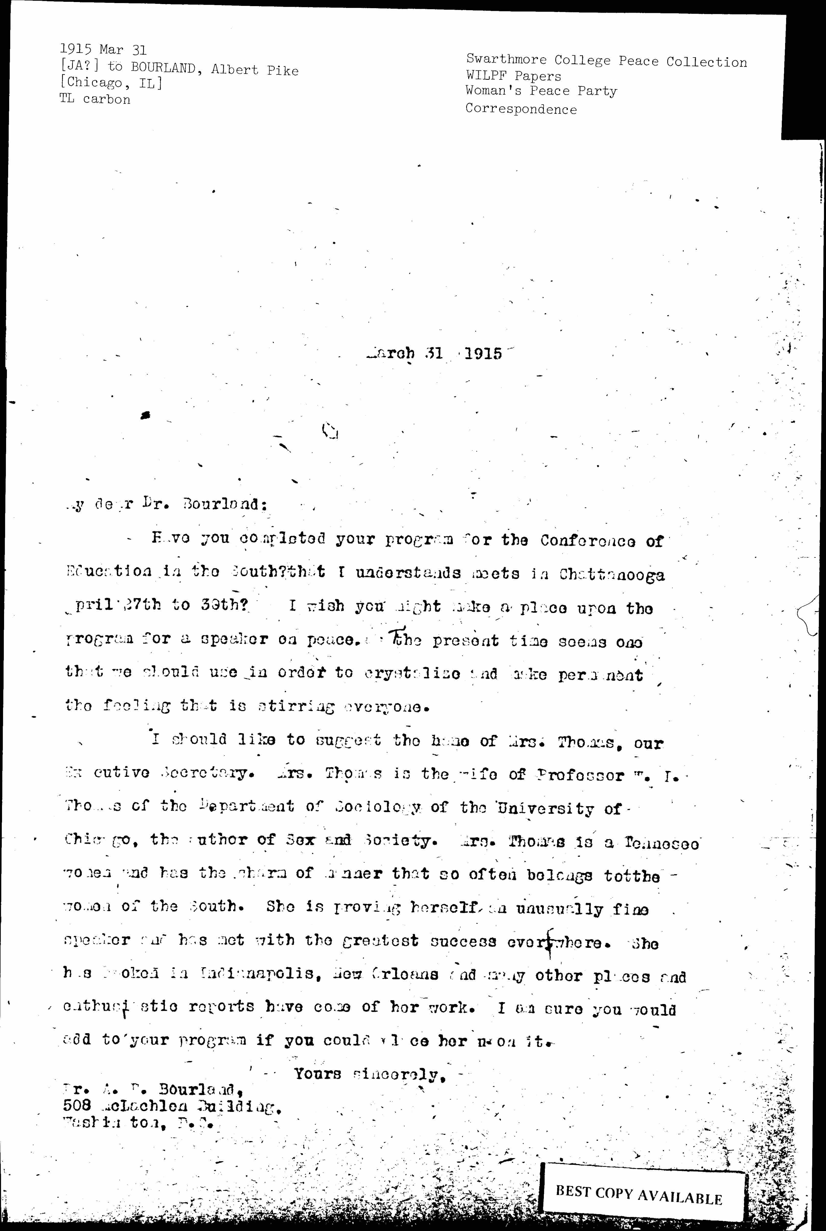 I should like to suggest the home of Mrs. Thomas, our Executive Secretary. Mrs. Thomas is the wife of Professor W. I. Thomas of the Department of Sociology of the University of Chicago, the author of Sex and Society. Mrs. Thomas is a [Tennessee] woman and has the charm of manner that so often belongs to the women of the South. She is proving herself an unusually fine speaker and has met with the greatest success everywhere. She has spoken in Indianapolis, New Orleans and many other places and enthusiastic reports have come of her work. I am sure you would add to your program if you could place her upon it.