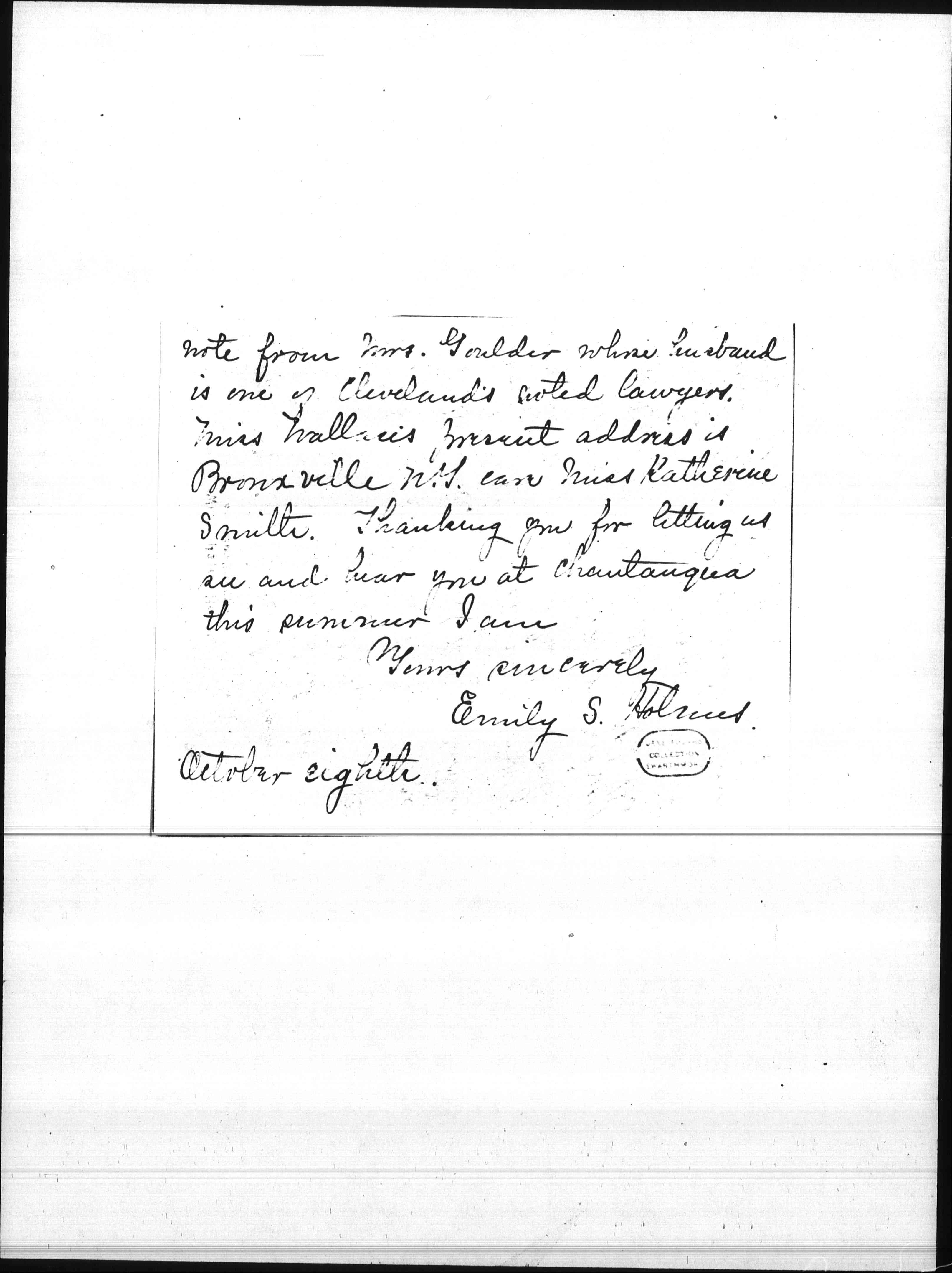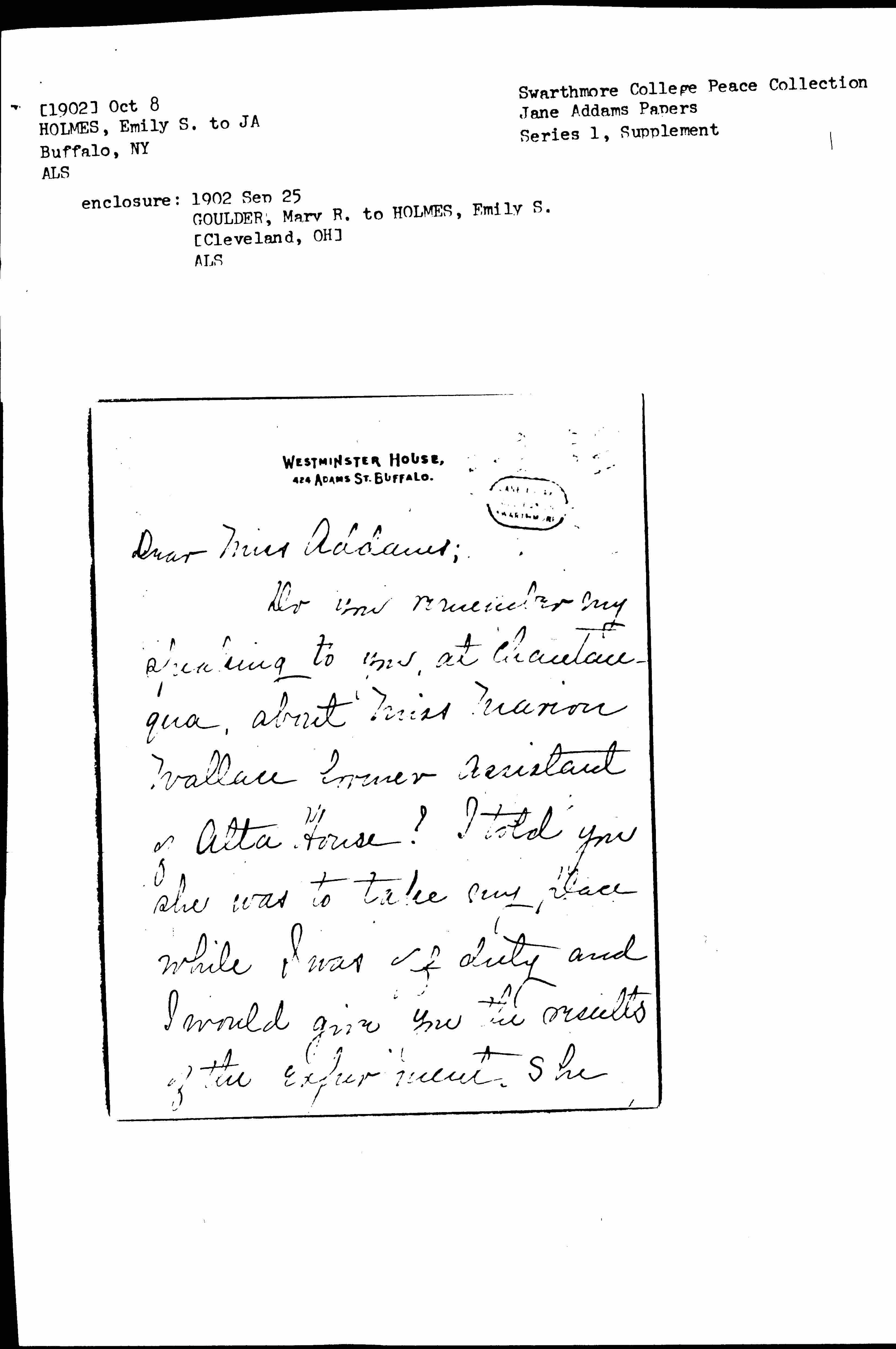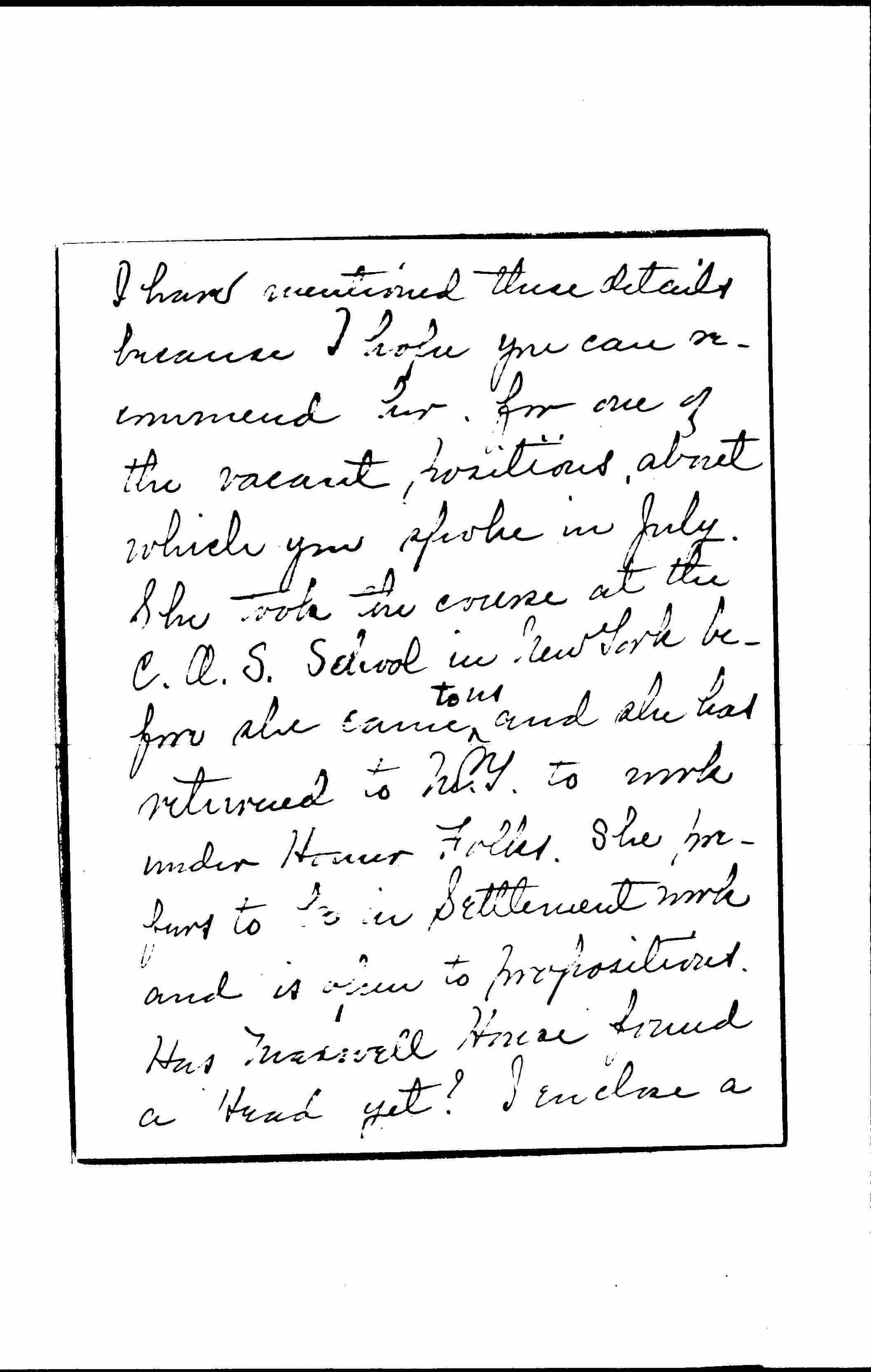 I have mentioned these details because I hope you can recommend her for one of the vacant positions about which you spoke in July. She took the course at the C. O. S. School in New York before she came ↑to us↓ and she has returned to N. Y. to work under Homer Folks. She prefers to be in Settlement work and is open to propositions. Has Maxwell House found a Head yet? I enclose a [page 7] note from Mrs. Goulder whose husband is one of Cleveland's noted lawyers. Miss Wallace's present address is Bronxville, N. Y. care Miss Katherine Smith. Thanking you for letting us see and hear you at Chautauqua this summer I am