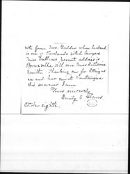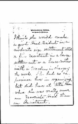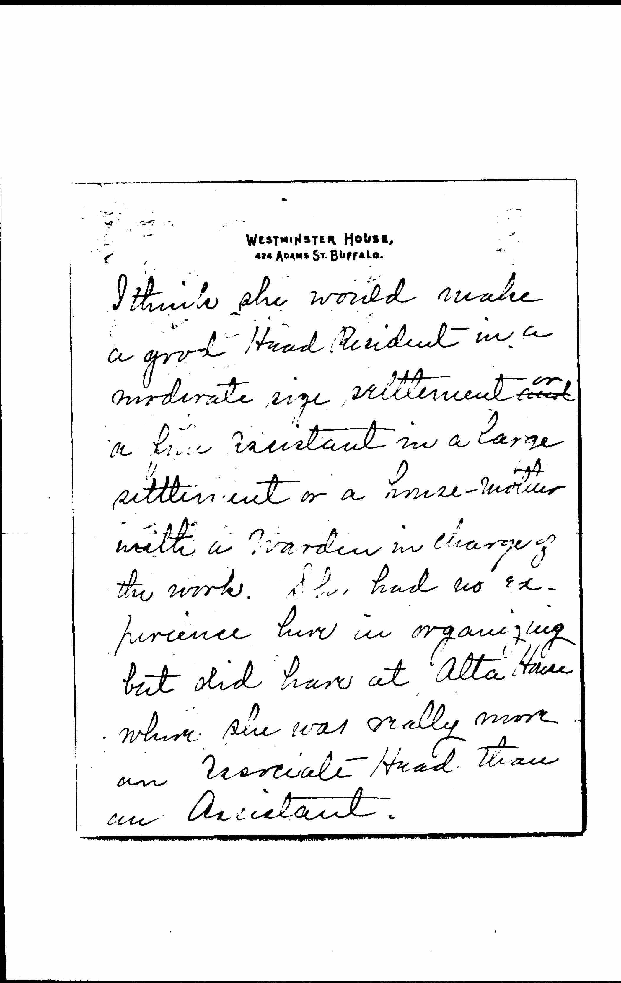 Do you remember my speaking to you at Chautauqua, about Miss Marion Wallace former assistant of Alta House? I told you she was to take my place while I was off duty and I would give you the results of the experiment. She [page 2] came as planned and took charge of our Settlement for six weeks. She certainly gained everybody's love, the old and young of the neighborhood, all the residents, the people who serve us and the few up town people whom she met. The residence was never in better order nor the public rooms, [although] she had to deal with a drunken janitor and poor work women. [page 3] The summer work was carried on the way I planned and the unexpected handled to my satisfaction. Miss Wallace is [greatness] personified. She, like myself, does not believe in Dr. Robbins theories of managing the young people. She thinks her [illegible] had to be lawlessness and was broken hearted when she visited Cleveland recently to see the conditions things were in at Alta House. She also found that [page 4] respect for Alta House had not increased among the people [although] unlimited liberties had been granted. Miss Wallace's education is equal to about one year of college. She has not been trained to give addresses and I doubt if she can do any better in that line that I can. She has grey hair but is not yet forty years old and as our working housekeeper says "she looks delicate but she can do an awful lot of work." [page 5] I think she would make a good Head Resident in a moderate size settlement and ↑or↓ a fine assistant in a large settlement or a house-mother with a warden in charge of the work. She had no experience here in organizing but did have at Alta House where she was really more an Associate Head than an Assistant. [page 6]