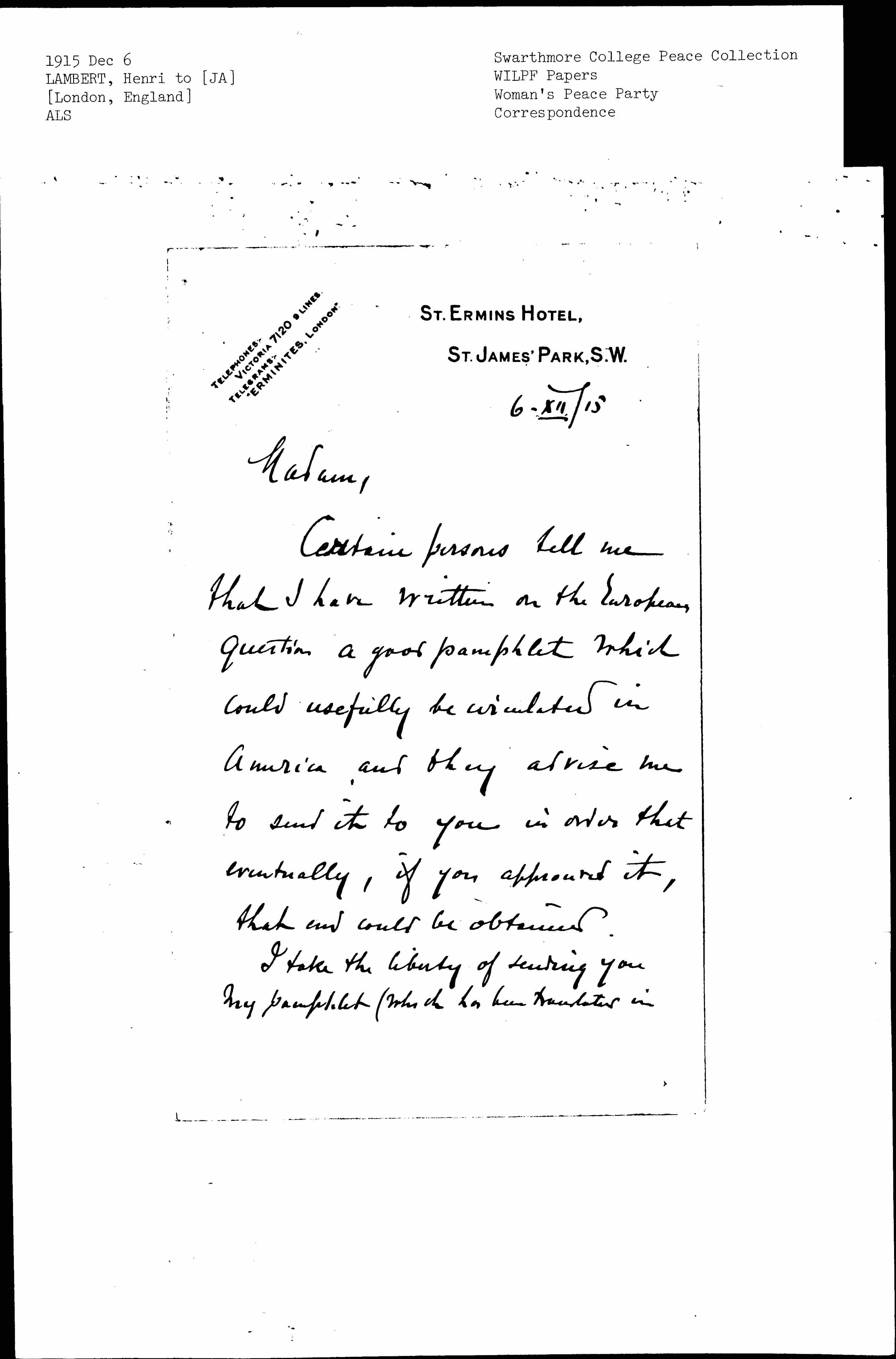 Certain persons tell me that I have written on the European question a good pamphlet which could usefully be circulated in America and they advise me to send it to you in order that eventually, if you approved it, that end could be obtained.