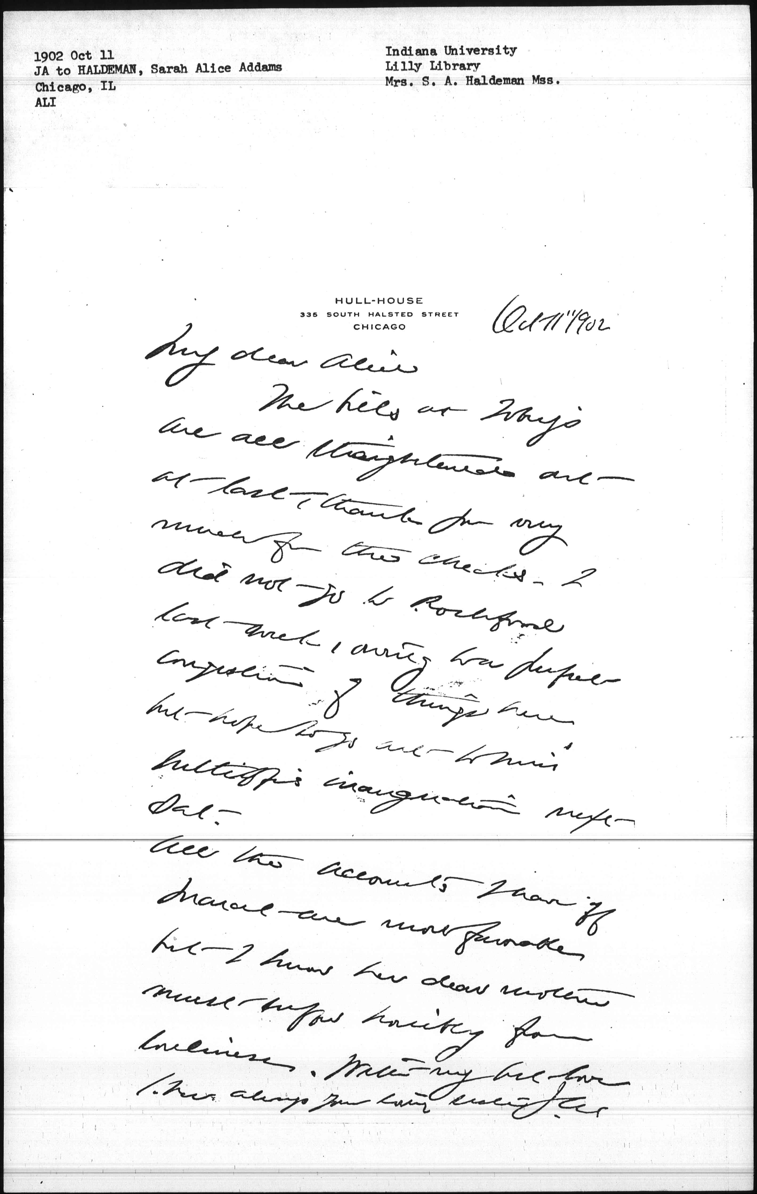 The [bills] at Toby's are all straightened out at last, thank you very much for the checks. I did not go to Rockford last week, owing to a perfect congestion of things here but hope to go out to Miss Sutliff's inauguration next Sat.