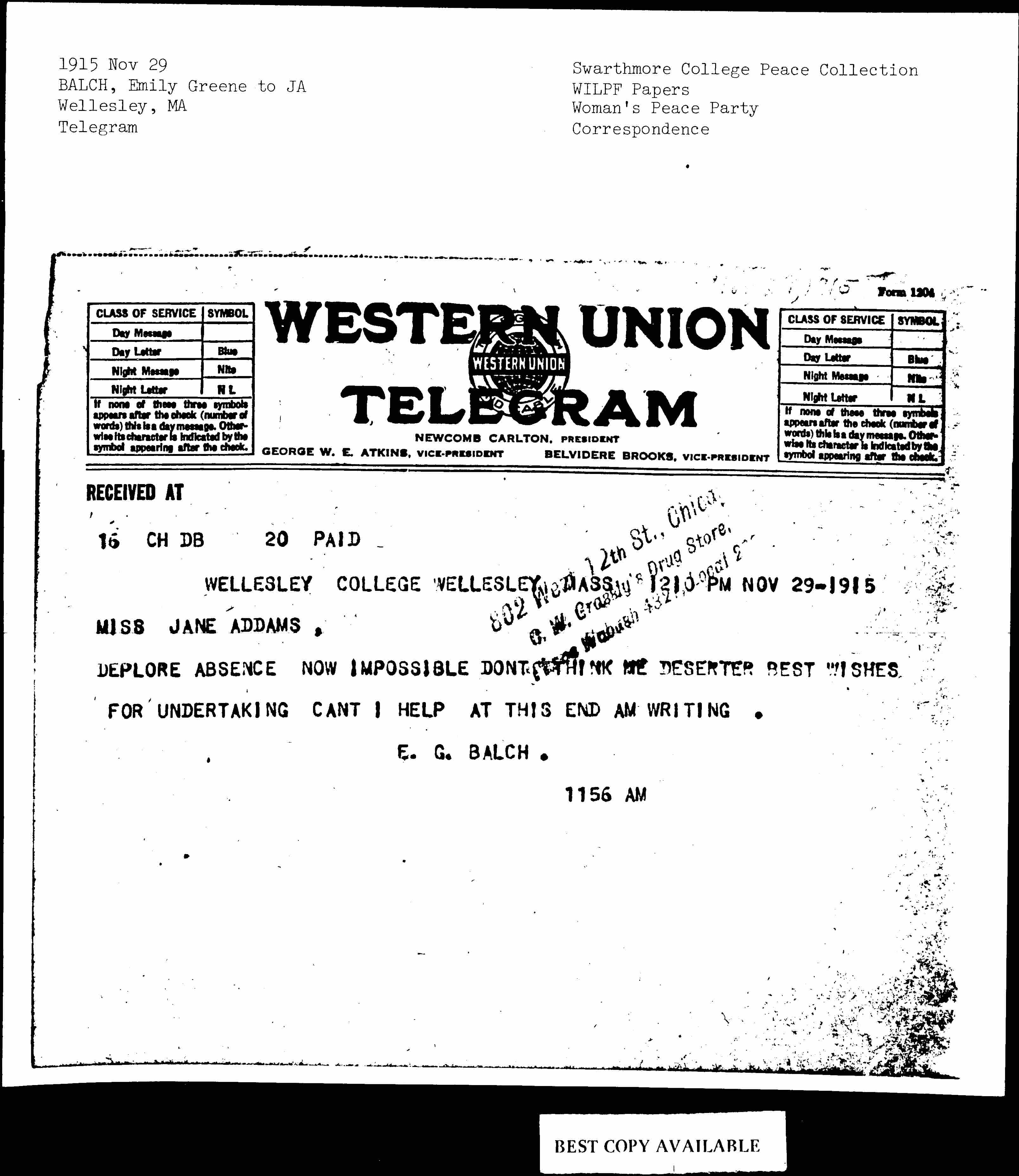 DEPLORE ABSENCE NOW IMPOSSIBLE DON'T THINK ME DESERTER BEST WISHES FOR UNDERTAKING CAN'T I HELP AT THIS END AM WRITING.