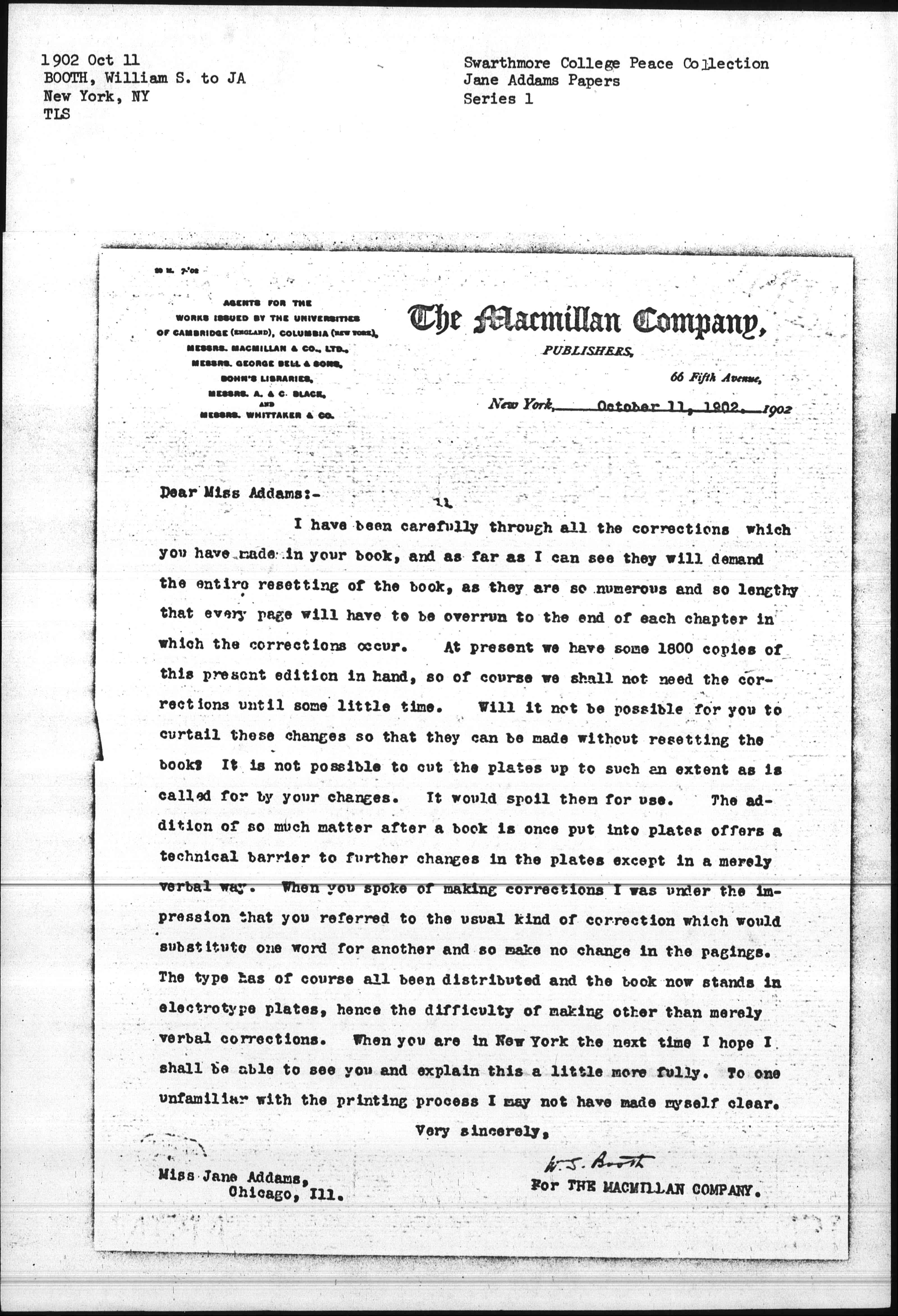 I have been carefully through all the corrections which you have made in your book, and as far as I can see they will demand the entire resetting of the book, as they are so numerous and so lengthy that every page will have to be overrun to the end of each chapter in which the corrections occur. At present we have some 1800 copies of this present edition in hand, so of course we shall not need the corrections until some little time. Will it not be possible for you to curtail these changes so that they can be made without resetting the book? It is not possible to cut the plates up to such an extent as is called for by your changes. It would spoil them for use. The addition of so much matter after a book is once put into plates offers a technical barrier to further changes in the plates except in a merely verbal way. When you spoke of making corrections I was under the impression that you referred to the usual kind of correction which would substitute one word for another and so make no change in the pagings. The type has of course all been distributed and the book now stands in electrotype plates, hence the difficulty of making other than merely verbal corrections. When you are in New York the next time I hope I shall be able to see you and explain this a little more fully. To one unfamiliar with the printing process I may not have made myself clear.