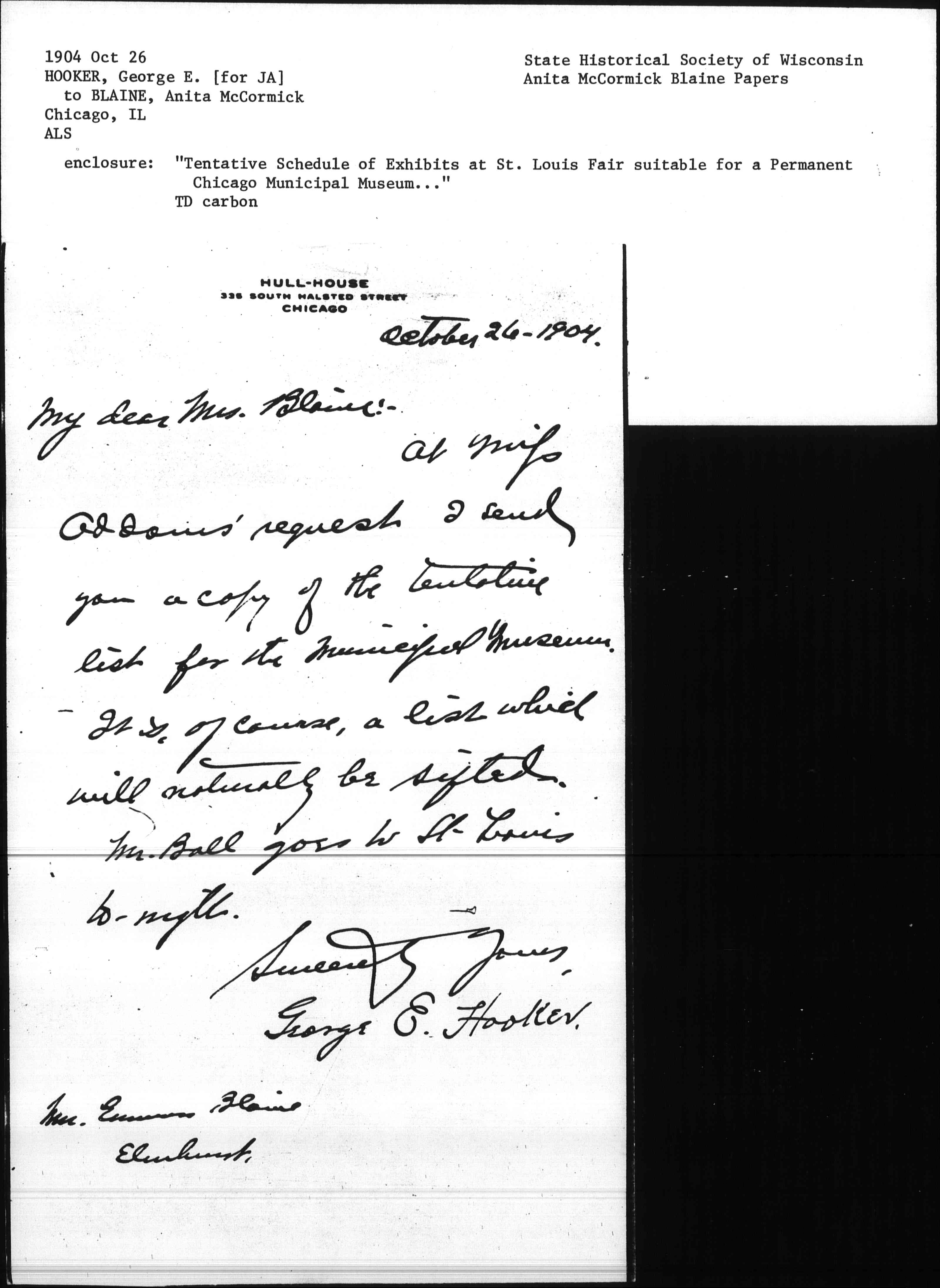 My Dear Mrs. Blaine:-At [Miss] Addams' request I send you a copy of the tentative list for the Municipal Museum. It is, of course, a list which will naturally be sifted.