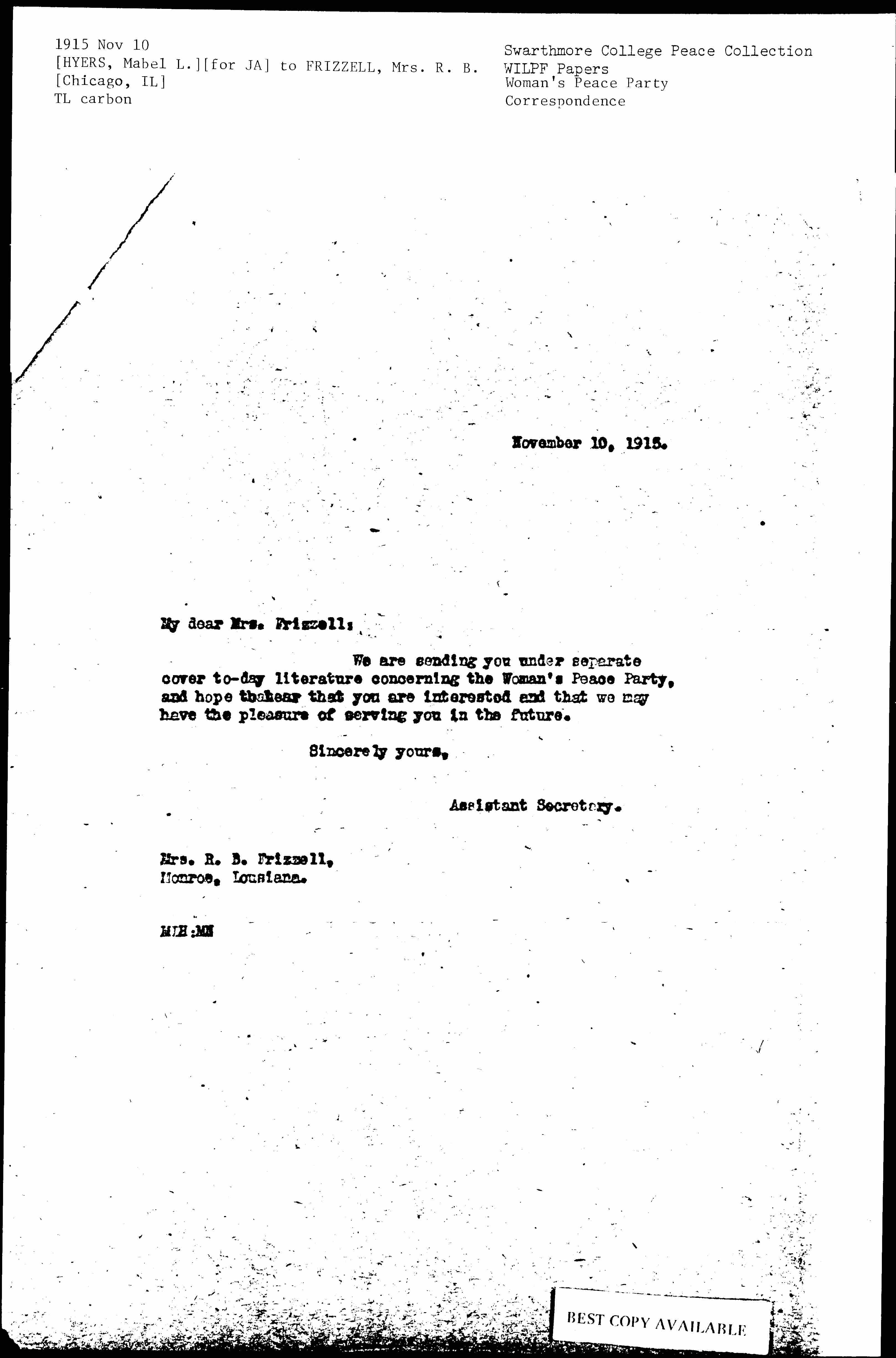 We are sending you under separate cover [today] literature concerning the Woman's Peace Party, and hope [to hear] that you are interested and that we may have the pleasure of serving you in the future.