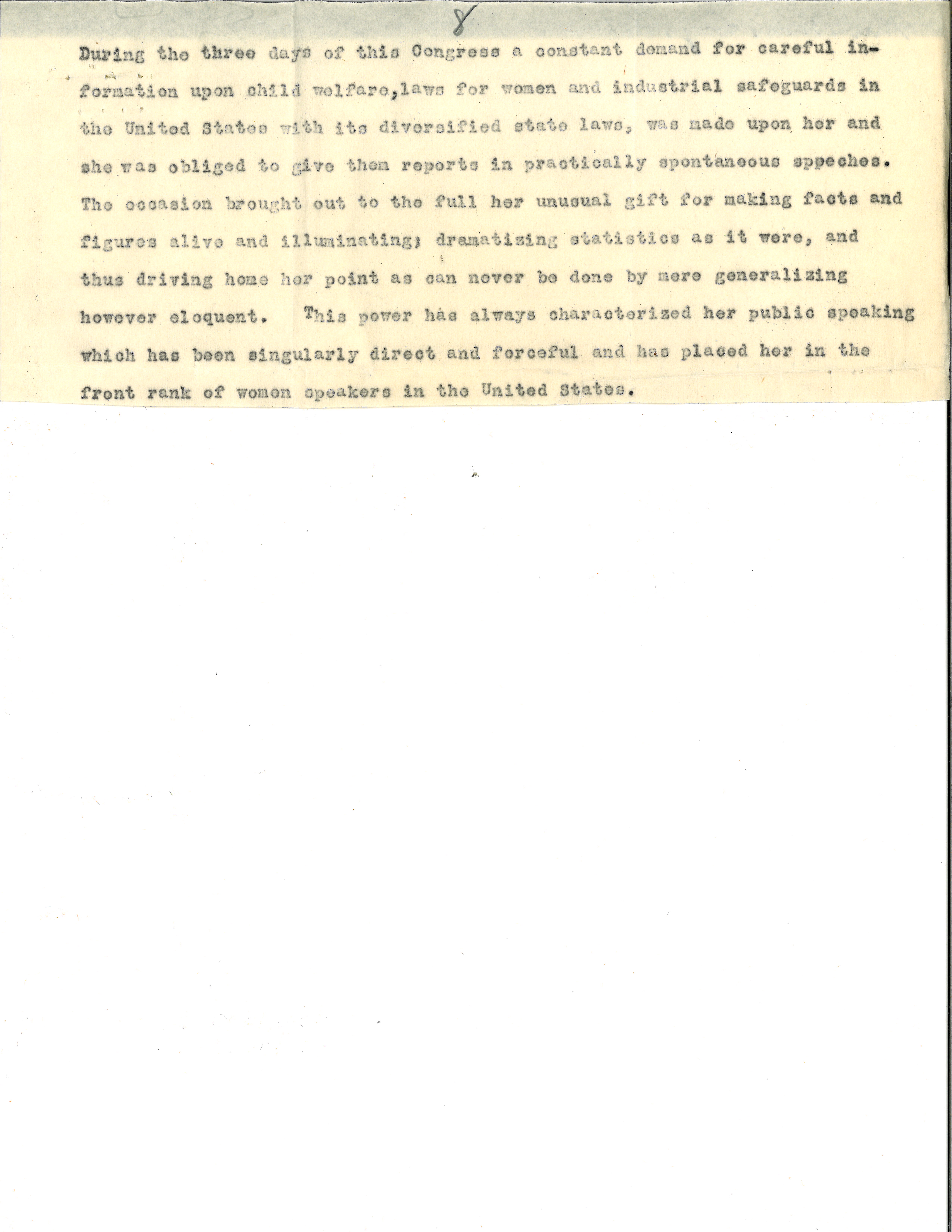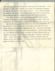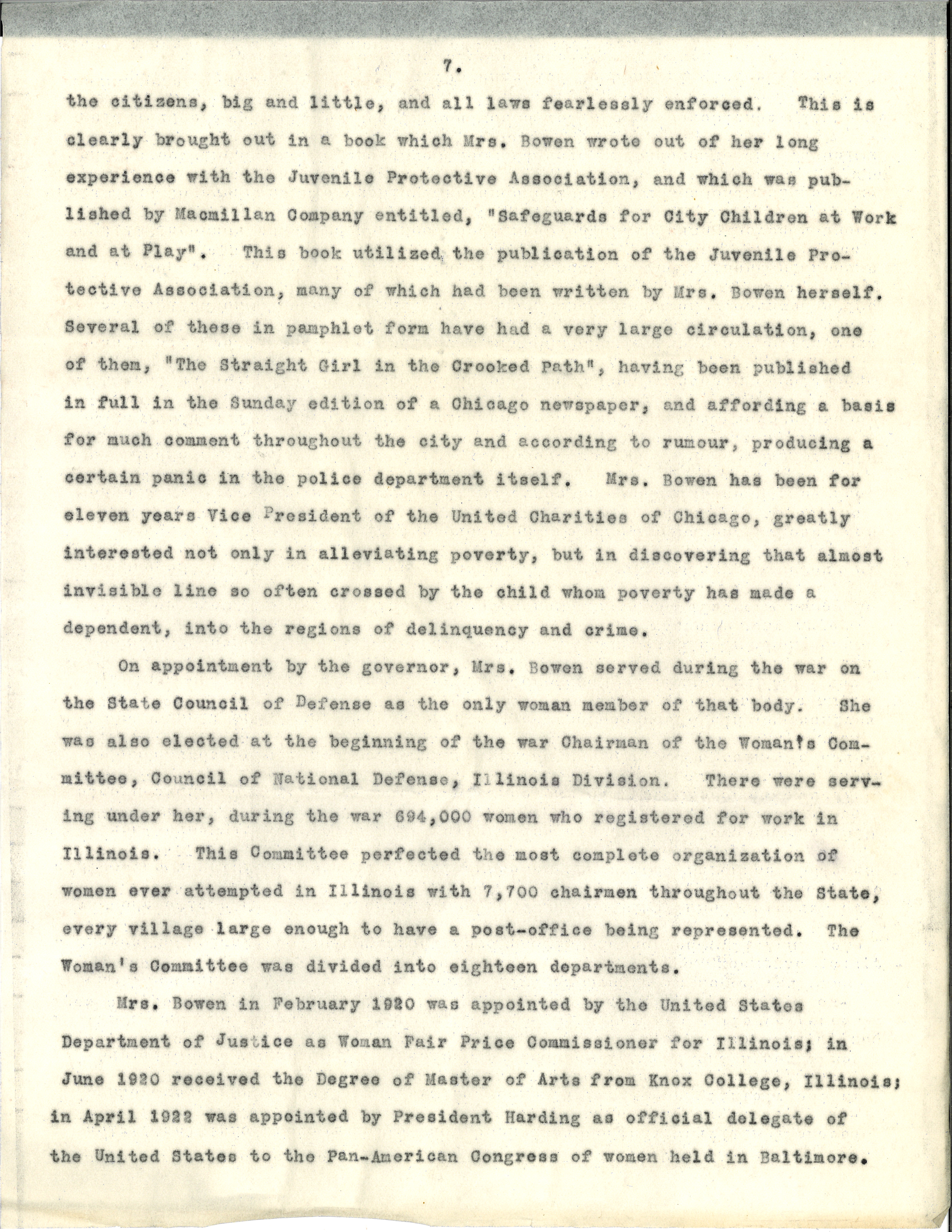 Mrs. Bowen in February 1920 was appointed by the United States Department of Justice as Woman Fair Price Commissioner for Illinois; in June 1920 received the Degree of Master of Arts from Knox College, Illinois; in April 1922 was appointed by President Harding as official delegate of the United States to the Pan-American Congress of Women held in Baltimore. [page 8] During the three days of this Congress a constant demand for careful information upon child welfare, laws for women and industrial safeguards in the United States with its diversified state laws, was made upon her and she was obliged to give them reports in practically spontaneous [speeches]. The occasion brought out to the full her unusual gift for making facts and figures alive and illuminating; dramatizing statistics as it were, and thus driving home her point as can never be done by mere generalizing however eloquent. This power has always characterized her public speaking which has been singularly direct and forceful and has placed her in the front rank of women speakers in the United States. [page 9]