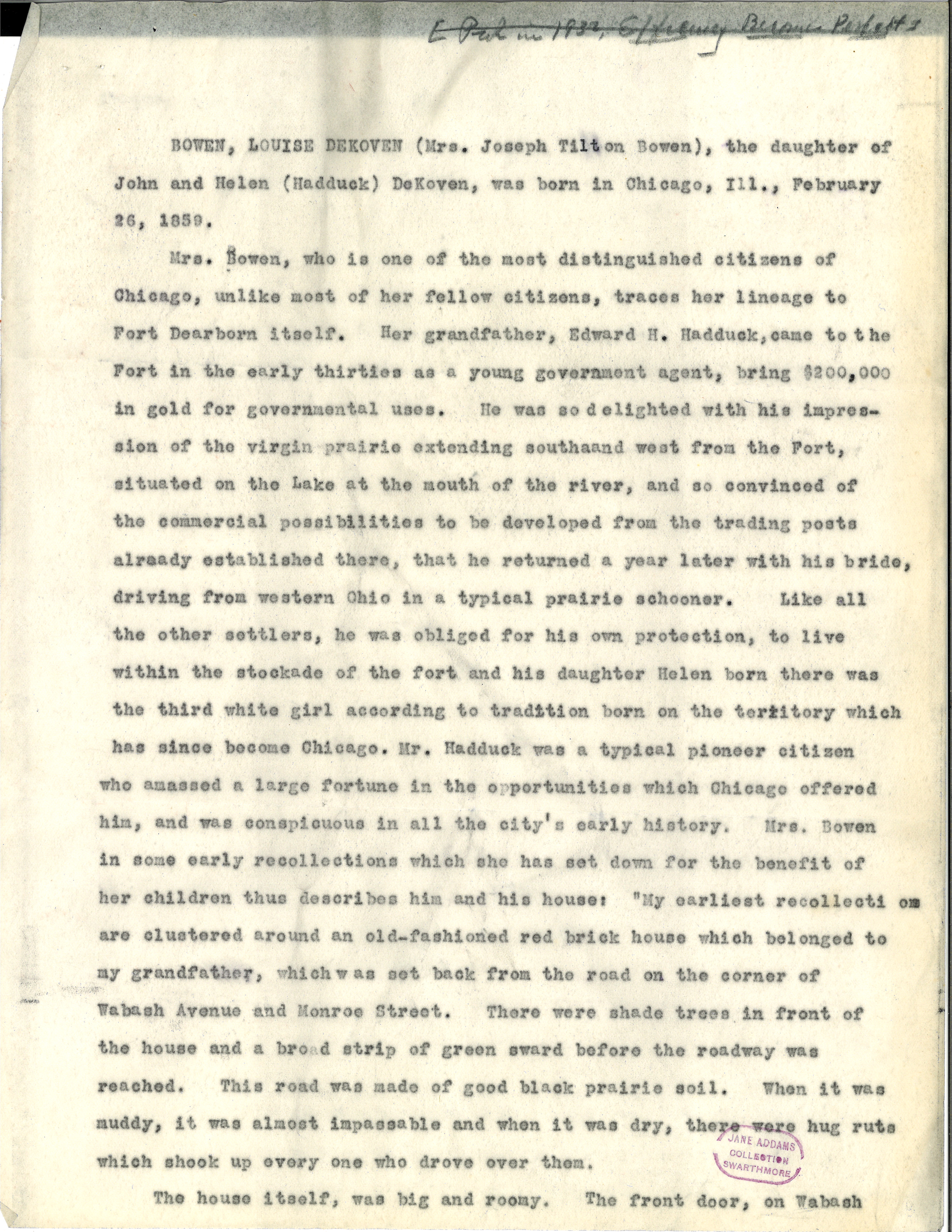 Mrs. Bowen, who is one of the most distinguished citizens of Chicago, unlike most of her fellow citizens, traces her lineage to Fort Dearborn itself. Her grandfather, Edward H. Hadduck, came to the Fort in the early thirties as a young government agent, bring $200,000 in gold for governmental uses. He was so delighted with his impression of the virgin prairie extending south [and] west from the Fort, situated on the Lake at the mouth of the river, and so convinced of the commercial possibilities to be developed from the trading posts already established there, that he returned a year later with his bride, driving from western Ohio in a typical prairie schooner. Like all the other settlers, he was obliged for his own protection, to live within the stockade of the fort and his daughter Helen born there was the third white girl according to tradition born on the territory which has since become Chicago. Mr. Hadduck was a typical pioneer citizen who amassed a large fortune in the opportunities which Chicago offered him, and was conspicuous in all the city's early history. Mrs. Bowen in some early recollections which she has set down for the benefit of her children thus describes him and his house: "My earliest recollection are clustered around an old-fashioned red brick house which belonged to my grandfather, which was set back from the road on the corner of Wabash Avenue and Monroe Street. There were shade trees in front of the house and a broad strip of green sward before the roadway was reached. This road was made of good black prairie soil. When it was muddy, it was almost impassable and when it was dry, there were [huge] ruts which shook up every one who drove over them.