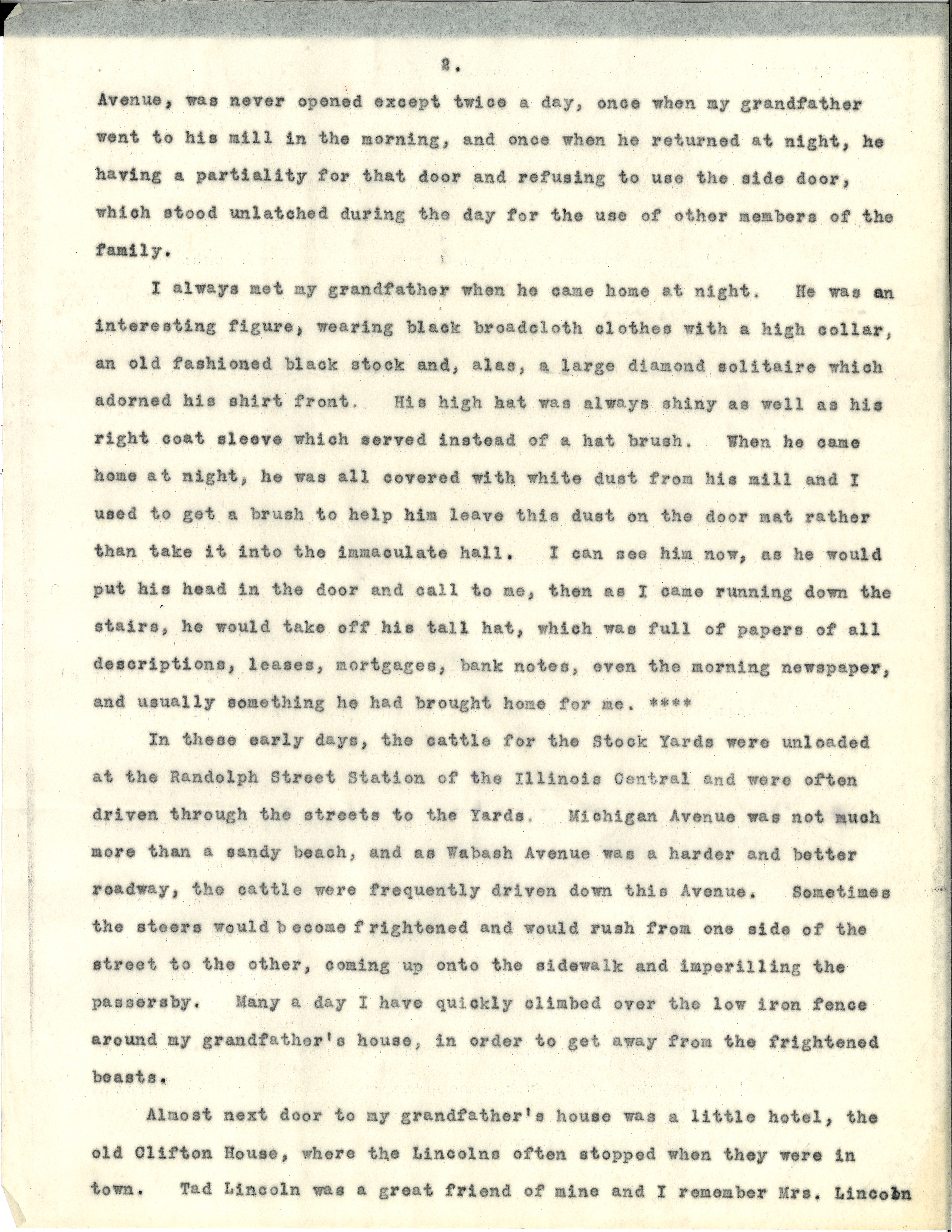Almost next door to my grandfather's house was a little hotel, the old Clifton House, where the Lincolns often stopped when they were in town. Tad Lincoln was a great friend of mine and I remember Mrs. Lincoln [page 3] perfectly well talking to us as we were playing together.