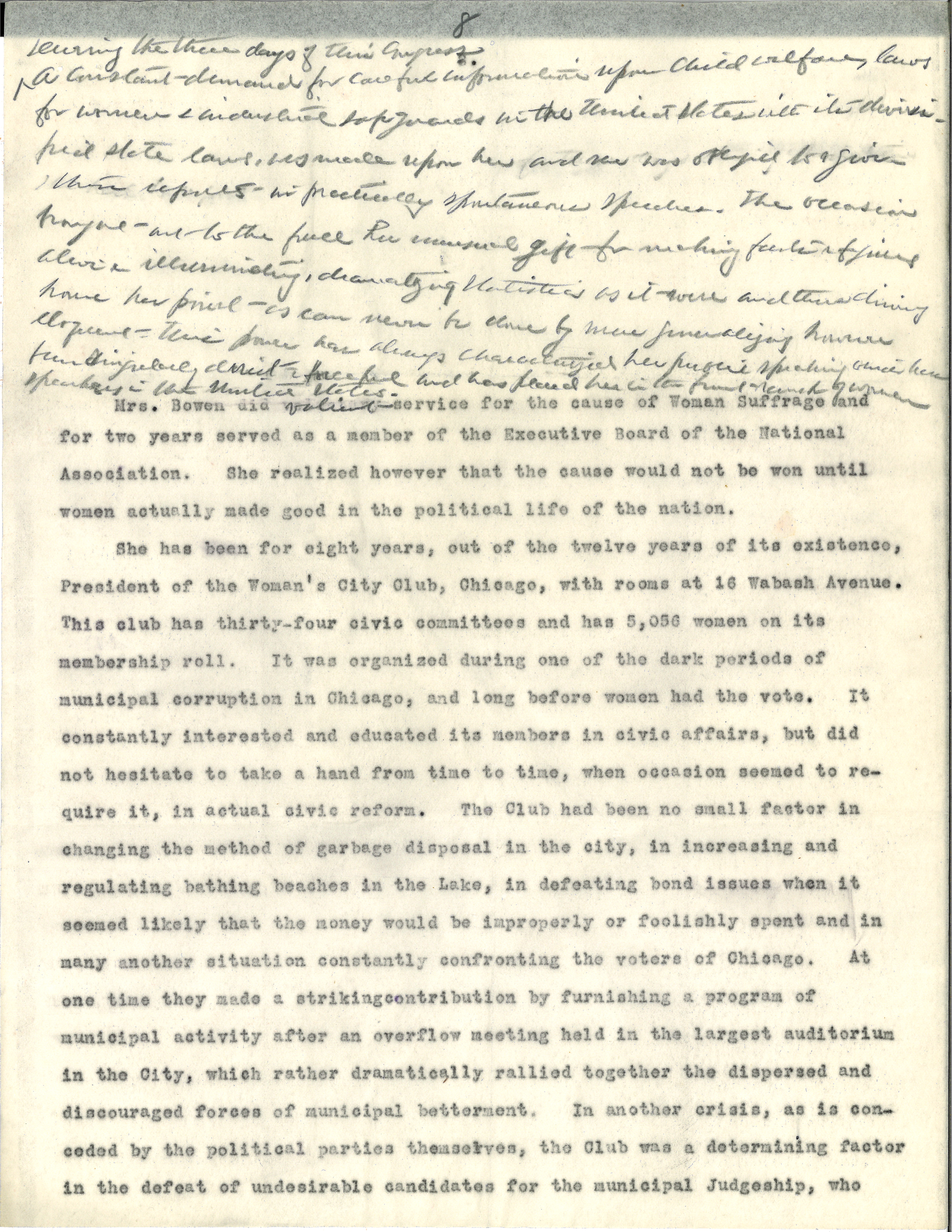 She has been for eight years, out of the twelve years of its existence, President of the Woman's City Club, Chicago, with rooms at 16 Wabash Avenue. This club has thirty-four civic committees and has 5,056 women on its membership roll. It was organized during one of the dark periods of municipal corruption in Chicago, and long before women had the vote. It constantly interested and educated its members in civic affairs, but did not hesitate to take a hand from time to time, when occasion seemed to require it, in actual civic reform. The Club had been no small factor in changing the method of garbage disposal in the city, in increasing and regulating bathing beaches in the Lake, in defeating bond issues when it seemed likely that the money would be improperly or foolishly spent and in many another situation constantly confronting the voters of Chicago. At one time they made a striking contribution by furnishing a program of municipal activity after an overflow meeting held in the largest auditorium in the City, which rather dramatically rallied together the dispersed and discouraged forces of municipal betterment. In another crisis, as is conceded by the political parties themselves, the Club was a determining factor in the defeat of undesirable candidates for municipal Judgeship, who [page 10] would certainly have placed the courts under political domination. To be President of such a Club requires both courage and unsleeping vigilance, and happily Mrs. Bowen possesses both qualities. She is ready to defend her position with her pen and by spoken word, and often her decision not only influences many club matters but also actual civic situations.