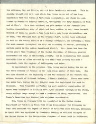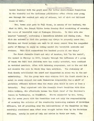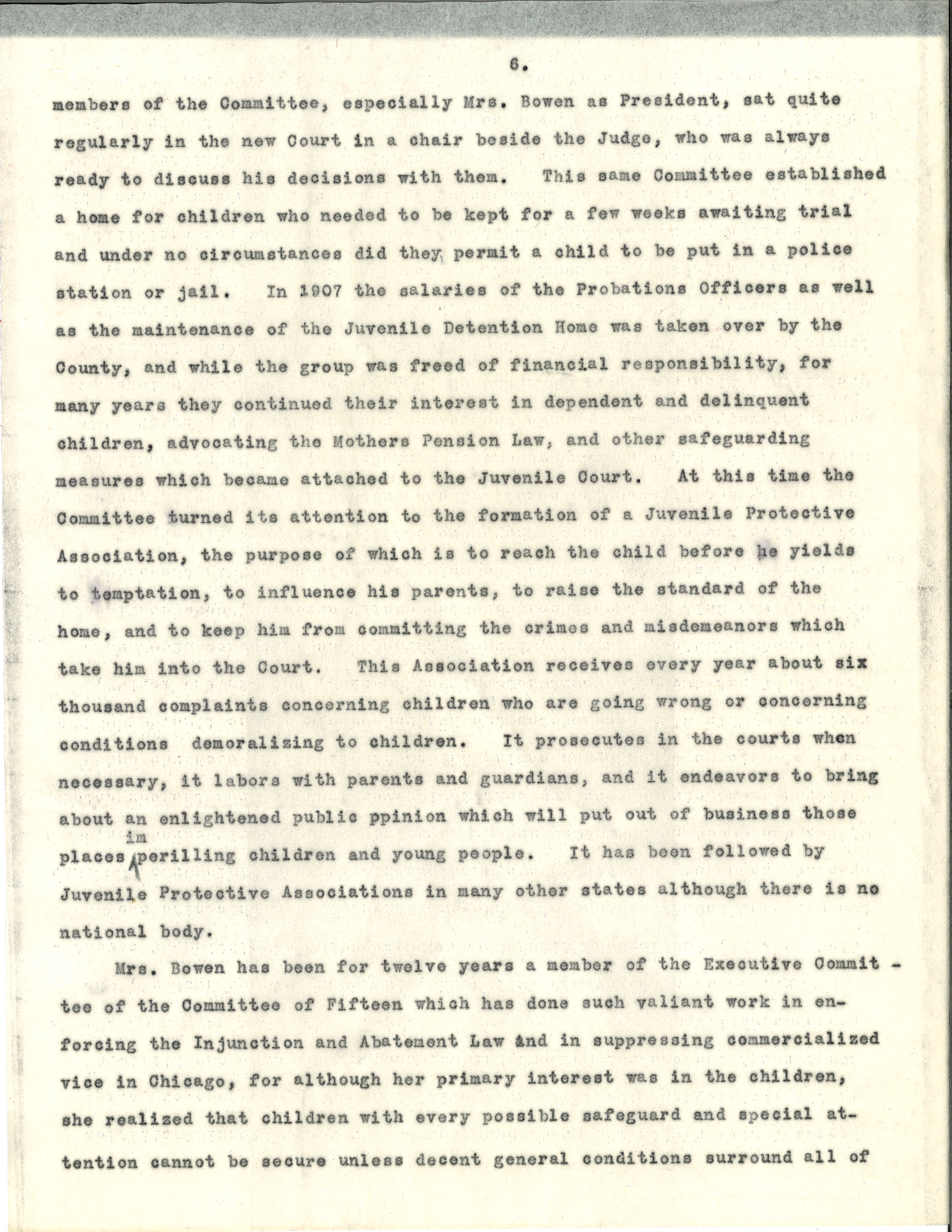 The first Juvenile Court not only of America, but "in the world," was opened in Chicago in 1899, largely through the influence of a group of women who felt that children were too easily arrested, were confined in wretched quarters, often with debasing companions, and in the end did not receive the care to which they were entitled. The Judiciary of Cook County established the court and cooperated in every way in the new undertaking. But the group were very anxious that the Court should be a model in every respect and made themselves responsible for a staff of probation officers without whom the whole plan would be more or less a travesty. They organized into the Juvenile Court Committee with Miss Julie Lathrop, who afterwards became the first Chief of the Children's Bureau in Washington, as President. She was succeeded by Mrs. Bowen, who for seven years with the Committee took not only the responsibility of securing the salaries of the constantly increasing numbers of Probation Officers, but of presiding over the deliberations of the Committee as they carefully considered case after case brought before them by the Probation Officers, sorely in need of help and advice in their new work. The [page 6] members of the Committee, especially Mrs. Bowen as President, sat quite regularly in the new Court in a chair beside the Judge, who was always ready to discuss his decisions with them. This same Committee established a home for children who needed to be kept for a few weeks awaiting trial and under no circumstances did they permit a child to be put in a police station or jail. In 1907 the salaries of the Probations Officers as well as the maintenance of the Juvenile Detention Home was taken over by the County, and while the group was freed of financial responsibility, for many years they continued their interest in dependent and delinquent children, advocating the Mothers Pension Law, and other safeguarding measures which became attached to the Juvenile Court. At this time the Committee turned its attention to the formation of a Juvenile Protective Association, the purpose of which is to reach the child before he yields to temptation, to influence his parents, to raise the standard of the home, and to keep him from committing the crimes and misdemeanors which take him into Court. This Association receives every year about six thousand complaints concerning children who are going wrong or concerning conditions demoralizing to children. It prosecutes in the courts when necessary, it labors with parents and guardians, and it endeavors to bring about an enlightened public [opinion] which will put out of business those place [imperiling] children and young people. It has been followed by Juvenile Protective Associations in many other states although there is no national body.