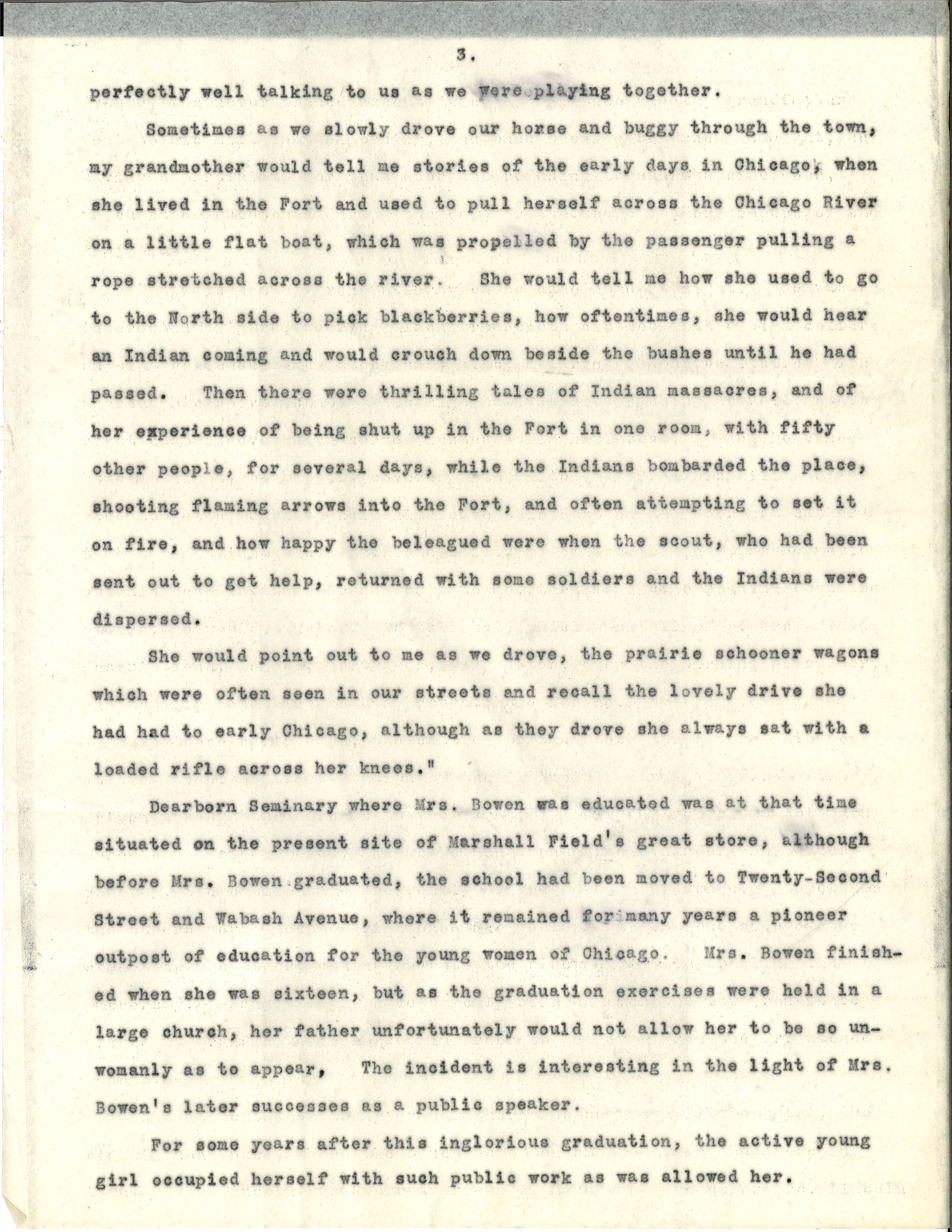 Sometimes as we slowly drove our horse and buggy through the town, my grandmother would tell me stories of early days in Chicago, when she lived in the Fort and used to pull herself across the Chicago River on a little flat boat, which was propelled by the passenger pulling a rope stretched across the river. She would tell me how she used to go to the North side to pick blackberries, how oftentimes, she would hear an Indian coming and would crouch down beside the bushes until he had passed. Then there were thrilling tales of Indian massacres, and of her experience of being shut up in the Fort in one room, with fifty other people, for several days, while the Indians bombarded the place, shooting flaming arrows into the Fort, and often attempting to set it on fire, and how happy the [beleaguered] were when the scout, who had been sent out to get help, returned with some soldiers and the Indians were dispersed.