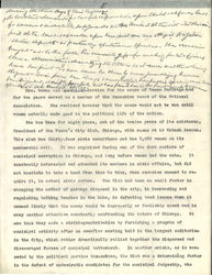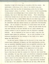 For some years after this inglorious graduation, the active young girl occupied herself with such public work as was allowed her. [page 4] Naturally it was to be found only in connection with the church. She established a bible class at St. James of one hundred young men. Chicago at that time was full of enterprising youths who had taken Horace Greeley's advice, to go West. They lived in rather uncomfortable boarding houses and although many of them evolved later into leading citizens, they were at that time rather forlorn. Their enterprising Bible Class teacher came to know them very well and finally established a Club House for them on Huron Street which was her first large public philanthropy. Her second venture was a kitchen garden association which she established with Miss Eleanor Ryerson and pushed with characteristic energy. She was married in June 1886, to Joseph Tilton Bowen who had come to Chicago from Providence, R.I. During the next decade she was very much absorbed in her four children and her public activity was largely confined to work in connection with the Children's Memorial Hospital. She was President of the Board and built a wing that the Hospital might extend its usefulness. She was also President of the Passevant Hospital and the Vice President of the Board of St. Luke's during this same period.