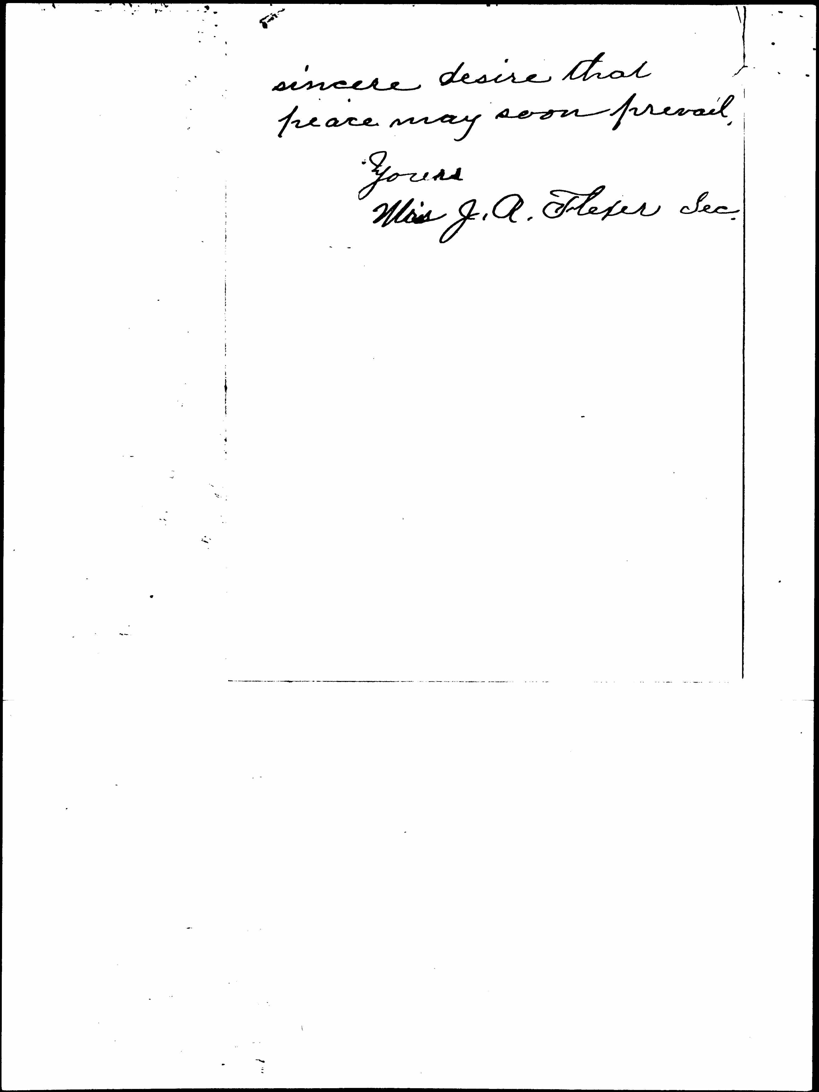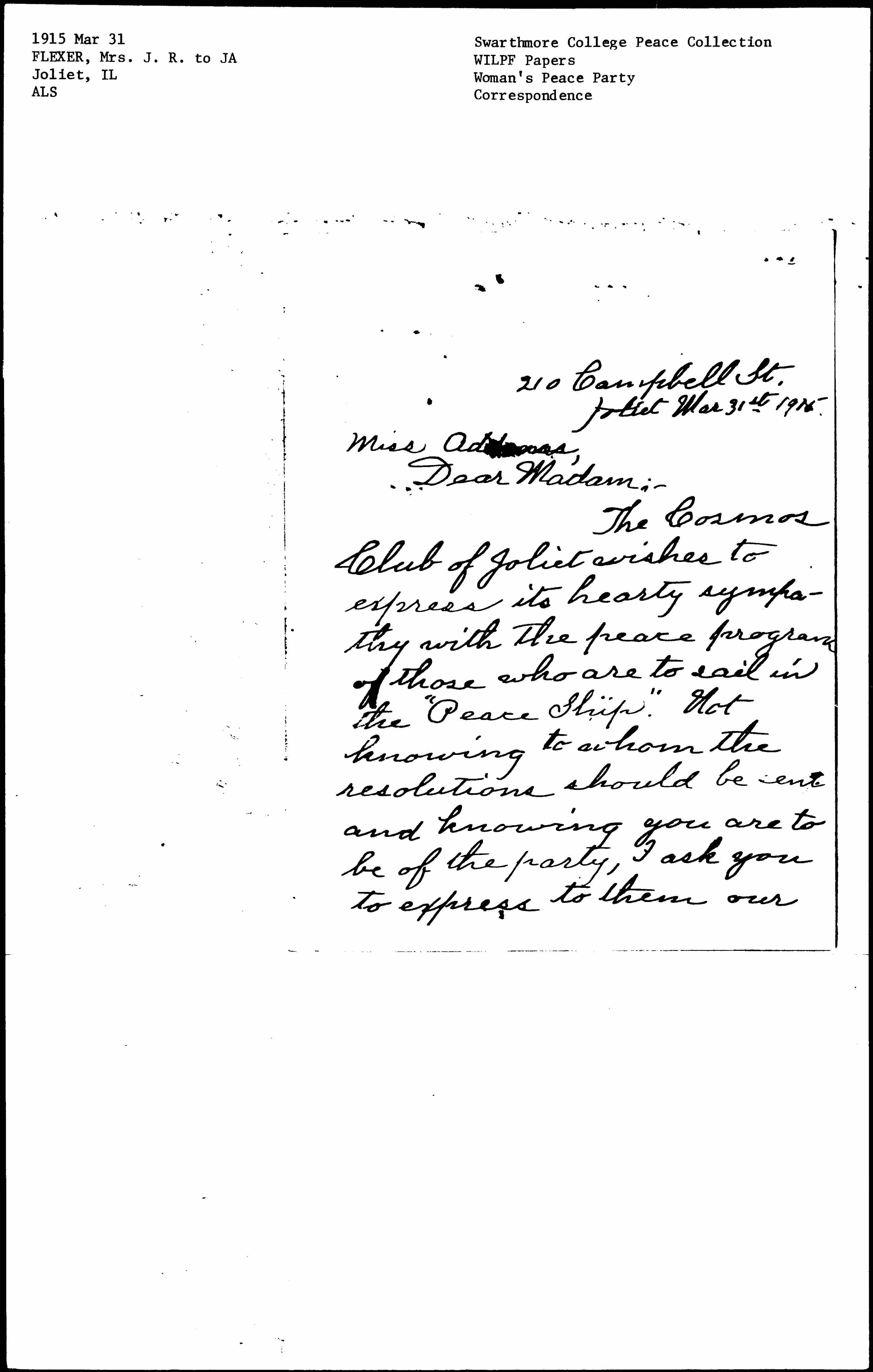 The Cosmos Club of Joliet wishes to express its hearty sympathy with the peace program of those who are to sail in the "Peace Ship." Not knowing to whom the resolutions should be sent and knowing you are to be of the party, I ask you to express to them our [page 2] sincere desire that peace may soon prevail.