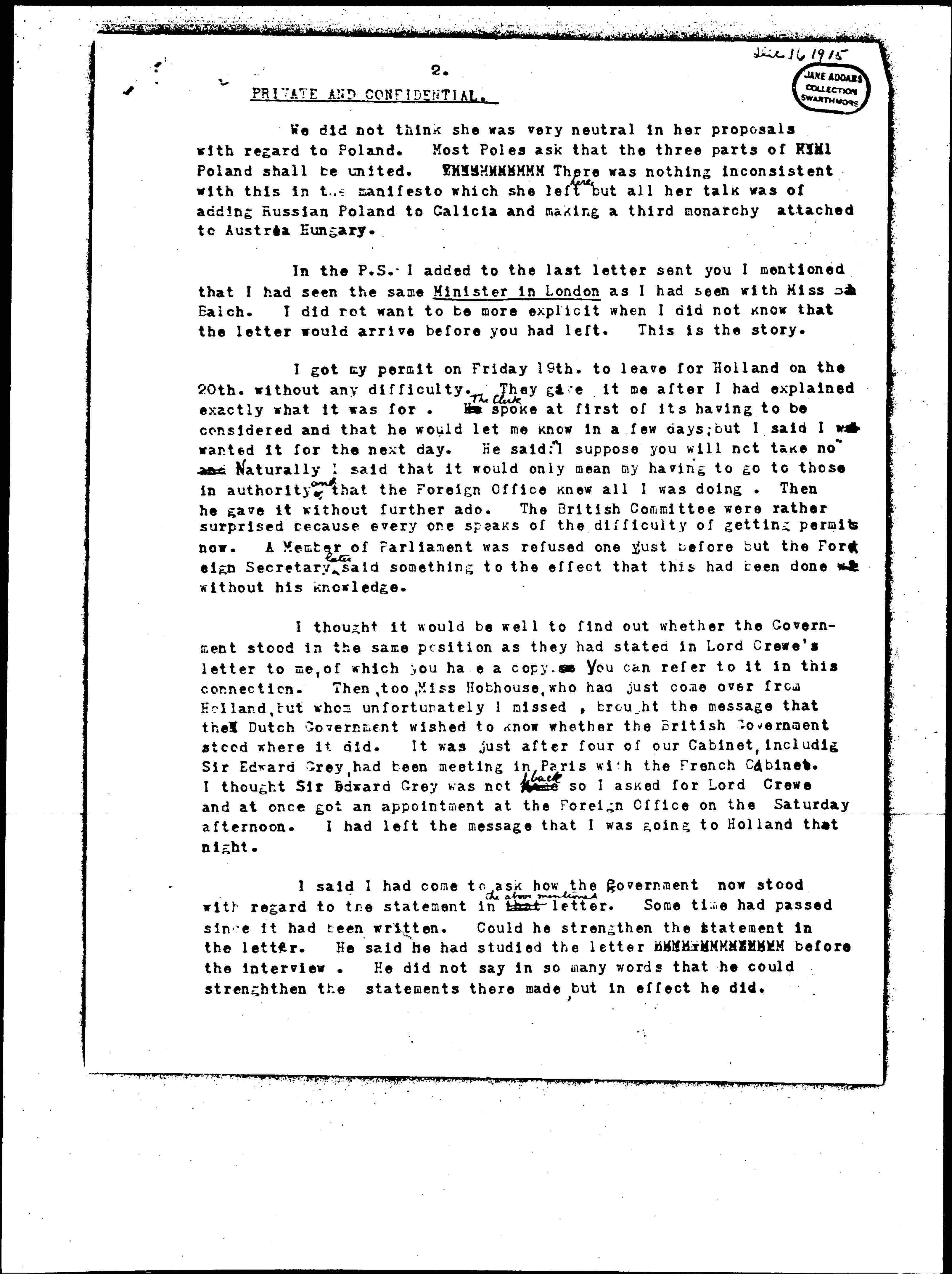 Dr. [Golińska], the Pole who was at the Congress, unfortunately turned up, <last week in Amsterdam> not knowing that the meeting had been postponed. She had got through with most of her papers but said that the one which was most likely to get her into trouble had been taken from her at the frontier. <She therefore returned by another route.> [page 2]