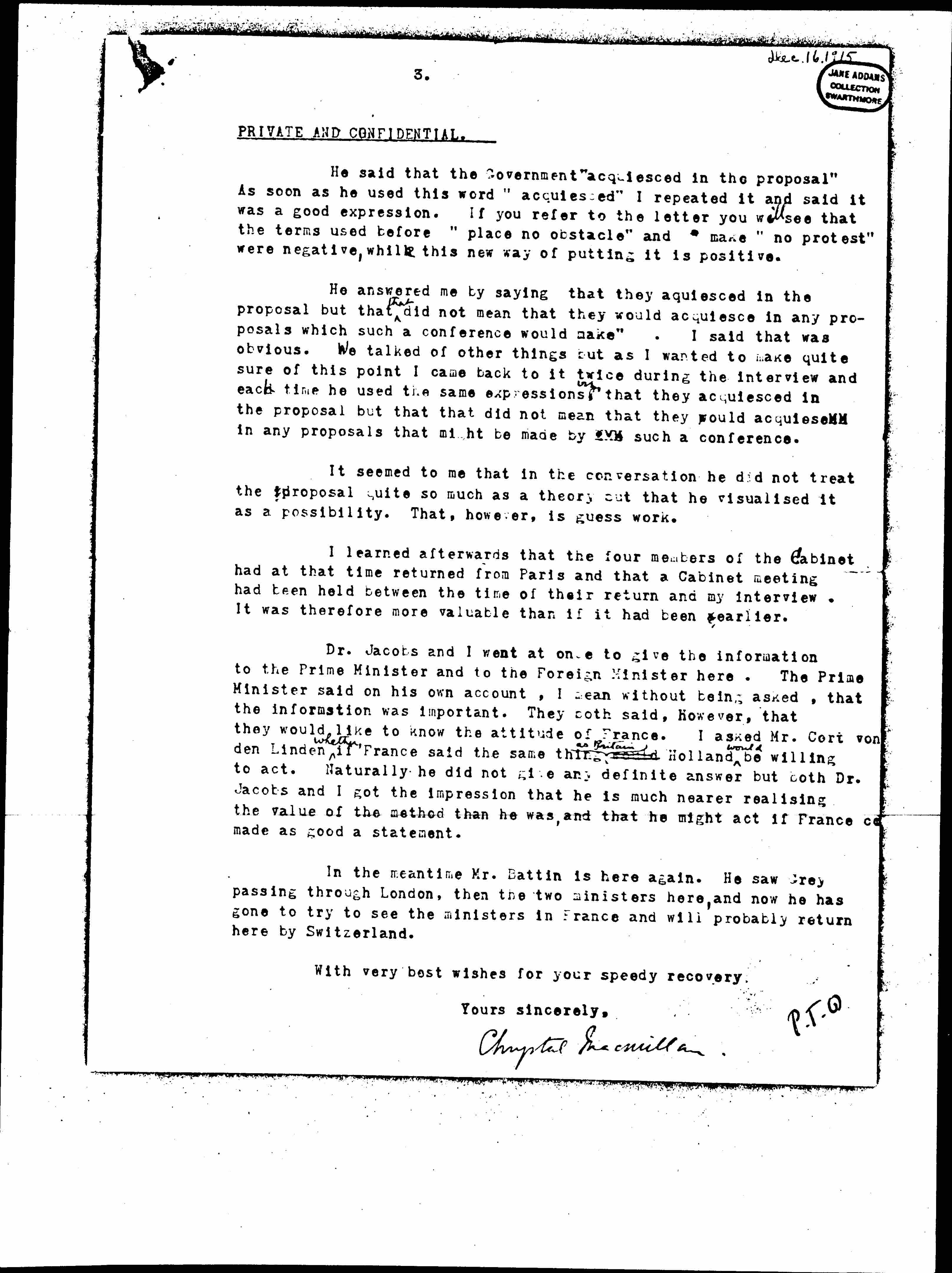 I said I had come to ask how the Government now stood with regard to the statement in that <the above mentioned> letter. Some time had passed since it had been written. Could he strengthen the statement in the letter. He said he had studied the letter [illegible] before the interview. He did not say in so many words that he could strengthen the statements there made, but in effect he did. [page 3]