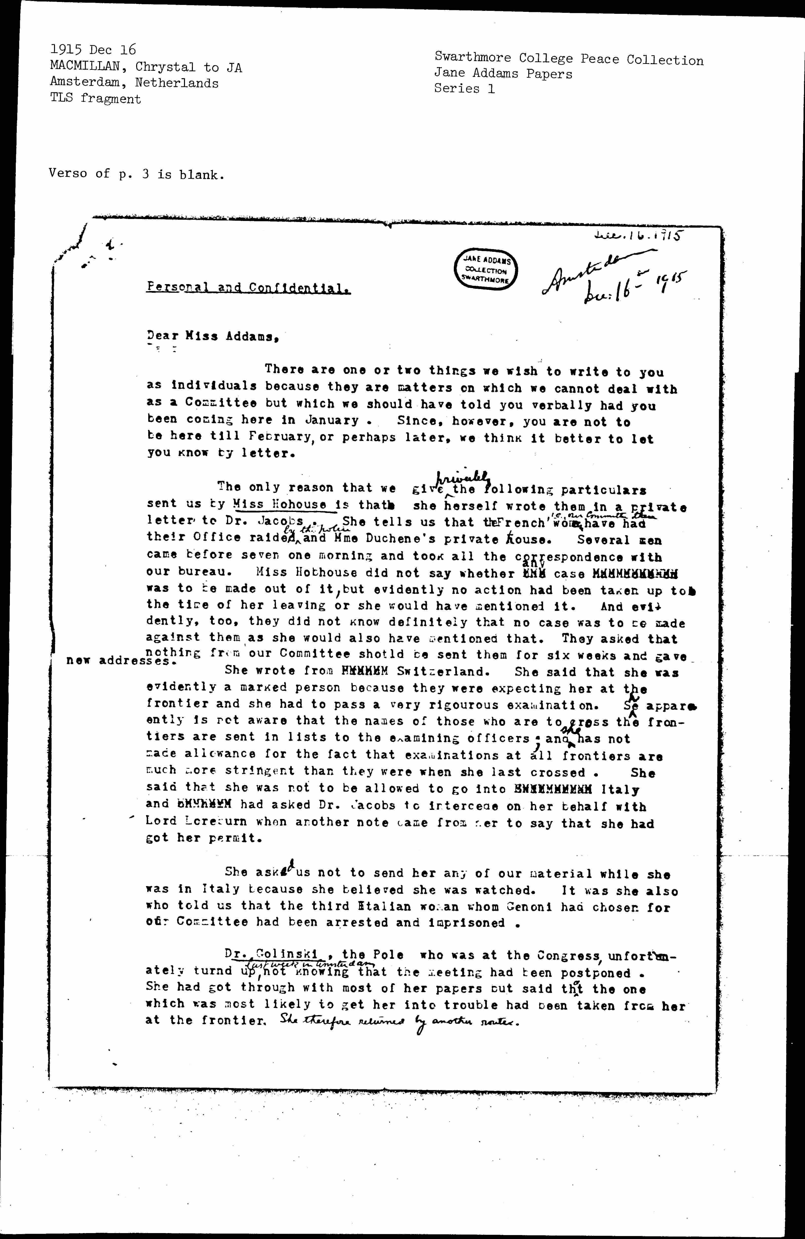 The only reason that we give <privately> the following particulars sent us by Miss [Hobhouse] is that she herself wrote them in a private letter to Dr. Jacobs. She tells us that the French women <i.e. our Committee there> have had their Office raided <by the police> and Mme Duchêne’s private house. Several men came before seven one morning and took all the correspondence with our bureau. Miss Hobhouse did not say whether [illegible] <any> case [illegible] was to be made out of it, but evidently no action had been taken up to the time of her leaving or she would have mentioned it. And evidently, too, they did not know definitely that no case was to be made against them as she would also have mentioned that. They asked that nothing from our Committee [should] be sent them for six weeks and gave new addresses.