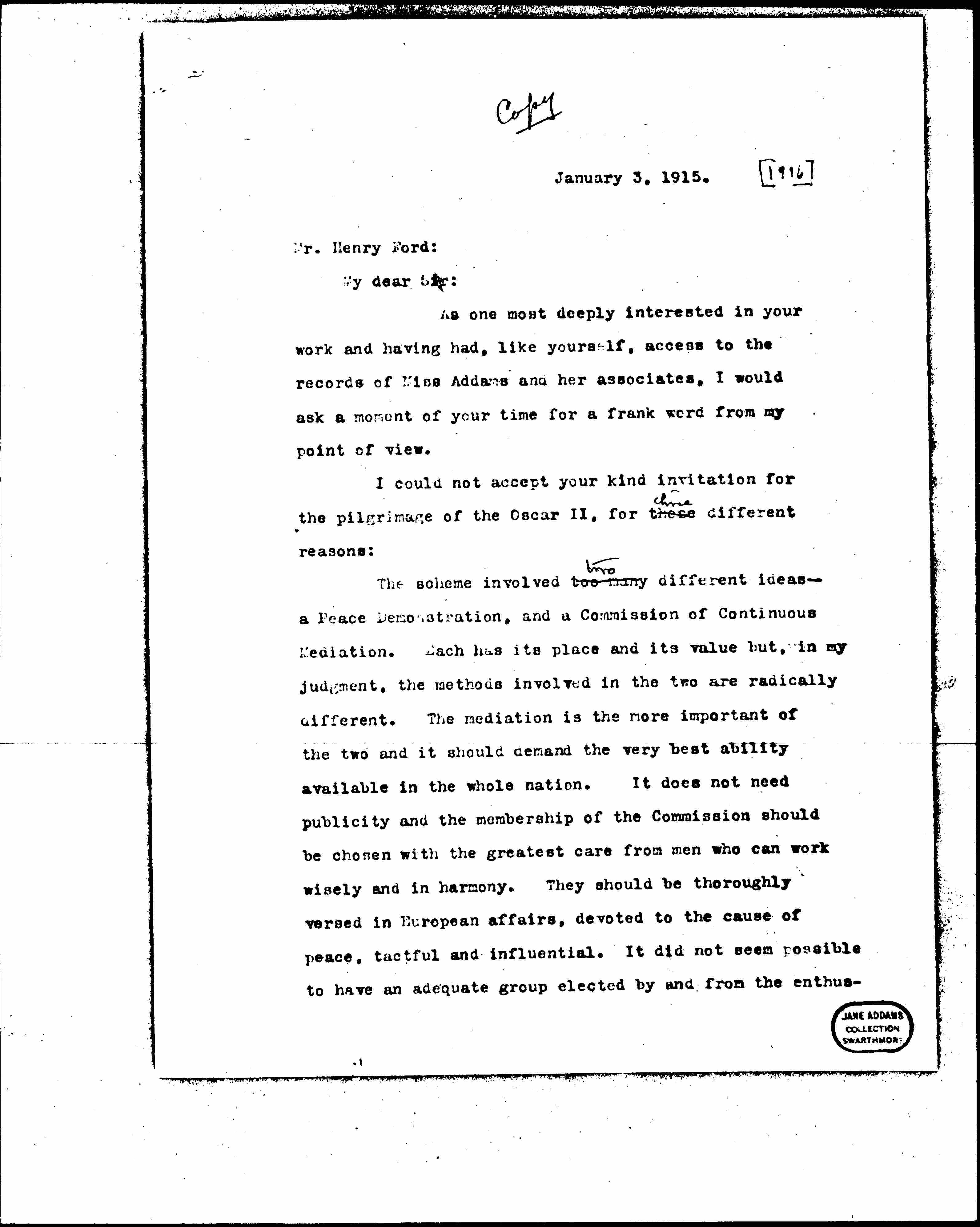 The scheme involved too many two different ideas -- a Peace Demonstration, and a Commission of Continuous Mediation. Each has its place and its value but, in my judgment, the methods involved in the two are radically different. The mediation is the more important of the two and it should demand the very best ability available in the whole nation. It does not need publicity and the membership of the Commission should be chosen with the greatest care from men who can work wisely and in harmony. They should be thoroughly versed in European affairs, devoted to the cause of peace, tactful and influential. It did not seem possible to have an adequate group elected by and from the enthusiasts [page 2] on the Oscar II. Except Mr. Lochner, there seems to be among them no man versed in European affairs or who commands a personal influence in any country of Europe. Mr. Lochner's ingenuity will make this good in part, but not wholly.