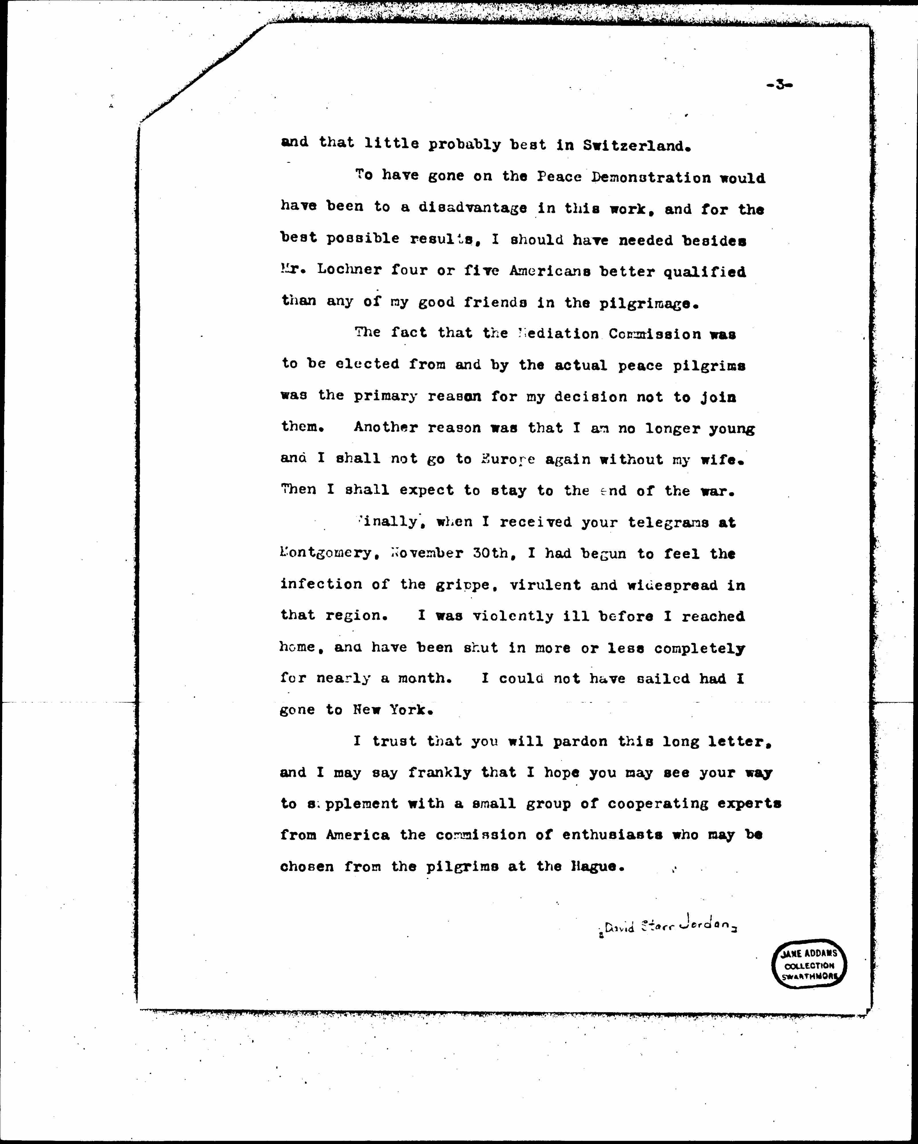 The fact that the Mediation Commission was to be elected from and by the actual peace pilgrims was the primary reason for my decision not to join them. Another reason was that I am no longer young and I shall not go to Europe again without my wife. Then I shall expect to stay to the end of the war.