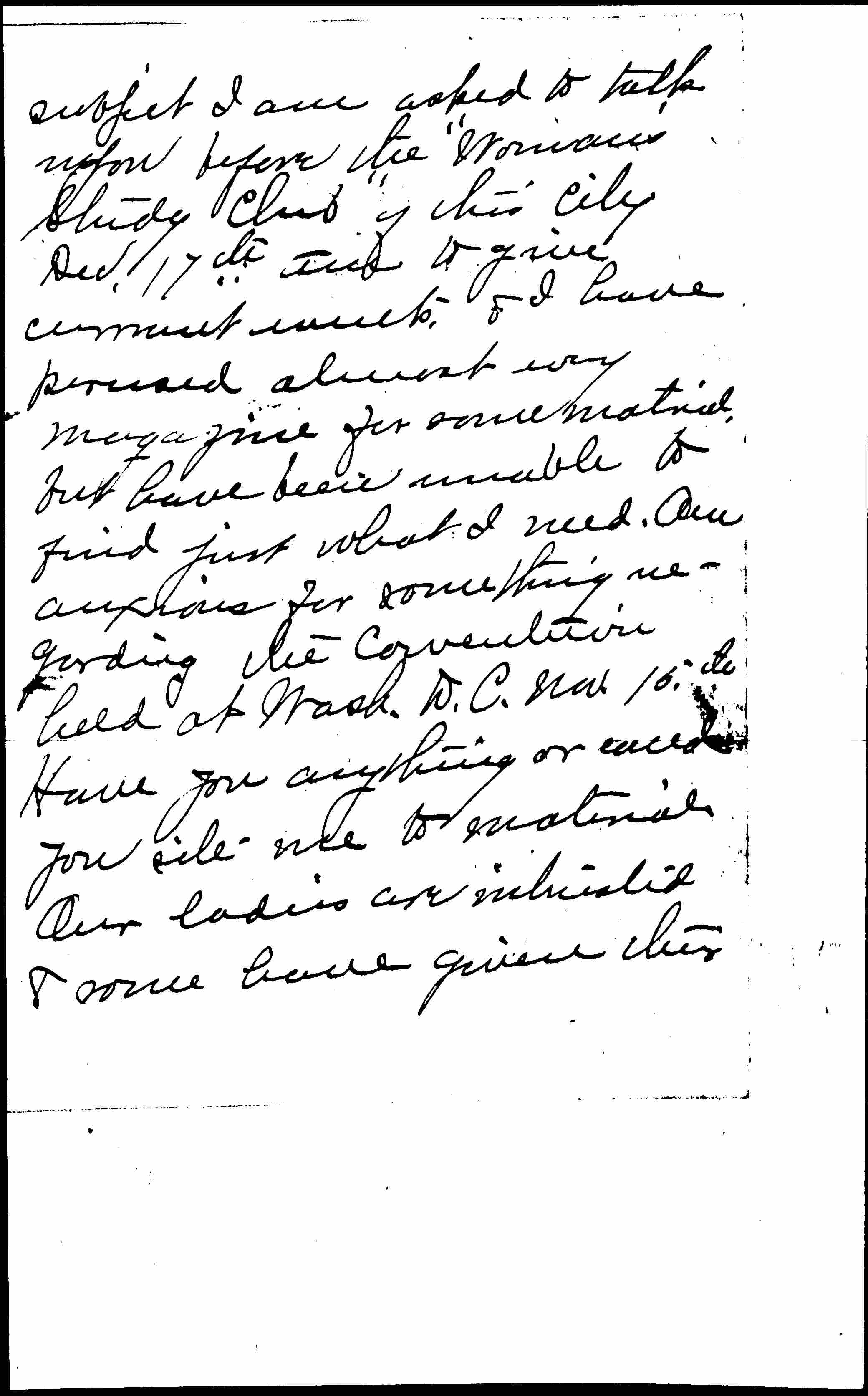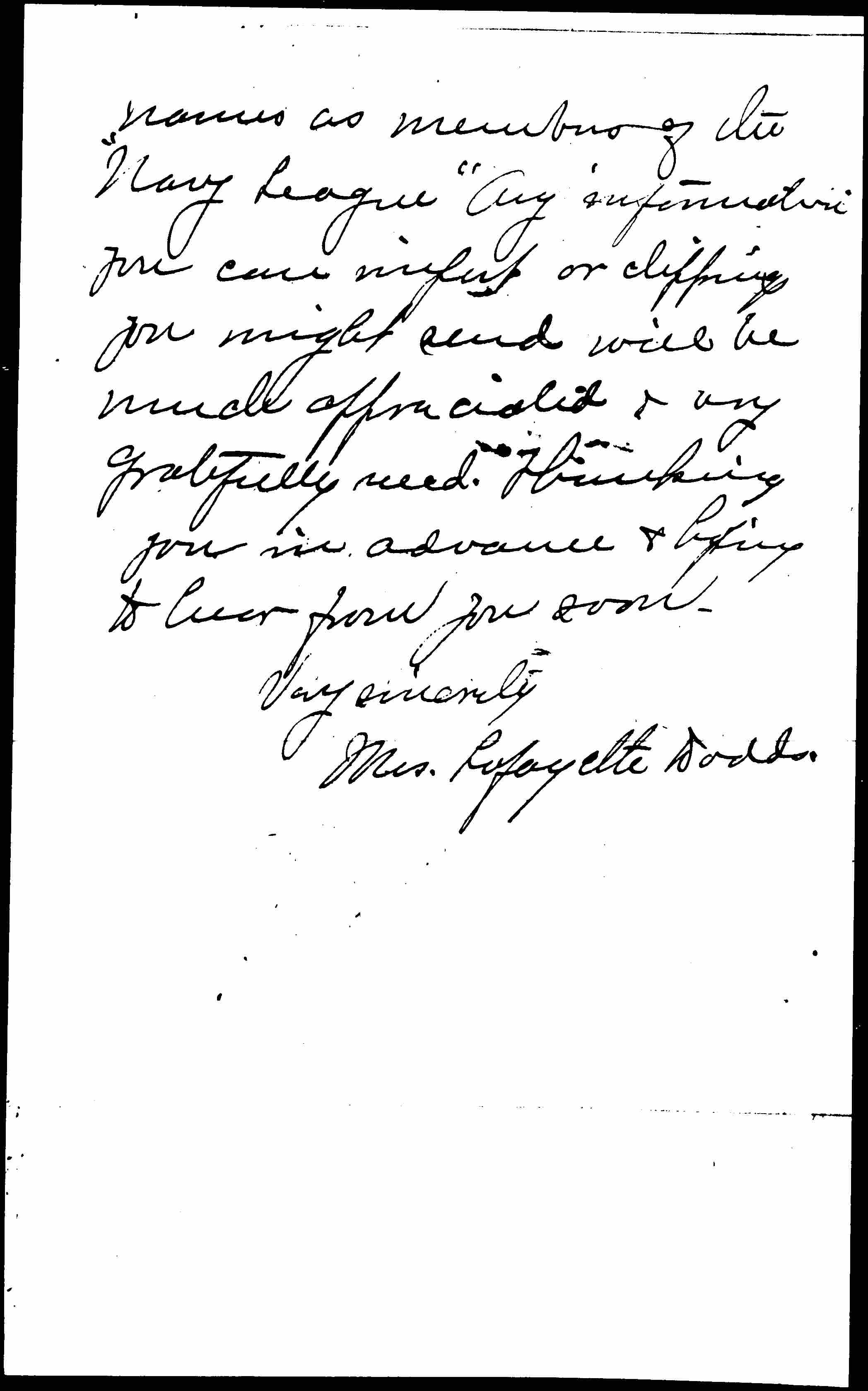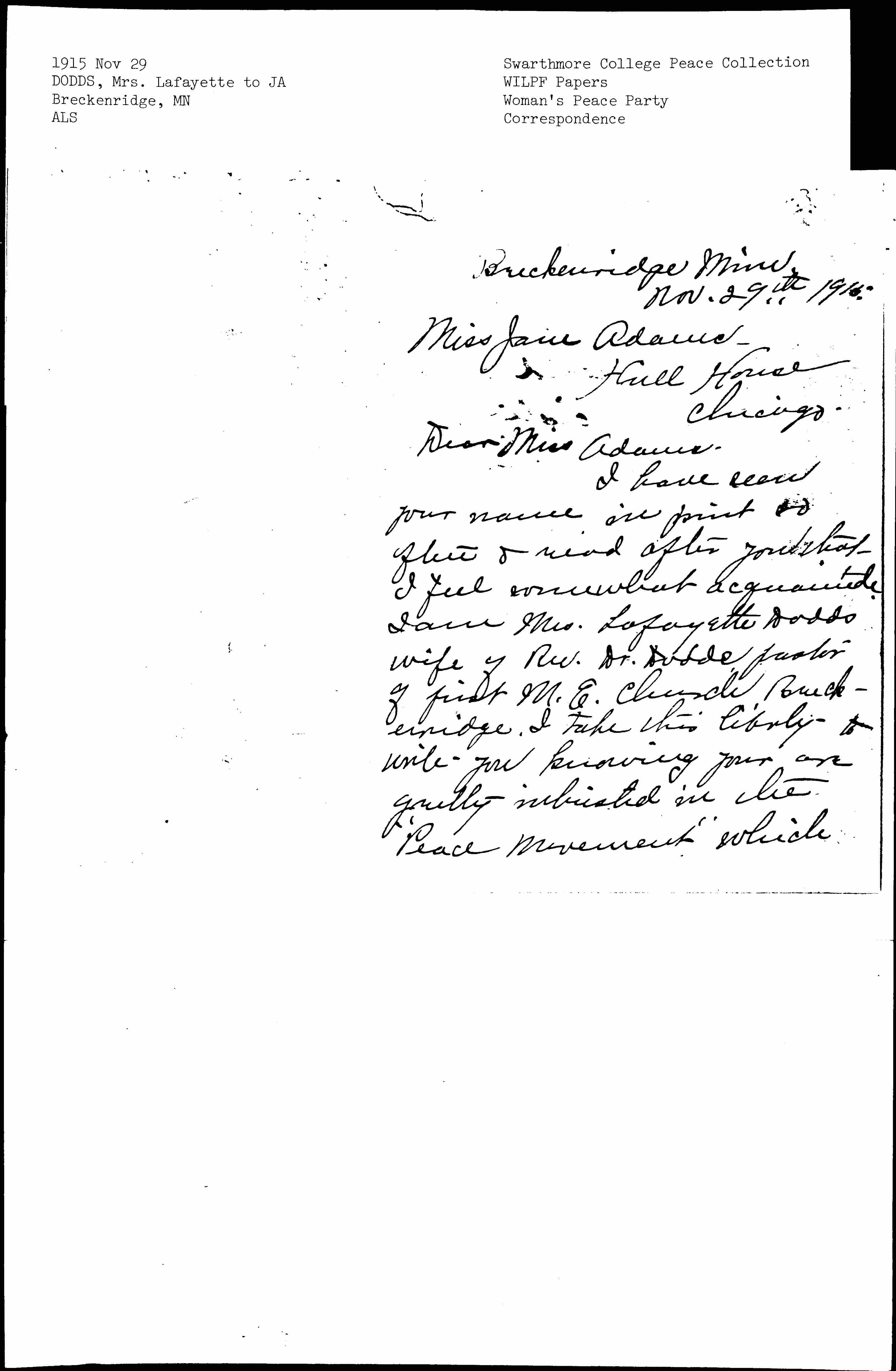 I have seen your name in print so often & [read] after you that I feel somewhat acquainted. I am Mrs. Lafayette Dodds wife of Rev. Dr. Dodds, pastor of first M. E. Church, Breckenridge. I take this liberty to write you knowing you are greatly interested in the "Peace Movement" which [page 2] subject I am asked to talk upon before the "Woman's Study Club" of this city Dec. 17th. [I'm] to give current events, & I have perused almost every magazine for some material, but have been unable to find just what I need. Am anxious for something regarding the Convention held at Wash. D.C. Nov. 15th. Have you anything or could you [site?] me to material. Our ladies are interested & some have given their [page 3] names as members of the "Navy League." Any information you can [impart] or clippings you might send will be much appreciated & very gratefully recd. Thanking you in advance & hoping to hear from you soon.