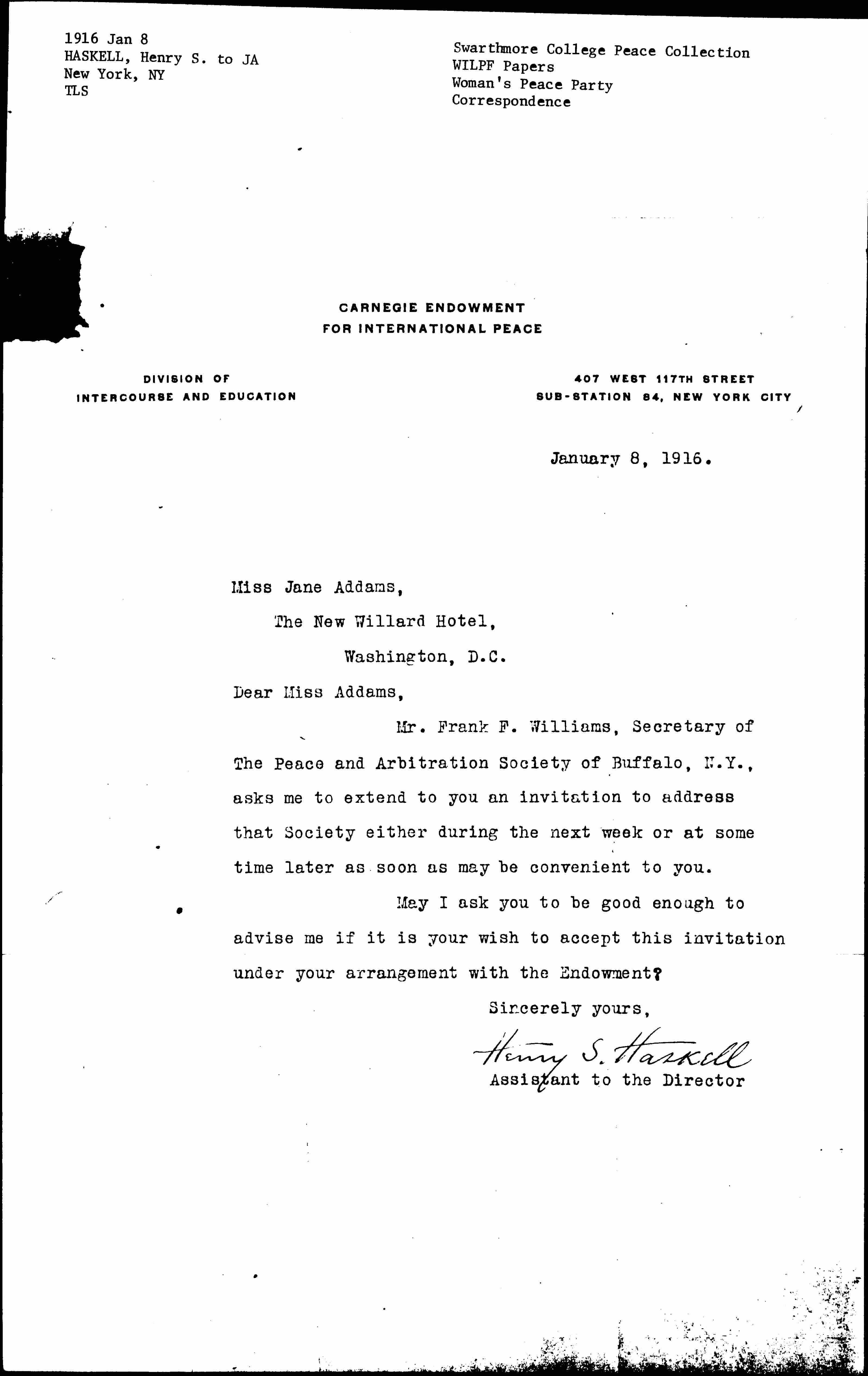 Mr. Frank F. Williams, Secretary of The Peace and Arbitration Society of Buffalo, N.Y., asks me to extend to you an invitation to address that Society either during the next week or at some time later as soon as may be convenient to you.