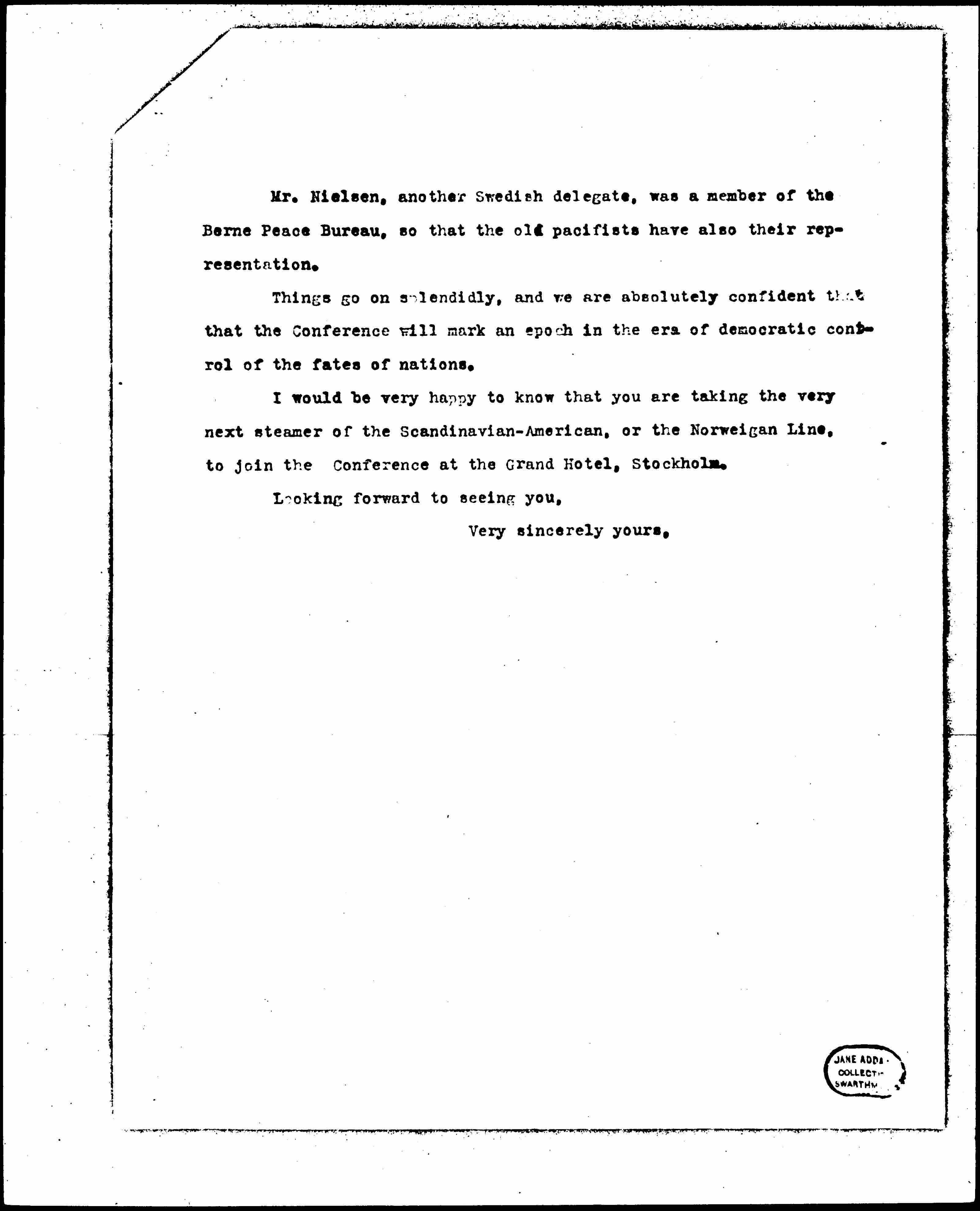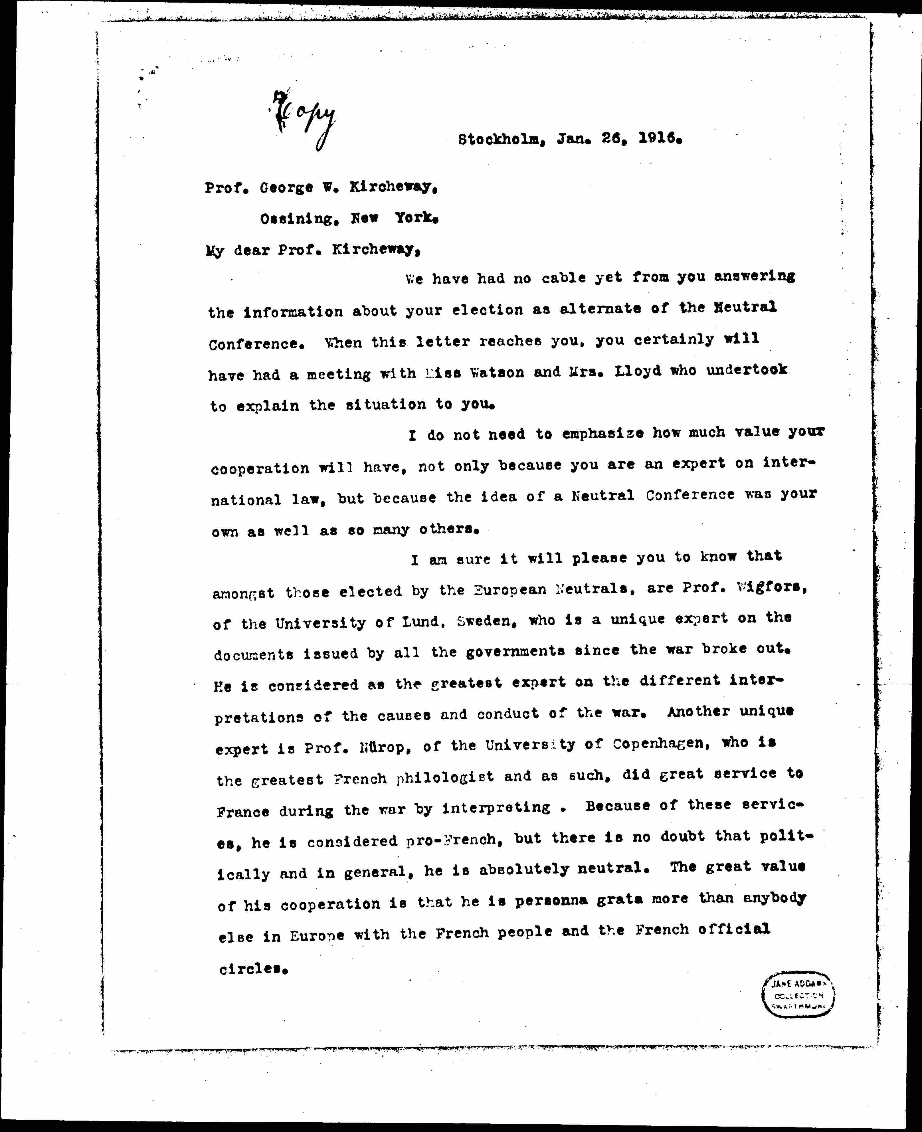 We have had no cable yet from you answering the information about your election as alternate of the Neutral Conference. When this letter reaches you, you certainly will have had a meeting with Miss Watson and Mrs. Lloyd who undertook to explain the situation to you.