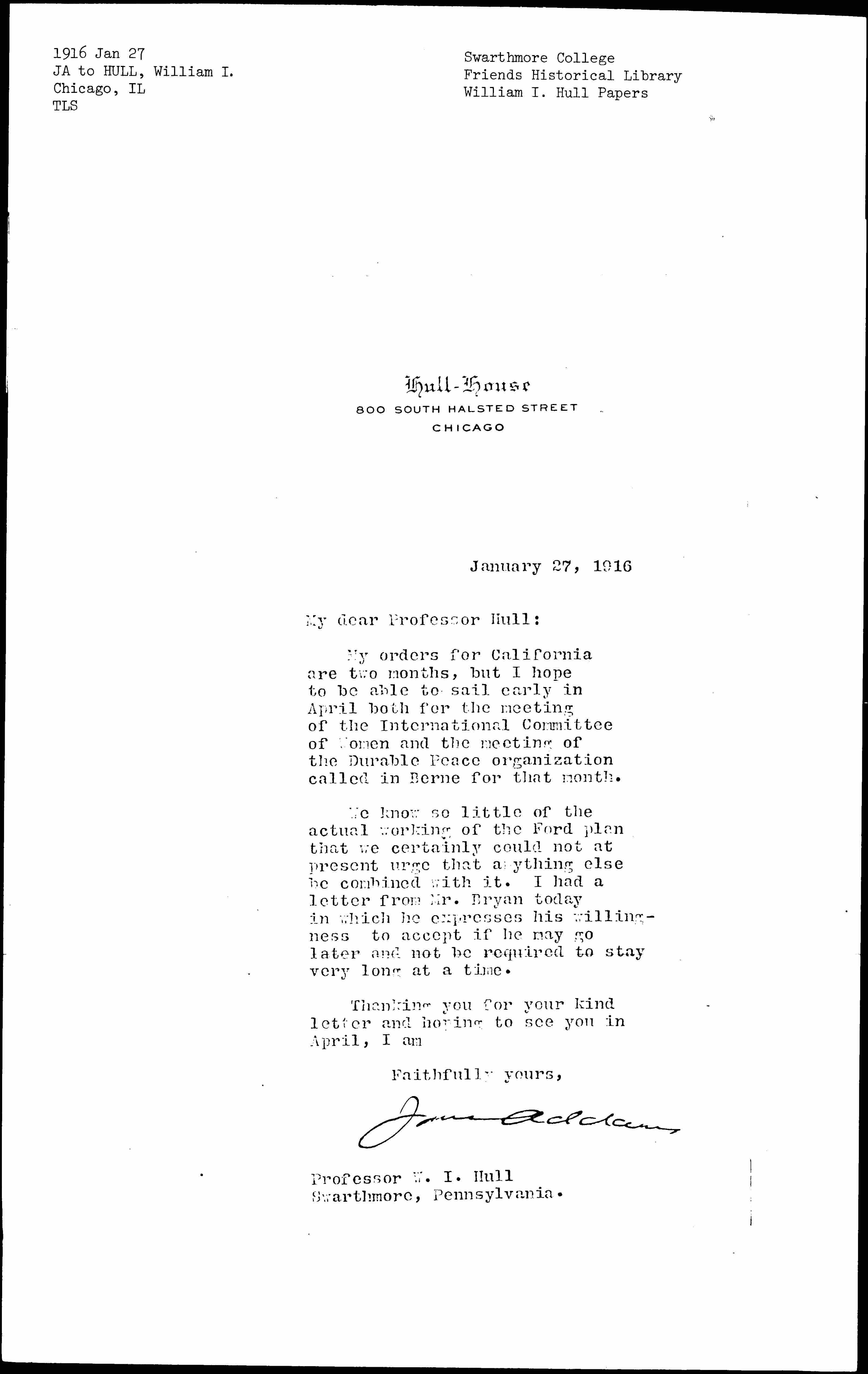 My orders for California are two months, but I hope to be able to sail early in April both for the meeting of the International Committee of Women and the meeting of the Durable Peace organization called in Berne for that month.